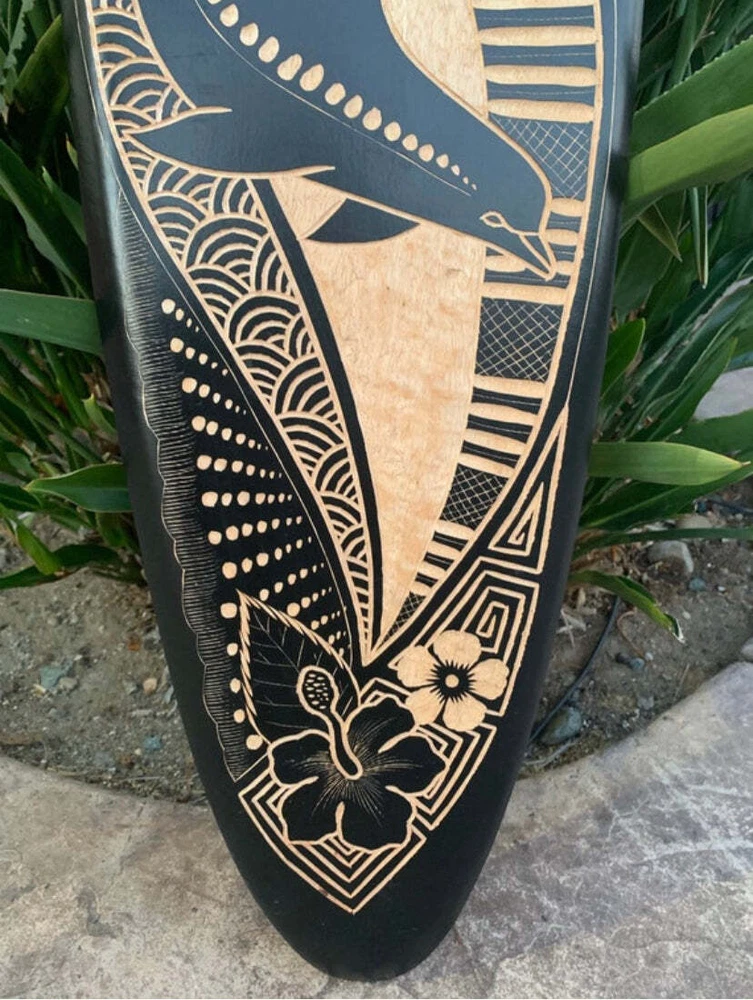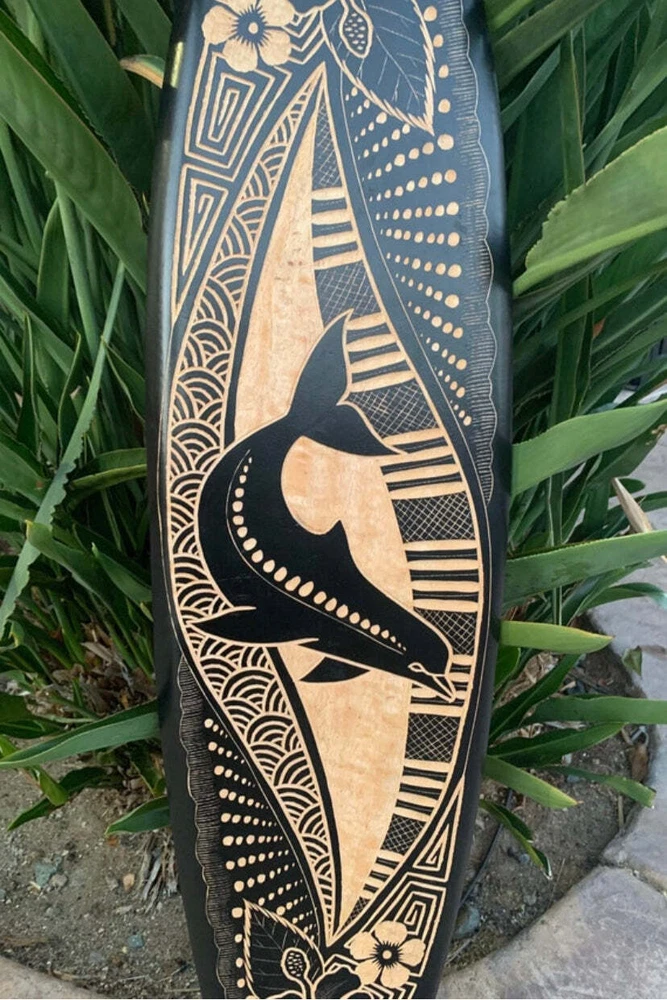 This beautiful hand crafted surfboard plaque is perfect for dolphin lovers. It would make a great addition to your home, patio, or tiki bar. It is hand carved from top-of-the-line mango wood, and has a flat back to hang on the wall. This surfboard would make an awesome gift! 39x 10 inches Will eventually start to fade if left out in the sun. We highly recommend an polyurethane gloss spray with UV protection for upkeep. Free shipping does not apply to Hawaii or Alaska. Please message me before the purchase, we will be willing the split the charges.