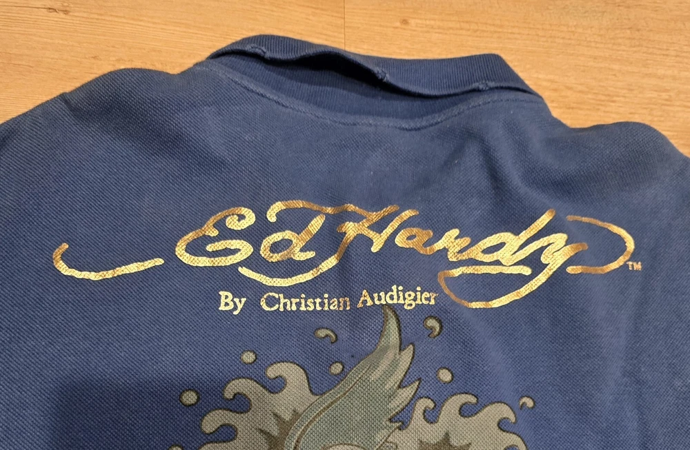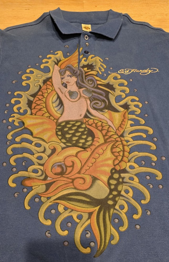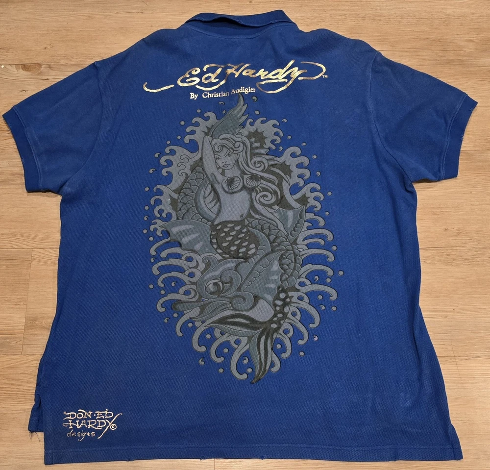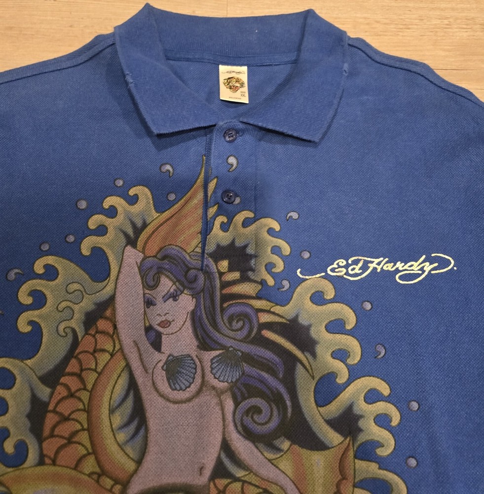 Don Ed Hardy Christian Audigier Men's XXL Blue Polo Shirt 3 Button Collar ... Used condition... Has a weathered look with edges cut out to look worn. That is how it came. See photos This is a men's 2XL blue polo shirt by Don Ed Hardy, featuring a graphic print with rhinestones of a mermaid, along with the brand's signature themes of love and skulls. The shirt has short sleeves, a collared neckline with a cutaway style, and a pullover closure. Made of 100% cotton knit fabric with a dark wash, this regular fit polo also includes rhinestone accents and is part of the Don Ed Hardy product line. * I will combine & discount shipping & handling rates for multiple items won… I will charge the lowest possible shipping Rate!!!! * This is a must have for anyone. Smoke free home. Low opening bid and no reserve. * Please take time to look at each picture. I try to describe the items in words as well as I can but pictures can often show things I cannot describe. For this reason, I consider my pictures to be part of my item description. If you have any questions, please feel free to contact me so that I can address any issue prior to a purchase. * International & Overseas welcome. * Please check out my other auctions and bid with confidence. * Please make payments within three days of winning bid. * Shipping is Same Day or Within 1 Business day of payment received. (Business Days are Monday thru Friday excluding Holidays) * If You Have Questions, Feel Free To Ask, And I Will Answer Them To The Best I Can! Please Don’t Wait Until The Last Minute Of The Auction