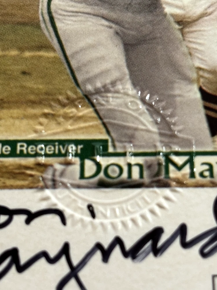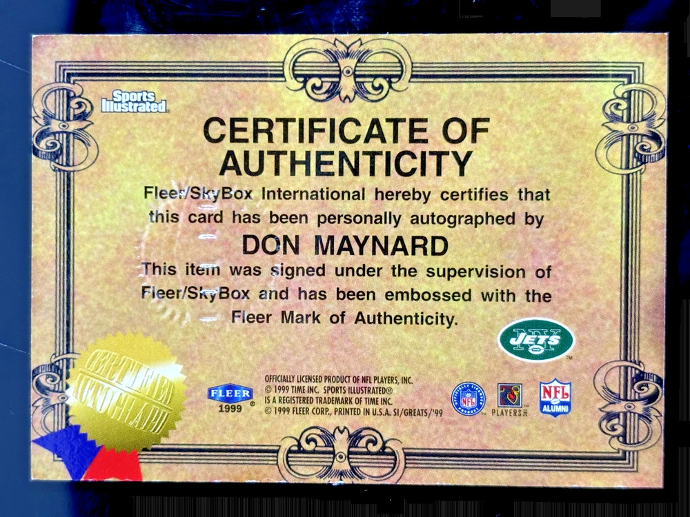 Team:New York JetsManufacturer:FleerSport:FootballSeason:1999Insert Set:AutographsAutograph Authentication:FleerYear Manufactured:1999Type:Sports Trading CardCard Name:DON MAYNARD AUTOGRAPHParallel/Variety:AutographsAutographed:YesSigned By:Don MaynardLeague:NFL, National Football League (NFL)Autograph Format:Hard SignedFeatures:Insert, Short PrintPlayer/Athlete:Don MaynardSet:1999 Fleer Greats of the Game