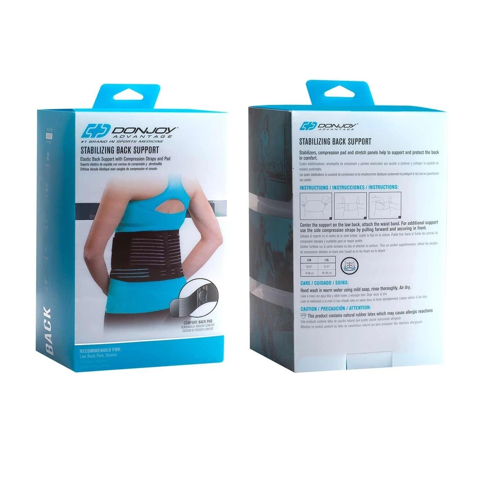 DonJoy DA161BW01-BLK-S, M Stabilizing Back Support for Low Back Pains, Strain, Comfortable Foam Padding with Stretch Fabric, Adjustable to fit Small to Medium, 29" to 37" Product Details Size: Small to Medium, 29" to 37" Brand: DonJoy MPN: DA161BW01-BLK-S, M UPC: 190446210153 EAN: 0190446210153 Package Dimensions : 9.29 x 5.2 x 4.09 inches; 11.2 ounces Item model number : DA161BW01-BLK-S, M Date First Available : July 8, 2017 Manufacturer : DJO Consumer LLC Country of Origin : China This back brace has posterior stays to provide back support, as well as foam back padding for long-lasting comfort Can wear during low-impact activities, walking, hiking, stationary cycling, golf, weight lifting Product type - stabilizing back support Don't let back pain stop you from moving. The DonJoy Advantage stabilizing back support is a low-profile back brace that relieves low-back pain or strains. Constructed with the dual stretch panels and elastic material, the stabilizing back support delivers compression to Soothe pain and the ability to move without constriction. This back brace has posterior stays to provide back support, as well as foam back padding for long-lasting comfort. Can wear during low-impact activities, walking, Hiking, stationary cycling, golf, weight lifting, and day-to-day activities. Manufacturer Contact Information