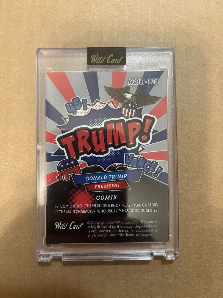 Franchise: US Presidents Character: Donald Trump Manufacturer: Wild Card Featured Person/Artist: Donald Trump Year Manufactured: 2024 Parallel/Variety: Commander In Chief Set: Election Type: Non-Sport Trading Card Autographed: No Graded: No Features: Serial Numbered, Short Print
