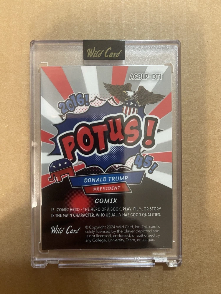 Year Manufactured: 2024 Character: Donald Trump Set: Election Autographed: No Parallel/Variety: Commander In Chief Featured Person/Artist: Donald Trump Manufacturer: Wild Card Graded: No Franchise: US Presidents Type: Non-Sport Trading Card Features: Serial Numbered, Short Print