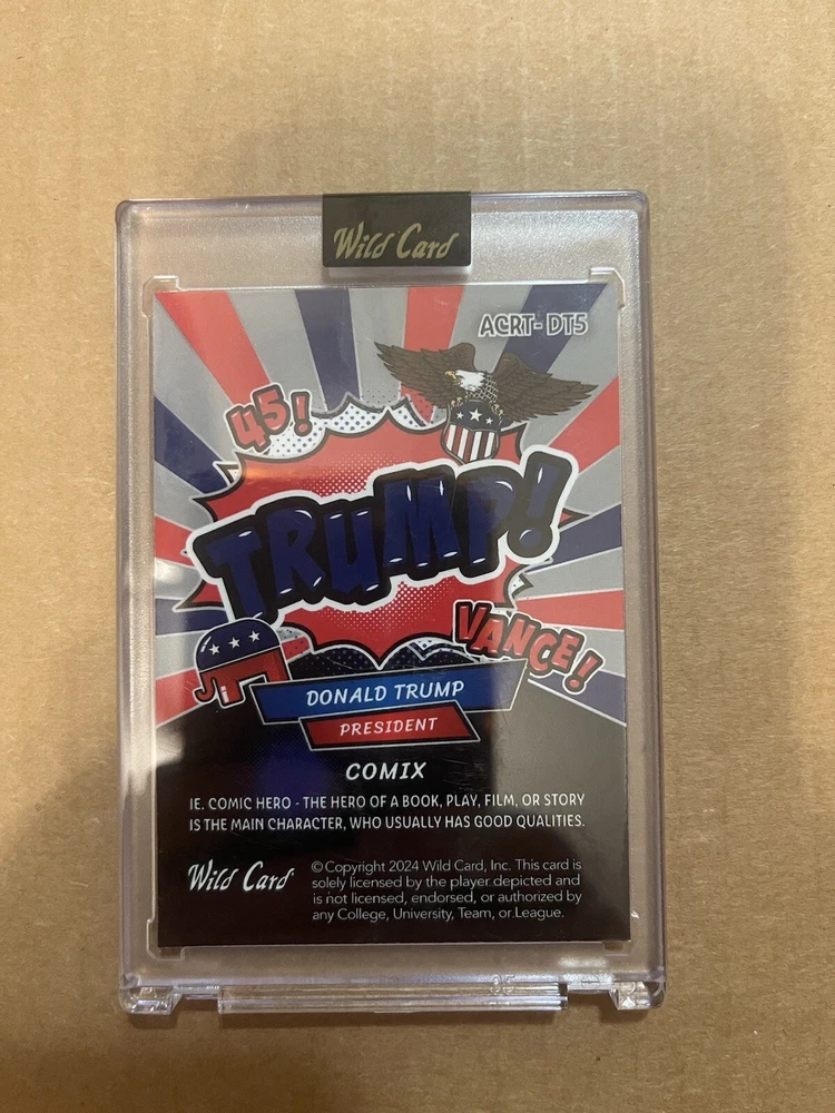 Type: Non-Sport Trading Card Character: Donald Trump Year Manufactured: 2024 Parallel/Variety: Commander In Chief Franchise: US Presidents Graded: No Set: Election Manufacturer: Wild Card Features: Serial Numbered, Short Print Autographed: No Featured Person/Artist: Donald Trump