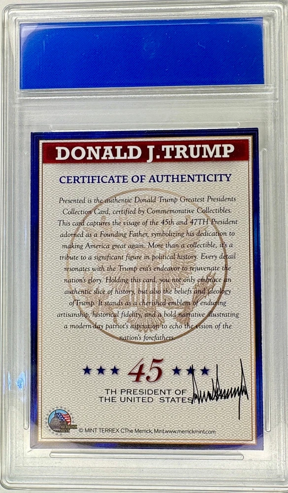 Donald Trump "Pledge to America" Historical Collectible Card – GEM-MT 10 Commemorate a defining era of American leadership with this stunning Donald J. Trump Collectible Card , graded GEM-MT 10 by WCG. This card celebrates the steadfast determination of the 45th and 47th President of the United States, Donald J. Trump, symbolizing his pledge to lead America to greatness with resilience and unwavering resolve. Card Highlights: Iconic Imagery: Featuring a bold portrait of Donald J. Trump in a solemn and determined pose, this card captures the essence of his promise to restore American values and greatness. Holographic Brilliance: Enhanced with a dazzling holographic design that makes this card a vibrant and visually striking collectible. Historic Significance: This card commemorates the defining events surrounding his leadership, with a focus on strength, determination, and his enduring legacy. Perfect Grading: Certified GEM-MT 10, ensuring flawless condition and exceptional value for collectors. Certificate of Authenticity: The reverse side of the card includes a Certificate of Authenticity , validating its role as part of the Merrick Mint's Greatest Presidents Collection. It emphasizes Trump’s dedication to preserving the ideals of the Founding Fathers and his efforts to "Make America Great Again." Why This Card Matters: Symbol of Leadership: This card embodies Trump’s commitment to the nation during one of its most transformative periods. Artistic and Historical Value: A combination of exquisite design and historical importance makes it a treasured keepsake. Rarity and Prestige: Limited production and a GEM-MT 10 grade ensure this card is both an investment and a piece of history. Perfect for Collectors and Patriots: Whether you are an avid collector, history enthusiast, or a proud supporter of President Trump’s vision, this card is an invaluable addition to your collection. It represents a pivotal chapter in America’s story and is a powerful testament to patriotism and leadership. Don’t miss the chance to own this remarkable Donald Trump "Pledge to America" collectible card—a timeless piece of history and inspiration. Order now!