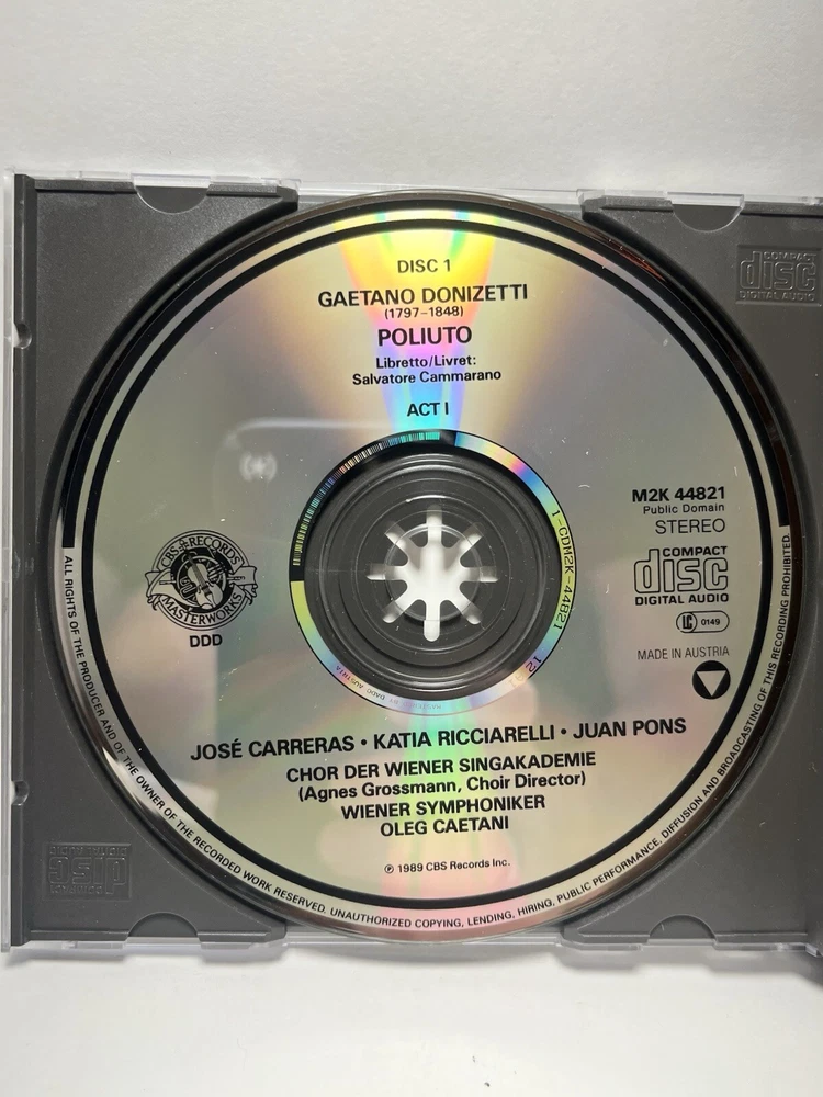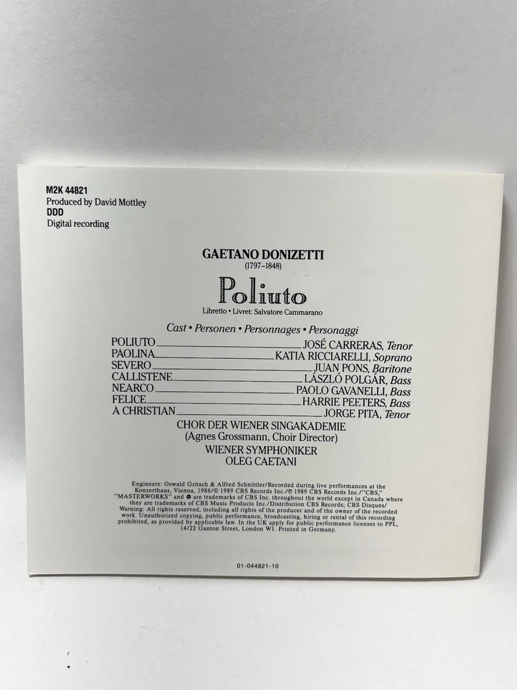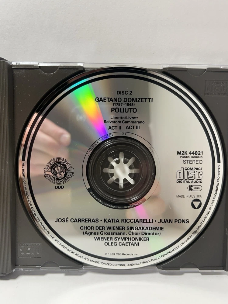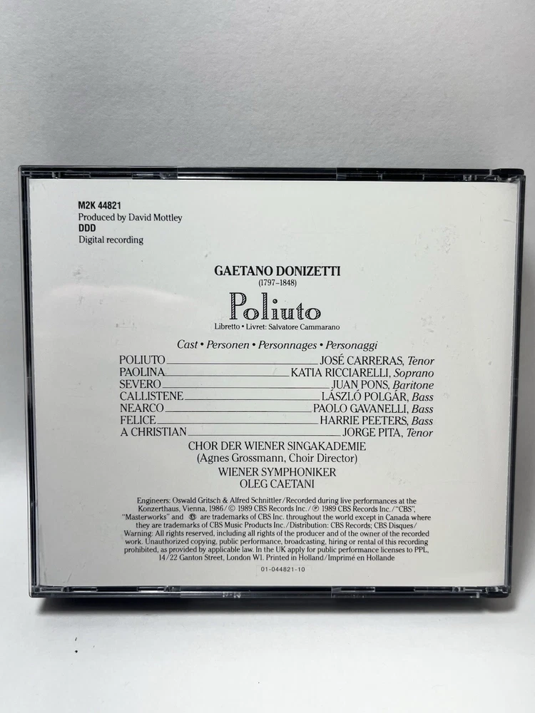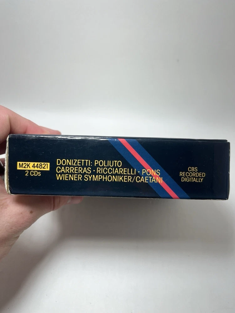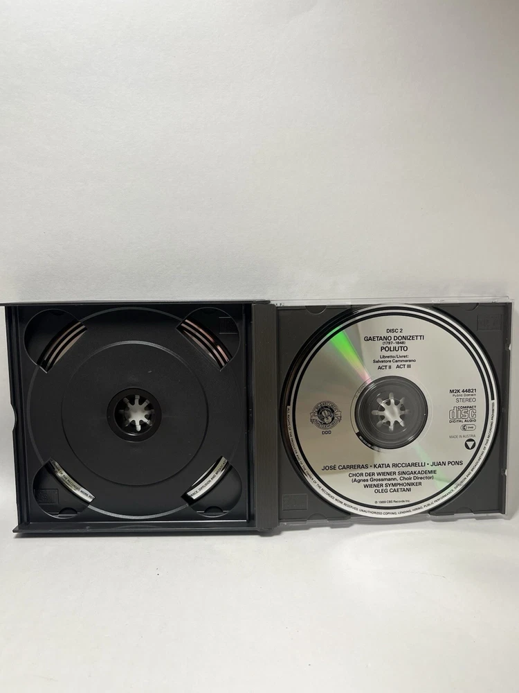 This is a listing for a Donizetti Poliuto Jose Carreras Katina Ricciarelli Juan Pons Oleg Caetani 2CD Set CBS. PLEASE SEE PHOTOS FOR THE PRODUCT YOU WILL RECEIVE! MORE PHOTOS ARE AVAILABLE UPON REQUEST! This set is in very good used condition. Overall, it has minimal signs of wear. The set includes the original box, inlay, and discs. The box has some small wear to the edges. The jewel case may have a few scratches and scuff marks to it, but the discs are in excellent used condition with no signs of any scratches. The inlay has no major signs of wear to it. PLEASE REACH OUT IF YOU HAVE ANY QUESTIONS OR OFFERS! If an item is purchased on business days between the hours of 12AM-10PM, the item will be in the mail shipped the following day.