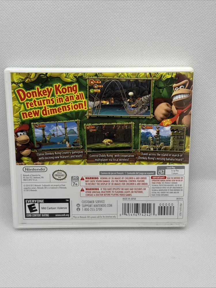 The product is Donkey Kong Country Returns 3D for the Nintendo 3DS, released in 2013 and published by Nintendo. This action and adventure game is rated E for Everyone, features the manual included, and is in NTSC-U/C (US/Canada) region. The game is set in the popular Donkey Kong universe and offers an engaging gameplay experience for fans of the franchise.