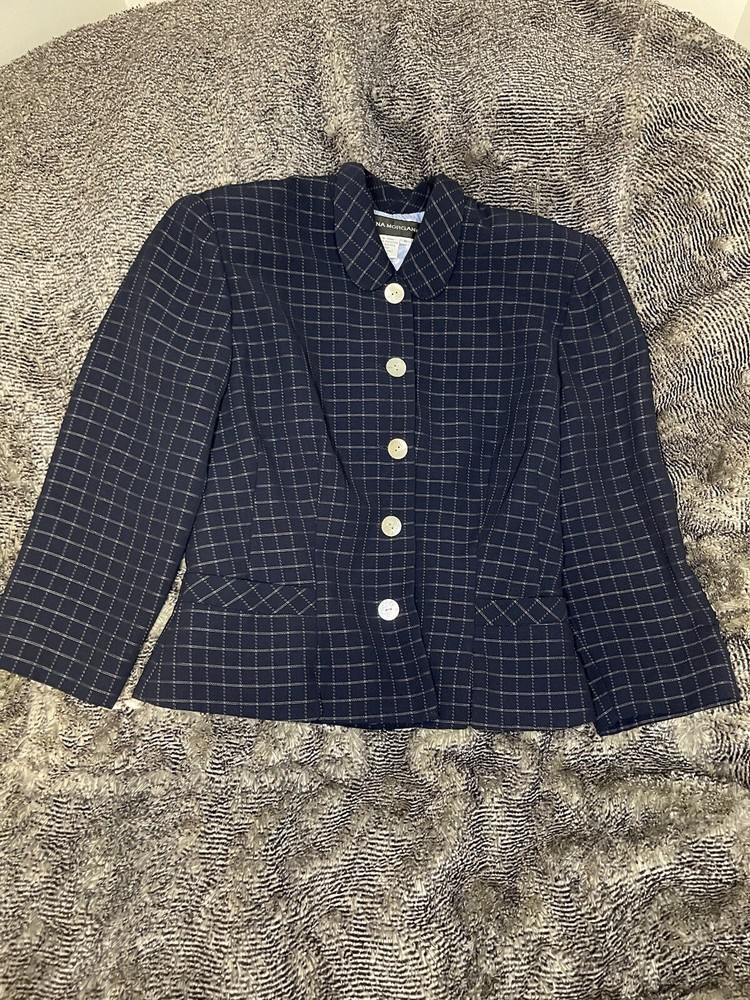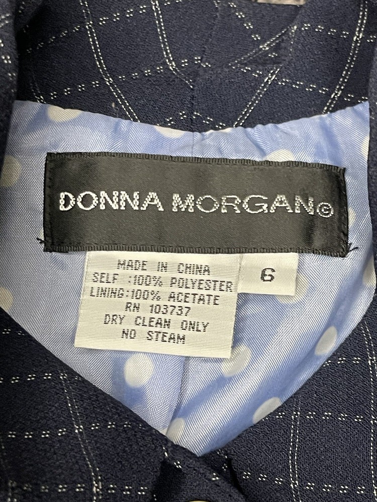 Elevate your style with this stunning Donna Morgan suit jacket in a beautiful blue and white plaid pattern. This versatile piece is perfect for any occasion, whether you're attending a wedding, a party, or a business meeting. The jacket features a notch lapel style, with no button on the sleeve, and a five-button front button style. Crafted from 100% polyester fabric, this suit jacket is full-lined with acetate material, providing a comfortable fit. It also has pockets for added convenience. The jacket is dry clean only and is suitable for all seasons. This suit jacket is perfect for women who want to look their best without compromising on comfort.