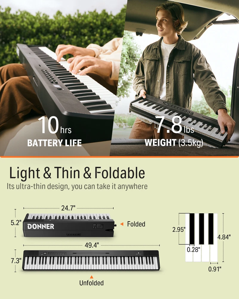Q&A Q: How long does it usually take to recharge? ▼ Q: How long does it usually take to recharge? ▼ Charging time is about 4H, please charge it more than 6H for the first time. The charging indicator is red and turms green when it is full. Please note that the EP-10 is not applicable to PD fast charging line. Q: What should you do if you find that the digital piano won't turn on? ▼ Q: What should you do if you find that the digital piano won't turn on? ▼ First of all, please check that the digital piano is charged, if it can't turn on after charging please contact Eastar for assistance. Q: Will it work with a phone and app like yousician piano? ▼ Q: Will it work with a phone and app like yousician piano? ▼ Yes, the product has Bluetooth MIDI function, which can be connected to a mobile phone and used together with an APP. 【 Ultra-Portable Design 】The DP-10 folding piano weighs only 8 pounds, so you can move it easily. At only 24.8 inches folded up, this piano is lightweight and portable, so it folds up for air travel, fits in the trunk, and is very convenient for everyday storage at home . You can take it anywhere you want at any time. 【 88 Key Full Size Semi Weighted Keyboard 】The digital piano with 88 standard size keys, providing you with a piano-like finger touch and key depth. The foldable piano also features intelligent strength sensing, with different strengths presenting different volumes, perfectly and truly reflecting the player's feelings. 【 Multi-Functional Electric Keyboard 】The portable piano has a clear LCD display, 128 tones and rhythms, and 21 demonstration tracks. It also includes dual keyboards, metronome, transpose, auto chord, intensity switch, sustain, tremolo, keyboard drums and other functions. It can perfectly meet the usual practice needs of beginners. 【 Multiple External Connections 】You can select the Bluetooth name of this piano in the MIDI setting interface of the external device or software compatible with this electronic piano to complete the connection. So that the beginner can learning piano by the teaching APP. You can connect many devices(Headphones, Pedal, Audio Devices, Computers, etc) to obtain a better training experience through various sockets(Headphone, AUX OUT, USB-MIDI) 【 Great for All Levels 】This digital piano is made of premium abs ensures reliable structure for prolonged use. Equipped with a perfect learning keyboard for teaching functions, it is suitable for adults, children, beginners and users of all levels. Q&A Q: How long does it usually take to recharge? ▼ Q: How long does it usually take to recharge? ▼ Charging time is about 4H, please charge it more than 6H for the first time. The charging indicator is red and turms green when it is full. Please note that the EP-10 is not applicable to PD fast charging line. Q: What should you do if you find that the digital piano won't turn on? ▼ Q: What should you do if you find that the digital piano won't turn on? ▼ First of all, please check that the digital piano is charged, if it can't turn on after charging please contact Eastar for assistance. Q: Will it work with a phone and app like yousician piano? ▼ Q: Will it work with a phone and app like yousician piano? ▼ Yes, the product has Bluetooth MIDI function, which can be connected to a mobile phone and used together with an APP. 【 Ultra-Portable Design 】The DP-10 folding piano weighs only 8 pounds, so you can move it easily. At only 24.8 inches folded up, this piano is lightweight and portable, so it folds up for air travel, fits in the trunk, and is very convenient for everyday storage at home . You can take it anywhere you want at any time. 【 88 Key Full Size Semi Weighted Keyboard 】The digital piano with 88 standard size keys, providing you with a piano-like finger touch and key depth. The foldable piano also features intelligent strength sensing, with different strengths presenting different volumes, perfectly and truly reflecting the player's feelings. 【 Multi-Functional Electric Keyboard 】The portable piano has a clear LCD display, 128 tones and rhythms, and 21 demonstration tracks. It also includes dual keyboards, metronome, transpose, auto chord, intensity switch, sustain, tremolo, keyboard drums and other functions. It can perfectly meet the usual practice needs of beginners. 【 Multiple External Connections 】You can select the Bluetooth name of this piano in the MIDI setting interface of the external device or software compatible with this electronic piano to complete the connection. So that the beginner can learning piano by the teaching APP. You can connect many devices(Headphones, Pedal, Audio Devices, Computers, etc) to obtain a better training experience through various sockets(Headphone, AUX OUT, USB-MIDI) 【 Great for All Levels 】This digital piano is made of premium abs ensures reliable structure for prolonged use. Equipped with a perfect learning keyboard for teaching functions, it is suitable for adults, children, beginners and users of all levels. On Oct 28, 2024 at 01:11:29 PDT, seller added the following information: