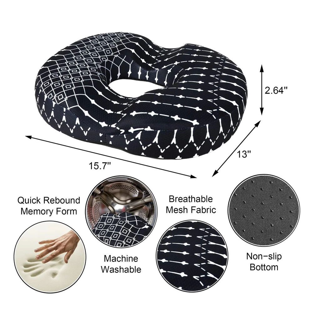 Donut Pillow for Hemorrhoids Seat Cushion for Tailbone Pain Relief - Black Boho Home Office Chair Cushion for Long Sitting Work - Memory Foam Car Seat Cushions for Driving Butt Pain Pressure Relief Seat Cushion for Tailbone Pain Relief: When you have a work long sitting, sedentary discomfort is a real issue, long sitting can lead to a variety of health problems, including tailbone pain, driving butt pain, lower back pain, tailbone pressure. Our Black Boho office chair cushion design distributes weight evenly, provides back support for chair, provides tailbone pressure relief and pain relief. Hemorrhoid Pillow for Pressure Relief: For person suffering from hemorrhoids, the pain and discomfort can make sitting for extended periods unbearable. Our Black Boho donut pillow for hemorrhoids provides the necessary support and comfort to relieve the pressure on sensitive areas, allowing you to sit without aggravating your hemorrhoids. Ergonomic Design: The Black Boho donut office chair seat cushion shape with ergonomic "U" shaped incisions, use to reduce hip pressure, effectively reduce tailbone pain, thereby reducing hemorrhoid pain, relieve the discomfort caused by long sitting. Tailbone cushions for pressure relief, donut pillow postpartum pregnancy, car seat cushions for driving butt pain, donut pillow for tailbone pain. High Quality Seat Cushion: The surface layer of Black Boho donut pillow is made of comfortable and breathable fabric, and the core is high-quality memory foam, which can make you more comfortable and will maintain shape even after many uses, making it a high quality office chair cushion product. Thoughtful Gifts for Birthday: Our donut pillow chair cushion is great gifts idea, if you give it as a gift to your family, friends, boss, coworkers, customers and colleagues, they will love it. Donut seat cushion is perfect for people with special needs after surgery, pregnant women, elderly, office workers. Donut cushion is perfect for birthday gifts for women, Mother's Day gifts for mom.