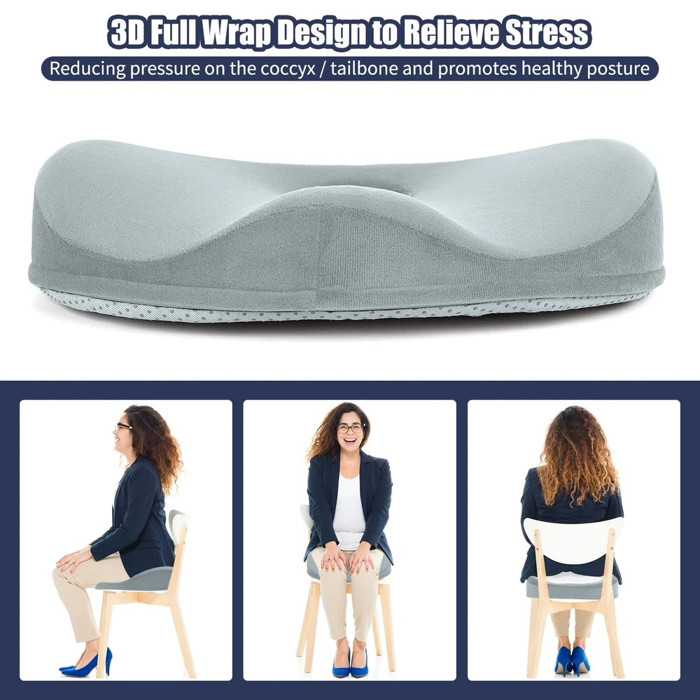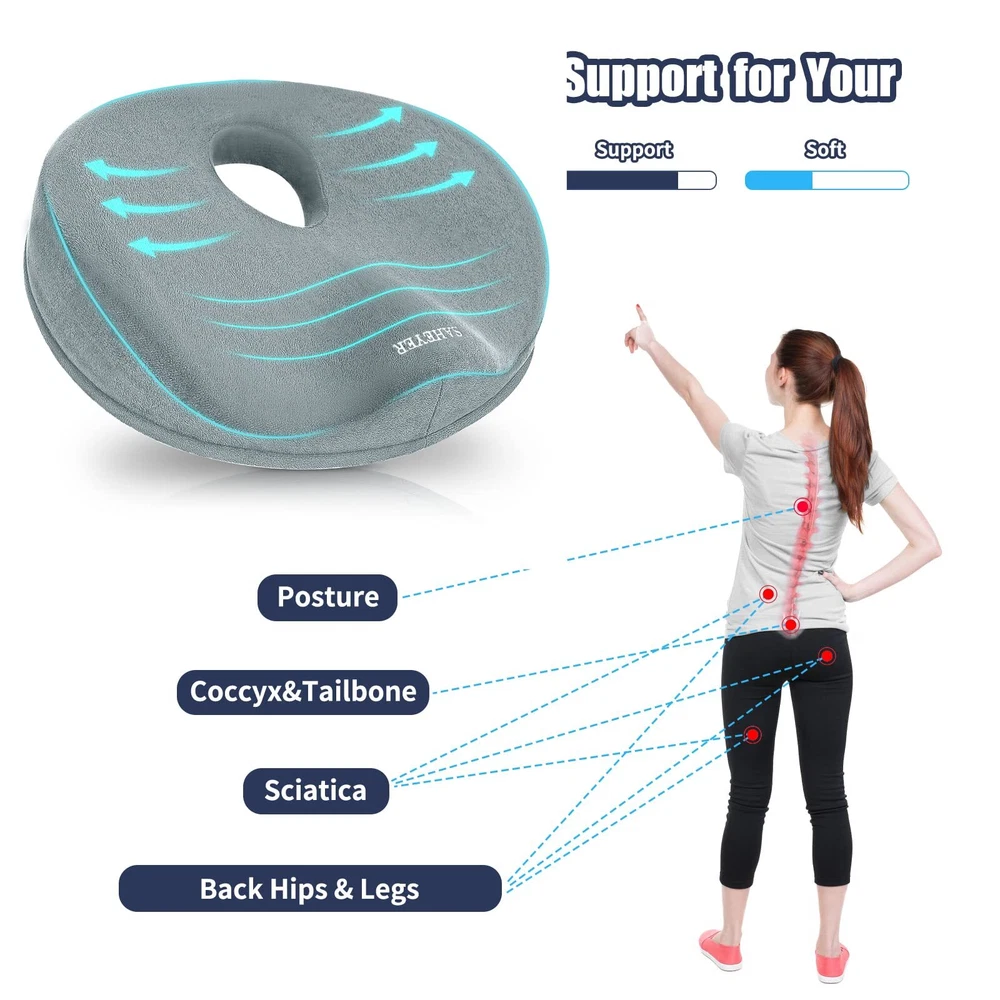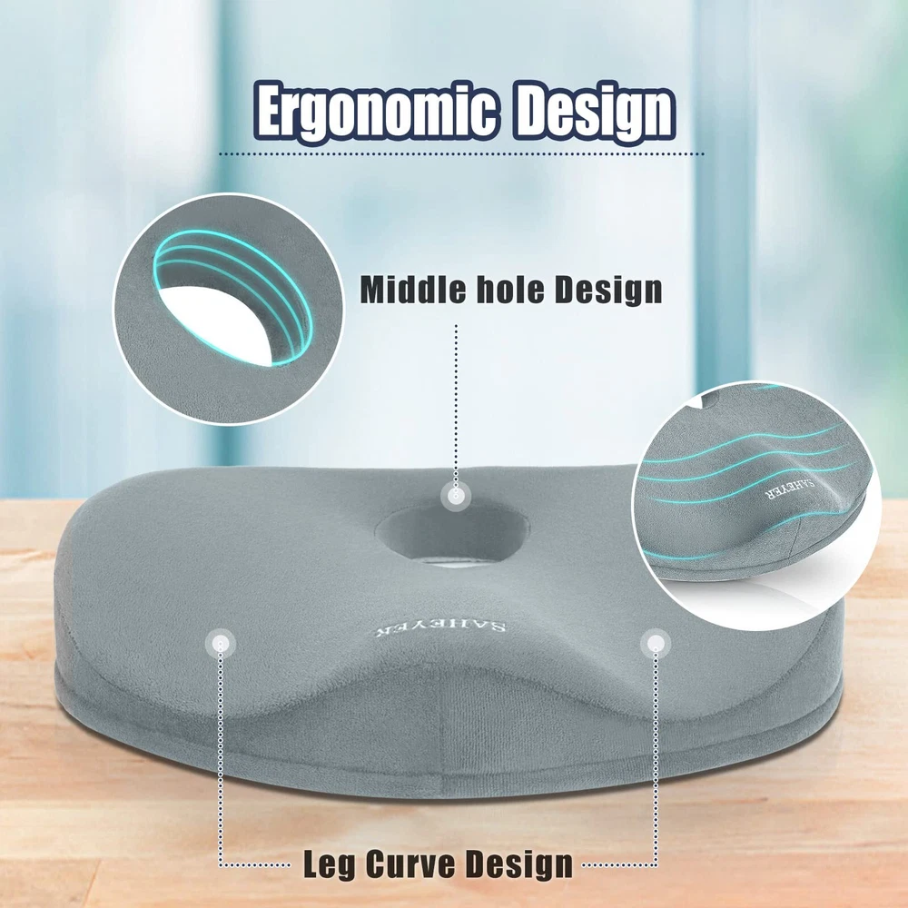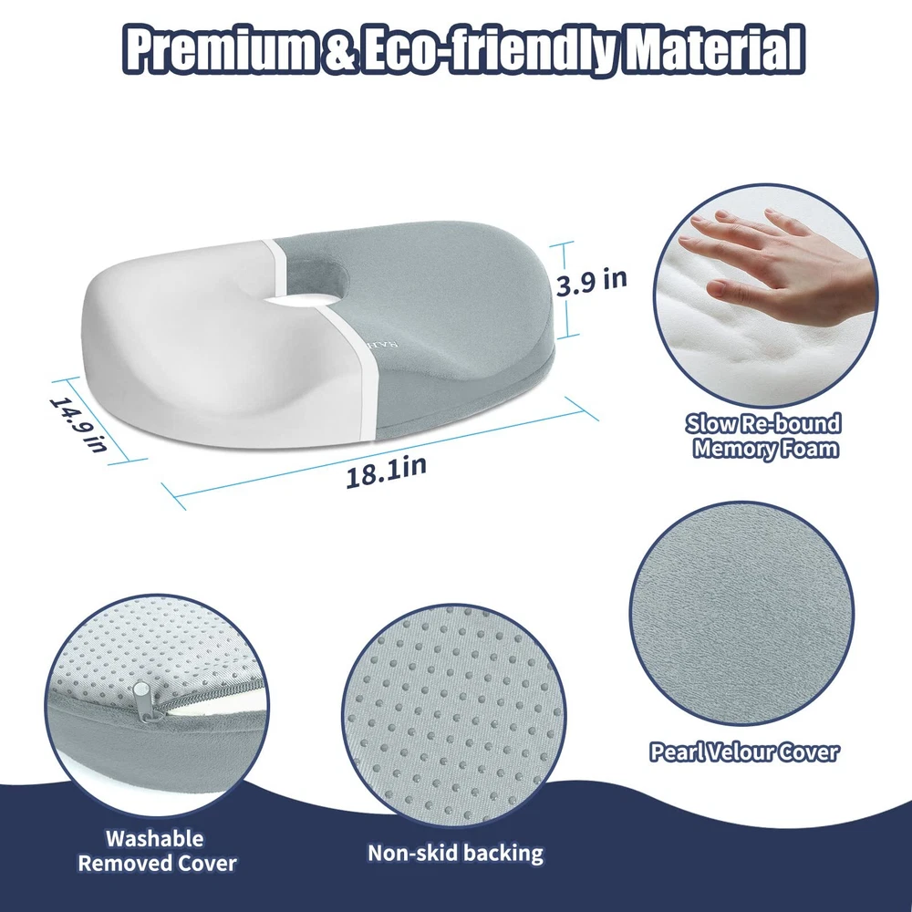 Tailbone Pain Relief Cushion: Are you troubled by tailbone pain caused by sitting for long periods of time? Are you suffering from headaches because hemorrhoids can only Stomach sleeping? 2 in 1 tailbone pain relief donut pillow can solve all of these problems. with ergonomic design, Fits your body perfectly anytime like tailored Ergonomic Design: Donut Pillow for sciatic nerve raised wrap on both sides to guide the correct sitting posture of the hips and relieve back pain and sciatica, middle decompression hole design to facilitate hemorrhoid repair patients while releasing tailbone pressure, and front concave design to fit the thighs and not cause leg numbness by squeezing the leg muscles for a long time. Multi-scene Use: This donut pillow for tailbone pain has anti-slip particles added to the bottom of the pillow. It can be used on any smooth surface or in office chairs, wheelchairs, car seats, etc. So no matter where you sit, this office chair seat cushion can relieve tailbone injuries, sciatica, hemorrhoids, herniated discs, hip pain, back pain during pregnancy, pear-shaped muscle syndrome and any other spinal problems. High Quality Memory Foam Donut Pillow: Donut Cushion Pillow made of 100% temperature-sensing memory foam, 60D perfect density formula is perfect for most people's comfort, with ergonomic design makes it fits your body perfectly like tailored., long time use will not cause the shape to flatten thus keeping the effect in the best condition. removable cover easy wash Size Description: L x W 14 "x17", Different heights in all positions due to ergonomic design, back: 2.5", highest point on both sides. 4", lowest point on front: 1.5", highest point on front: 3", this chair cushion for back pain will not lift you up too much from your normal view