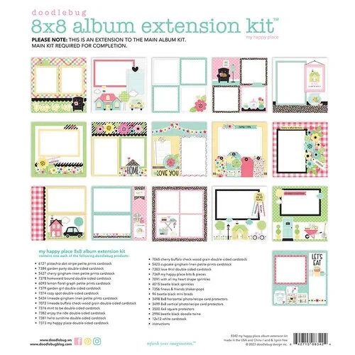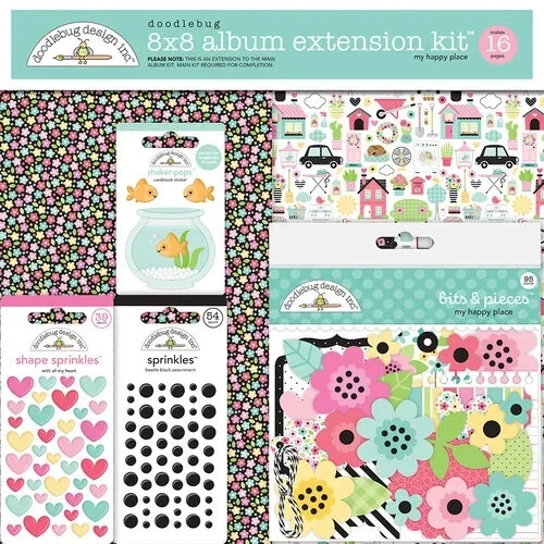 Doodlebug extension kit - My happy Place Transform your memories into a work of art with the Doodlebug Design My Happy Place Collection 8'' x 8'' Album Kit Extension. This all-in-one kit includes everything you need to create a stunning scrapbook album. With 11 double-sided cardstock sheets, 5 petite prints, and an assortment of bits and pieces, stickers, and mini brads, you'll have endless options for customization. The included photo/receipt card protectors in both horizontal and vertical formats, as well as 4 x 4 square protectors, ensure that your precious moments are beautifully preserved. The vibrant colors of pink, yellow, blue, green, and black, combined with whimsical images of flowers, hearts, and houses, will bring your memories to life on every page. Let your creativity soar with the Doodlebug Design My Happy Place Collection. New and factory sealed
