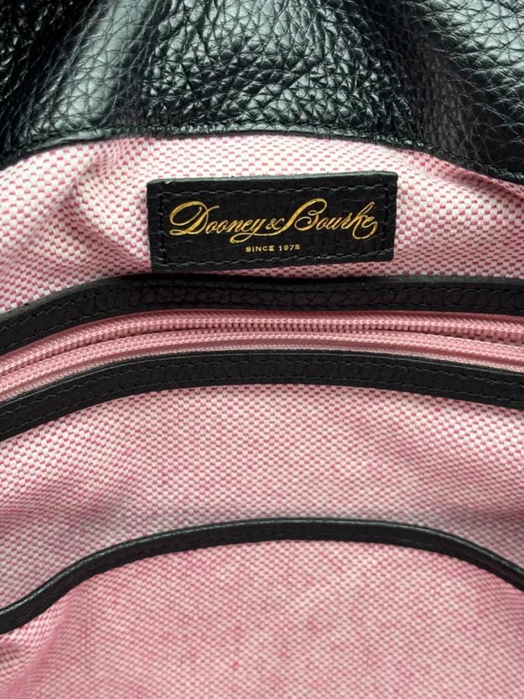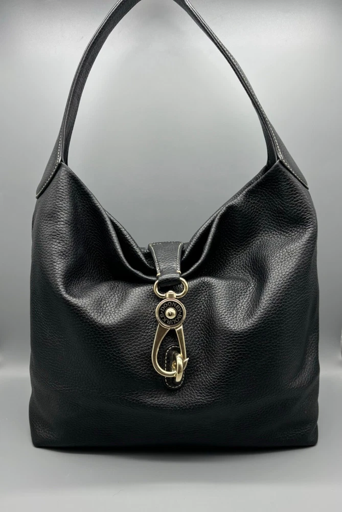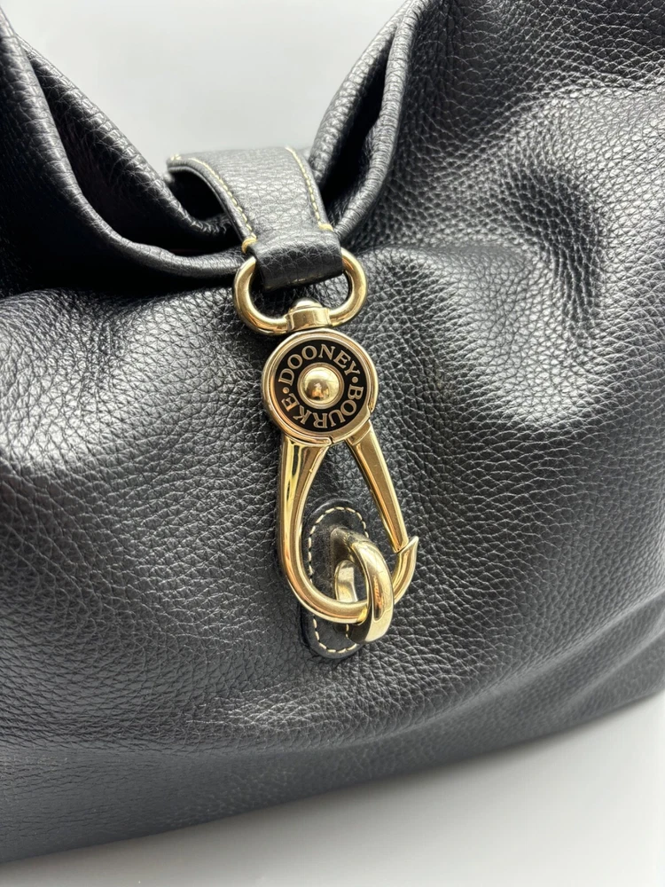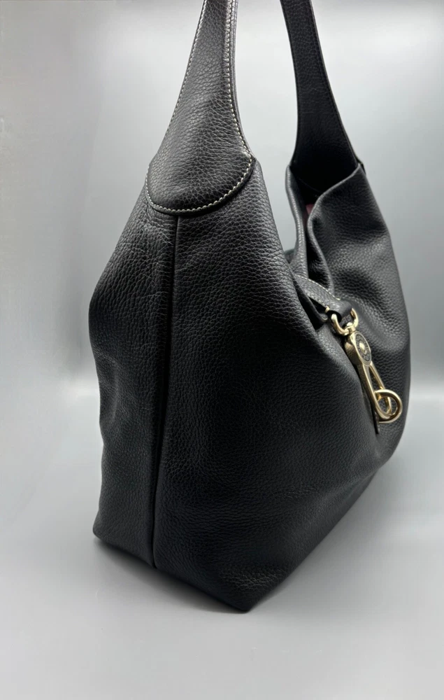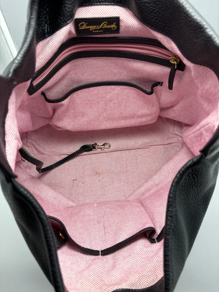 Dooney & Bourke Belvedere black pebbled leather hobo shoulder bag. In excellent condition! Carried only a few times. Clean inside and out. Interior shows a few light marks. The Belvedere is a stunning bag made of buttery pebbled leather and sturdy hardware. The bag's spacious interior will hold everything you need for a day out. Features Gold-tone hardware Lobster clasp closure Pink and white checkered lining Spacious interior 3 interior slip pockets 1 interior zip pocket Measurements Height: 12-1/2 in Width: 13 in Depth: 5 in Strap Drop: 10 in