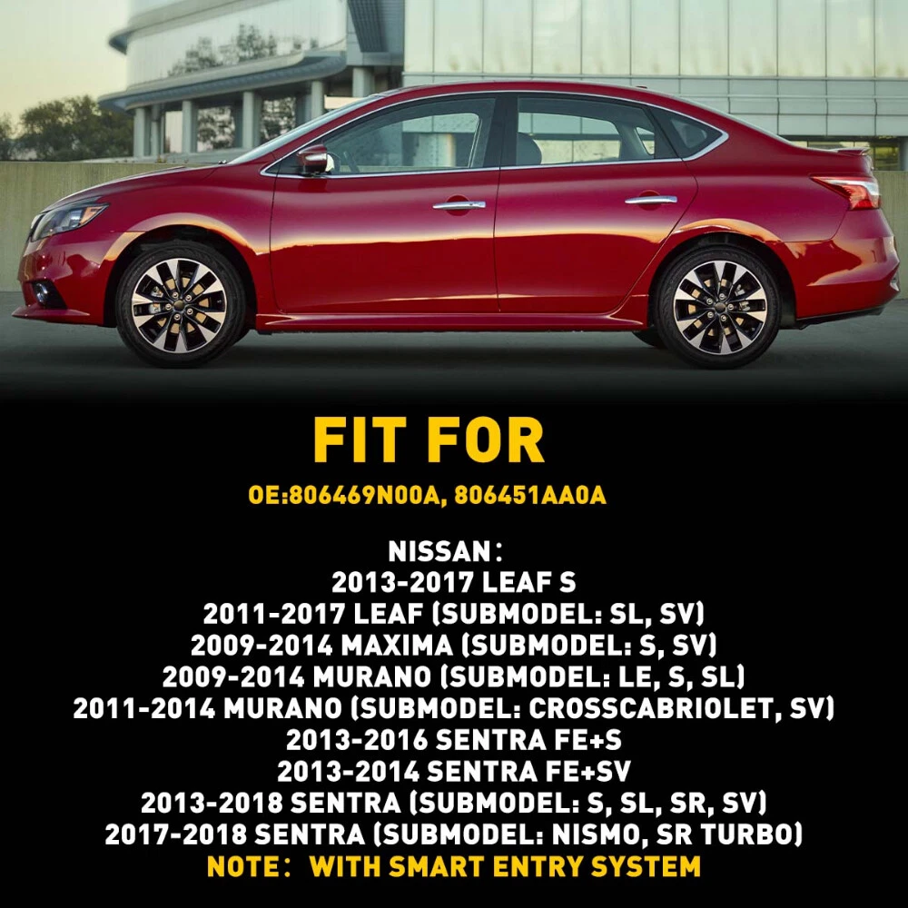 NEW Front Left Exterior Outside Door Handle for Leaf, Maxima, Murano, Sentra etc. Fit for: NISSAN???/span> 2013-2017 Leaf S 2011-2017 Leaf (submodel: SL, SV) 2009-2014 Maxima (submodel: S, SV) 2009-2014 Murano (submodel: LE, S, SL) 2011-2014 Murano (submodel: CrossCabriolet, SV) 2013-2016 Sentra FE+S 2013-2014 Sentra FE+SV 2013-2018 Sentra (submodel: S, SL, SR, SV) 2017-2018 Sentra (submodel: Nismo, SR Turbo) NOTE:With Smart Entry System Specifications: OE number: 806469N00A, 806451AA0A Color:Chromium plating Placement on vehicle: Exterior door (front left) Material: Plastic Door Handle for Nissan Sentra Maxima 13-16 45183 Front Left Driver Exterior NEW NEW Front Left Exterior Outside Door Handle for Leaf, Maxima, Murano, Sentra etc. Fit for: NISSAN???/span> 2013-2017 Leaf S 2011-2017 Leaf (submodel: SL, SV) 2009-2014 Maxima (submodel: S, SV) 2009-2014 Murano (submodel: LE, S, SL) 2011-2014 Murano (submodel: CrossCabriolet, SV) 2013-2016 Sentra FE+S 2013-2014 Sentra FE+SV 2013-2018 Sentra (submodel: S, SL, SR, SV) 2017-2018 Sentra (submodel: Nismo, SR Turbo) NOTE:With Smart Entry System Specifications: OE number: 806469N00A, 806451AA0A Color:Chromium plating Placement on vehicle: Exterior door (front left) Material: Plastic Features: *Perfect fit Comply With OEM Design, Use It With Confidence. *Strict Quality Control All of our handles undergo strict quality control not just before shipping but throughout the production process. *Durable Mainly made of high-quality plastic material to ensure the durability. Packaging include: door handle*1 Item Specifics Brand Unbranded Brand Unbranded Manufacturer Part Number MBS-WM-sentra-13-18-FL Type Door Handle Placement on Vehicle Left, Front Color Chrome Fitment Type Direct Replacement Manufacturer Warranty 1 Year Custom Bundle No Interchange Part Number 806469N00A, 806451AA0A Other Part Number 806469N00A, 806451AA0A Superseded Part Number 806469N00A, 806451AA0A Part Name Exterior Door Handle OE Number 806469N00A, 806451AA0A Notes With Sensor and Keyless System Door lock/key hole provision Without Keyhole Payment We can accept payment by credit, debit, and gift cards; Apple Pay, Google Pay, PayPal, and PayPal Credit. Shipping 1. All items will be shipped in 24 hours after receiving your payment . 2. We ship this item to US only via USPS first class mail. It usually takes 3-5 working days to deliver. Returns 1. We offer 60 days return policy. 2. Please contact us within 60 days from the date you receive your package if you have any questions with the products . 3. Refund will be sent after we got your returned package. 4. All returned items should be in the original packaging with tracking number. Contact Us We work from Monday - Saturday 9:00AM - 6:00PM PST, but we will reply you once we get your message .There will be some delay on response if you send message or E-Mail on Sunday. DESCRIPTION PAYMENT SHIPPING RETURN POLICY CONTACT US Hot item Help & Info Payment Policy Shipping Policy Return Policy FAQ About Us Door Handle for Nissan Sentra Maxima 13-16 45183 Front Left Driver Exterior NEW NEW Front Left Exterior Outside Door Handle for Leaf, Maxima, Murano, Sentra etc. Fit for: NISSAN???/span> 2013-2017 Leaf S 2011-2017 Leaf (submodel: SL, SV) 2009-2014 Maxima (submodel: S, SV) 2009-2014 Murano (submodel: LE, S, SL) 2011-2014 Murano (submodel: CrossCabriolet, SV) 2013-2016 Sentra FE+S 2013-2014 Sentra FE+SV 2013-2018 Sentra (submodel: S, SL, SR, SV) 2017-2018 Sentra (submodel: Nismo, SR Turbo) NOTE:With Smart Entry System Specifications: OE number: 806469N00A, 806451AA0A Color:Chromium plating Placement on vehicle: Exterior door (front left) Material: Plastic Features: *Perfect fit Comply With OEM Design, Use It With Confidence. *Strict Quality Control All of our handles undergo strict quality control not just before shipping but throughout the production process. *Durable Mainly made of high-quality plastic material to ensure the durability. Packaging include: door handle*1 Payment Shipping Returns Contact Us We can accept payment by credit, debit, and gift cards; Apple Pay, Google Pay, PayPal, and PayPal Credit. 1. All items will be shipped in 24 hours after receiving your payment . 2. We ship this item to US only via USPS first class mail. It usually takes 3-5 working days to deliver. 1. We offer 60 days return policy. 2. Please contact us within 60 days from the date you receive your package if you have any questions with the products . 3. Refund will be sent after we got your returned package. 4. All returned items should be in the original packaging with tracking number. We work from Monday - Saturday 9:00AM - 6:00PM PST, but we will reply you once we get your message .There will be some delay on response if you send message or E-Mail on Sunday. All rights reserved. On Jan 12, 2025 at 17:32:34 PST, seller added the following information: