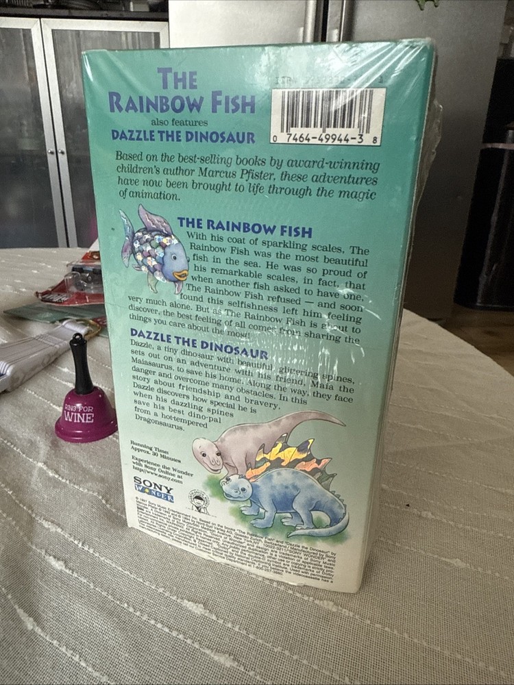 "Doors of Wonder - The Rainbow Fish/Dazzle the Dinosaur" is a VHS tape from 1999 that features two educational and entertaining shows: "The Rainbow Fish" and "Dazzle the Dinosaur." The VHS is in English language with NTSC signal standard. The tape is suitable for all ages and offers a blend of education and general interest, focusing on themes of fishing and the natural world. Perfect for young viewers looking to learn about marine life and wildlife through engaging and colorful storytelling.