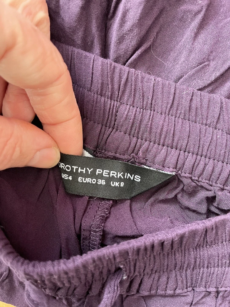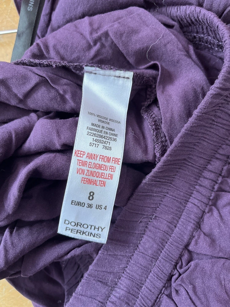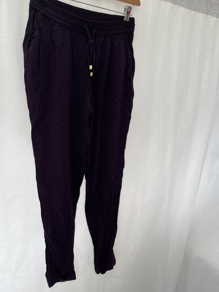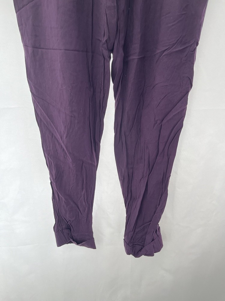 Size Type: Regular Fabric Type: Chambray Leg Style: Tapered Type: Trousers Brand: Dorothy Perkins Closure: Drawstring Colour: Purple Material: Viscose Department: Women Size: 8 Inside Leg: 26 in Style: Harem