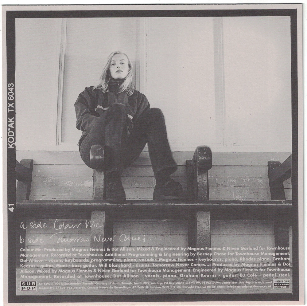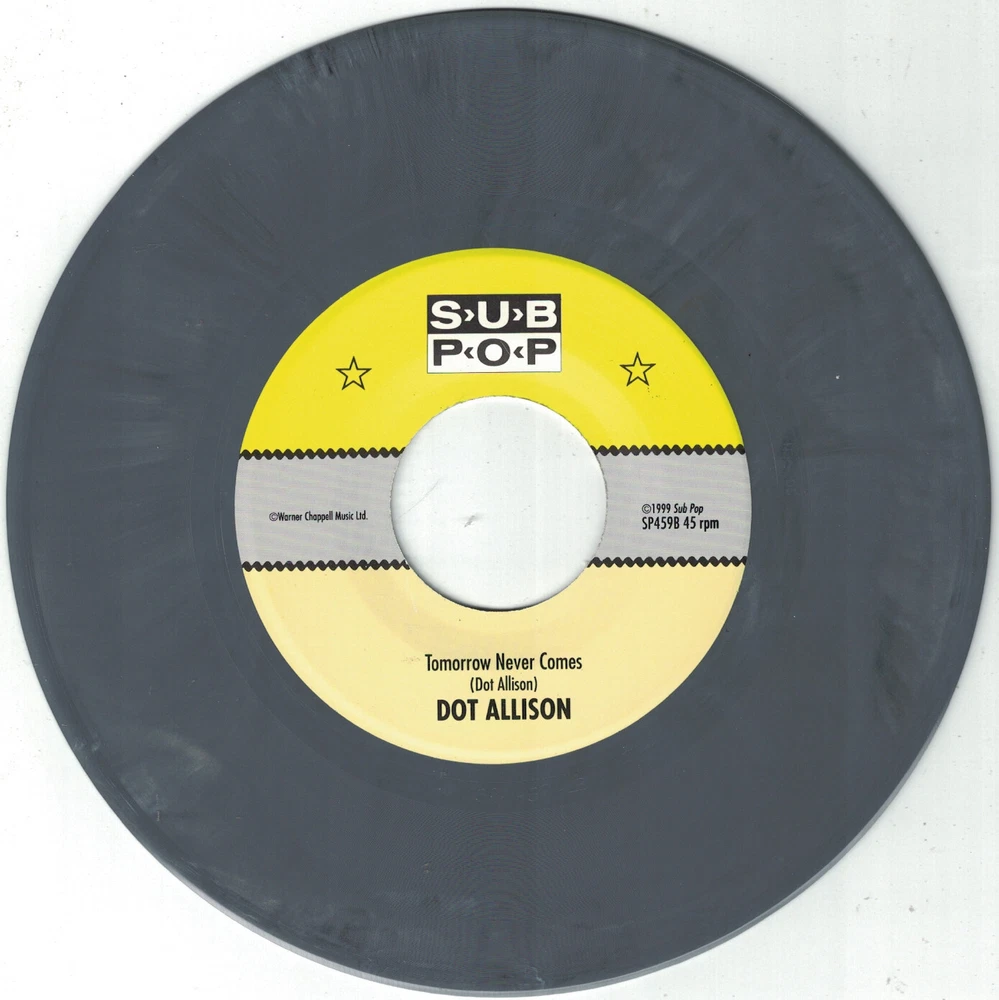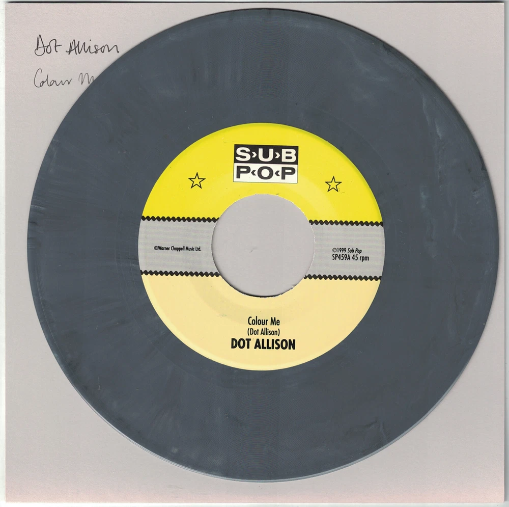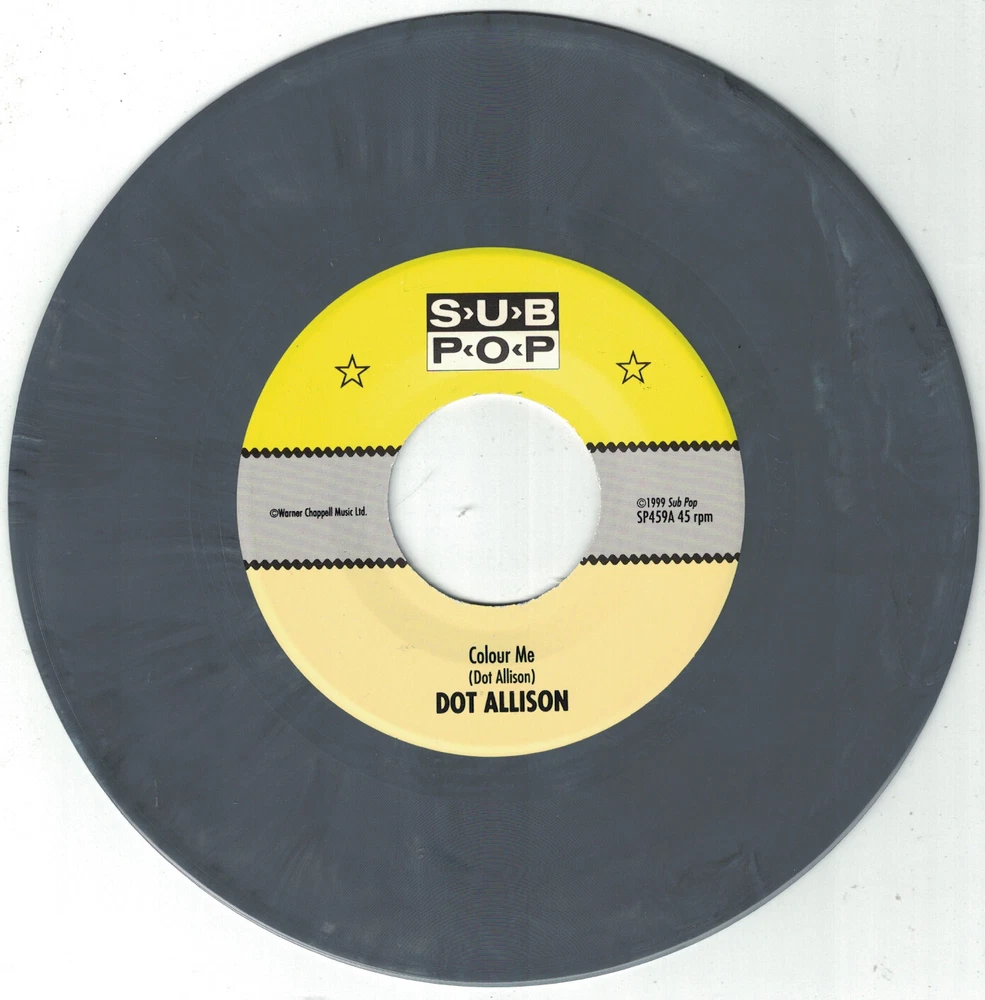 This item qualifies for a Discounted Combined Shipping Rate Dot Allison 7" release of "Colour Me" b/w "Tomorrow Never Comes...". This release is from the Sub Pop Singles Club (SP459). Released back in May 1999. This is a pressing limited to only 1300 copies on MARBLED GREY WAX and is out of print. The sleeve is in MINT shape. This release comes with the Sub Pop Singles Club subscription flap attached . A very close visual inspection of the playing surface shows Mint condition. I am the original owner of this record and it is unplayed . I offer combined shipping discounts! If you want to purchase multiple items: 1. Please add each item to your shopping cart. 2. Once you have added all of you items, proceed to eBay Checkout. 3. eBay Checkout will automatically combine all of the items and calculate the shipping discount. 4. Make only one payment
