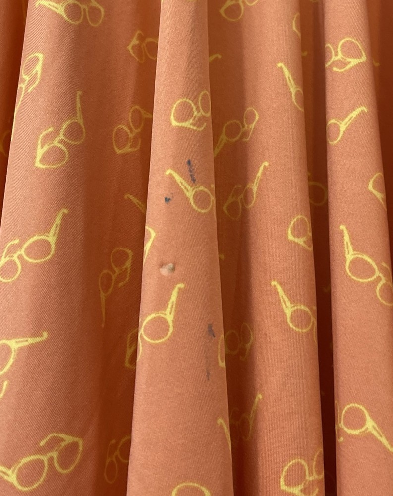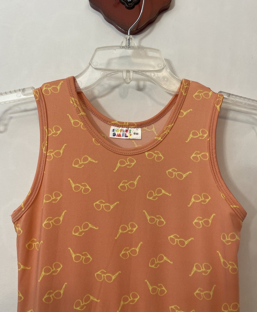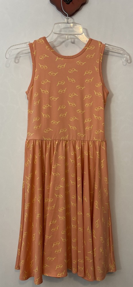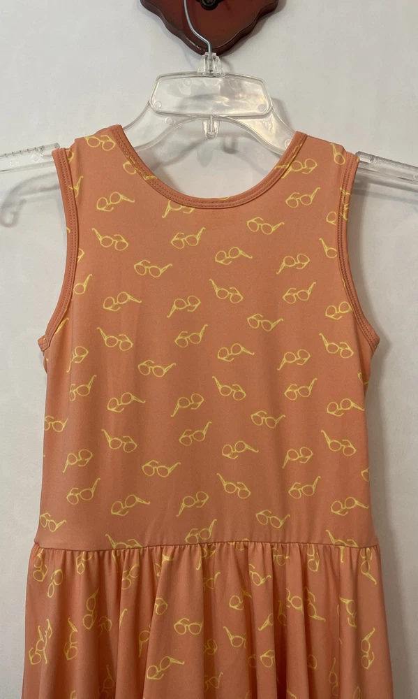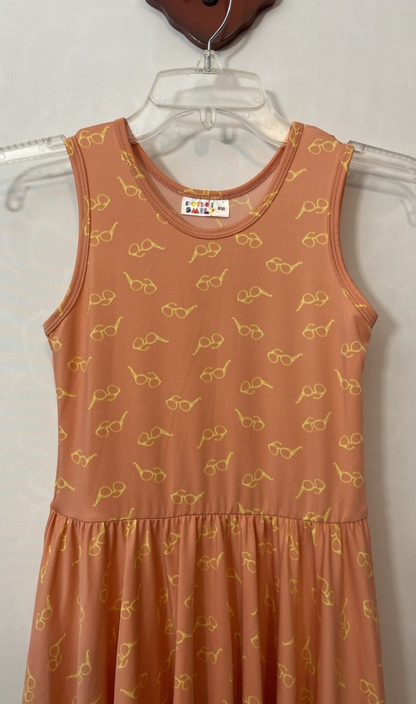 This Dot Dot Smile dress is designed for girls in size 8/10. The knee-length dress is sleeveless with a round neckline and features a ruffled accent, giving it a flowy and stylish look. Made from a blend of polyester, spandex, nylon, rayon, and cotton, the dress has a fit & flare silhouette with an elastic waist and stretch material, making it comfortable and flattering to wear. This pink dress has a yellow sunglasses print and is perfect for various occasions such as travel, parties, or casual outings during the summer and spring seasons. It has a slight spot highlighted in the pictures showing a blue stain, but it is contained within the ruffles! Length: 34 inches. Chest: 13 inches across laying flat.