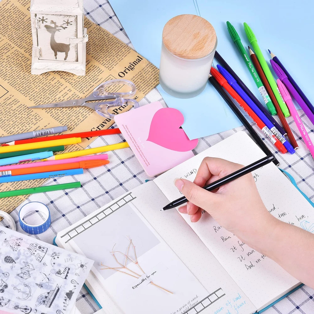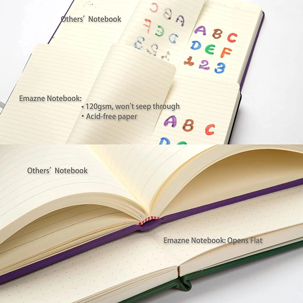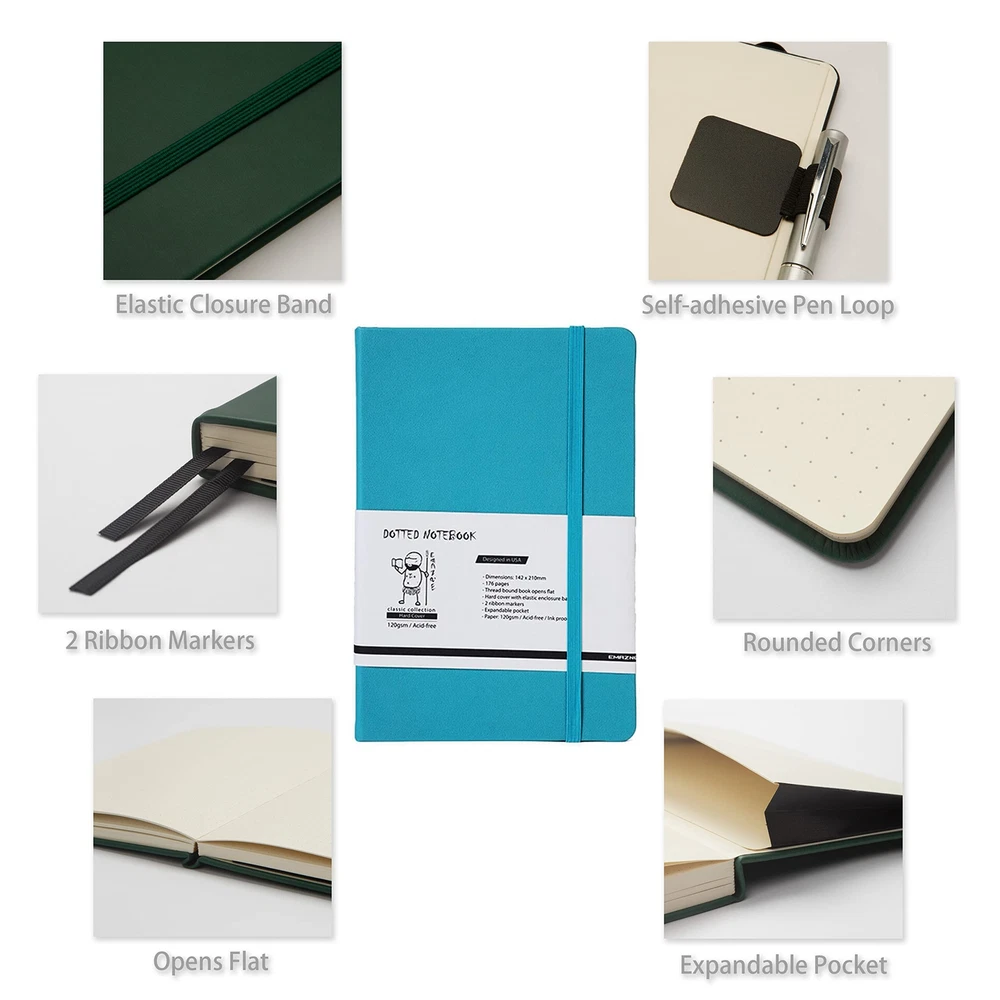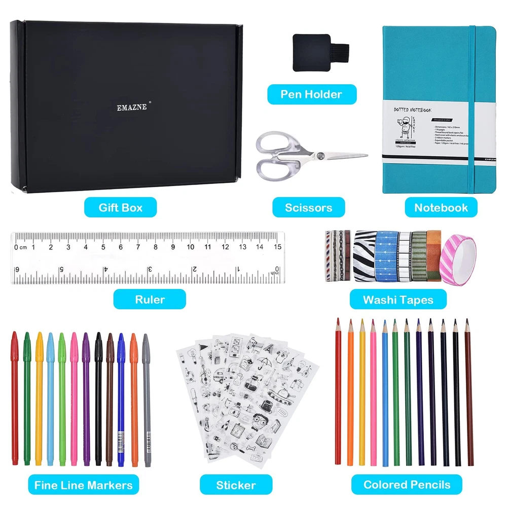 Hardcover Journal Kit Details: One Hardcover Notebook, 12 Colors Fine Line Markers, 12 Colors Pencils,6 Sheets of Stickers,1 Ruler, 10 Washi Tapes, One Scissors.Pen Holder, 2 Colored Ribbon Bookmarks add more convenience. Abundant Accessories for Beginners Planner Schedule HUMANIZED DESIGN: Lay Flat 180° Design. Integrated Internal Accordion Pocket and Cardboard Bound Cover. Strong Binding: The pages don't get peeled away from the cover. Rounded case binding is holding the pages tight. Elastic closure helps keep notebook securely closed, making it easy to write in the notebook from just about anywhere. Deluxe Quality Pages:120gsm/Acid-free Paper, 40% thicker than normal. Excellent for fountain pens and ink. No feathering and bleeding. Size:A5; Sheets:176 Pages; Page Layout:Dotted (Dot Grid);Acid-free paper-resists damage from light and air. We have Both "Ruled", "Dotted" Version. Please find them in our store. Acid-free paper is paper that if infused in water yields a neutral or basic pH (7 or slightly greater). Acid-free paper addresses the problem of preserving documents and artwork for long periods. Acid-free paper has a life expectancy of over 1,000 years for the best paper and 500 years for average grades. It is Loved for a reason:Writers, students, artists, professionals & travelers love our notebooks. From Ruled to dotted paper there's a notebook for your needs. Try one & you'll understand the passion. Messages will be replied within 12 hours and life-time friendly customer service.