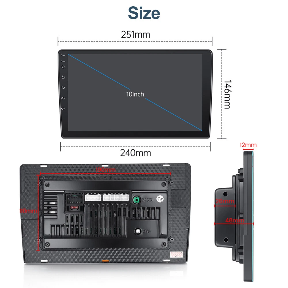 🎁This Car MP5 player has a built-in 10.1-inch high-definition digital screen and has better performance and more powerful functions. And it is also equipped with Bluetooth function, which can be connected to mobile phones, and supports hands-free calling, safer driving, and Bluetooth music playback. Stylish and new design is adopted, and it can perfectly match your car. It is also high-quality and easy to install and use. Feature: -10.1'' TouchScreen Car Stereo: This Car Stereo is equipped with 10.1 inch big screen. High revolution, supports 1080P ultra clear video. arc edge anti-scratch tempered glass screen, durable and not easy to break. -GPS Navigation, WIFI Supports: Car stereo double din with New GPS navigation function, supports offline/online mode, real-time positioning and accurate navigation. Android software installation is available. Free access to the Internet, giving you a wonderful Internet experience. -Bluetooth 4.1: Built-in Bluetooth 4.1 version, supports hands free phone calls and music playing, making driving safer. File transfer can be faster and more stable and music playback quality is improved. -RDS/FM Radio, Steering Wheel Control: FM radio, high-definition broadcast radio, you can choose your favorite stations and listen to news, music and program anytime. RDS: TA, AF, PTY are supported. Steering wheel control is available, which is easy to learn and operate. -HD Reversing Image: When the car is in reverse gear, the car stereo radio can automatically switch the full-screen reversing image, which makes it safe and easy to solve the trouble of reversing! -Compatible with Apple Carplay and Android Auto Function: Double Din Car Stereo supports Apple CarPlay & Android Auto, and easily get phone contacts, emails, notifications, map navigation, music, videos, hands-free phone calls, and etc. Specification: OS: Android 13 Radio frequency: FM 87.5~108.0MHz Radio IC: 6625 Power amplifier IC: CD7388CZ Output power: 60Wx4 Working voltage: 12~14.4V Working temperature: -10~60℃ Bluetooth version: 4.1 (default name: Car-BT) WiFi frequency: 2.4GHz GPS signal: GPS/AGPS/GLONASS/Beidou CPU: A7, 1.3GHz, Quad Core Memory: 2GB RAM + 32GB ROM Screen size: 10.1 inches (IPS screen) Screen resolution: 1024x600 Phone screen mirroring: support (for iPhone/Android phones) Locate and find my car function: not supported Reversing camera input: support Driving video playback warning: support Steering wheel control function: support button learning Video output: support Offline maps: support Dashcam input: support (USB signal input) GPS navigation: support Rear USB port: USB 2.0 (4-pin, for USB flash drive input) Rear USB port: USB 2.0 (6-pin, for dashcam input) Reset button: support RCA ports: 2-channel audio output (left channel + right channel), 1 channel video output, 2-channel audio input (left channel + right channel), 2-channel video input, 1 channel reversing video input Audio format: MP3/WMA/WAV/APE/FLAC/AAC/OGG/RM Video format: MPEG/AVI/RM/FLV/ASF/WMV/MP4/MKV/OGM/TS/DivX/RMVB/VOB Photo format: JPG/BMP/PNG/JPEG/GIF Language: Indonesian/Malay/Czech/Danish/German/English/Spanish/Filipino/French/Croatian/Italian/Latvian/Lithuanian/Hungarian/Dutch/Norwegian Bokmal/Polish/Portuguese/Romanian/Slovak/Finnish/Swedish/Vietnamese/Turkish/Greek/Bulgarian/Russian/Ukrainian/Hebrew/Urdu/Arabic/Persian/Hindi/Bengali/Thai/Khmer/Korean/Simplified Chinese/Traditional Chinese/Japanese Factory setting password: 1234 Note: There may be slight size deviations due to manual measurement, different measuring methods, and tools. The pictures may not reflect the actual color of the item because of different photographing lights, angles, and monitors. What's included: 1 X Car Radio 1 X 16-Pin Power Cable 1 X RCA Cable 1 X Reversing Video Input Cable 2 X USB Cables 2 X Mounting Brackets 4 X Screws 1 X Manual