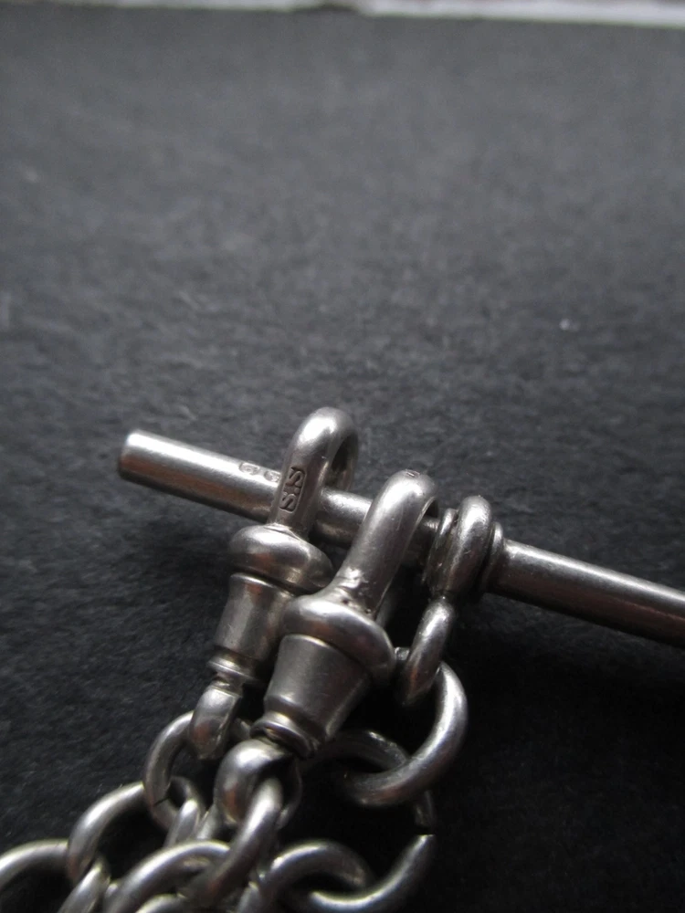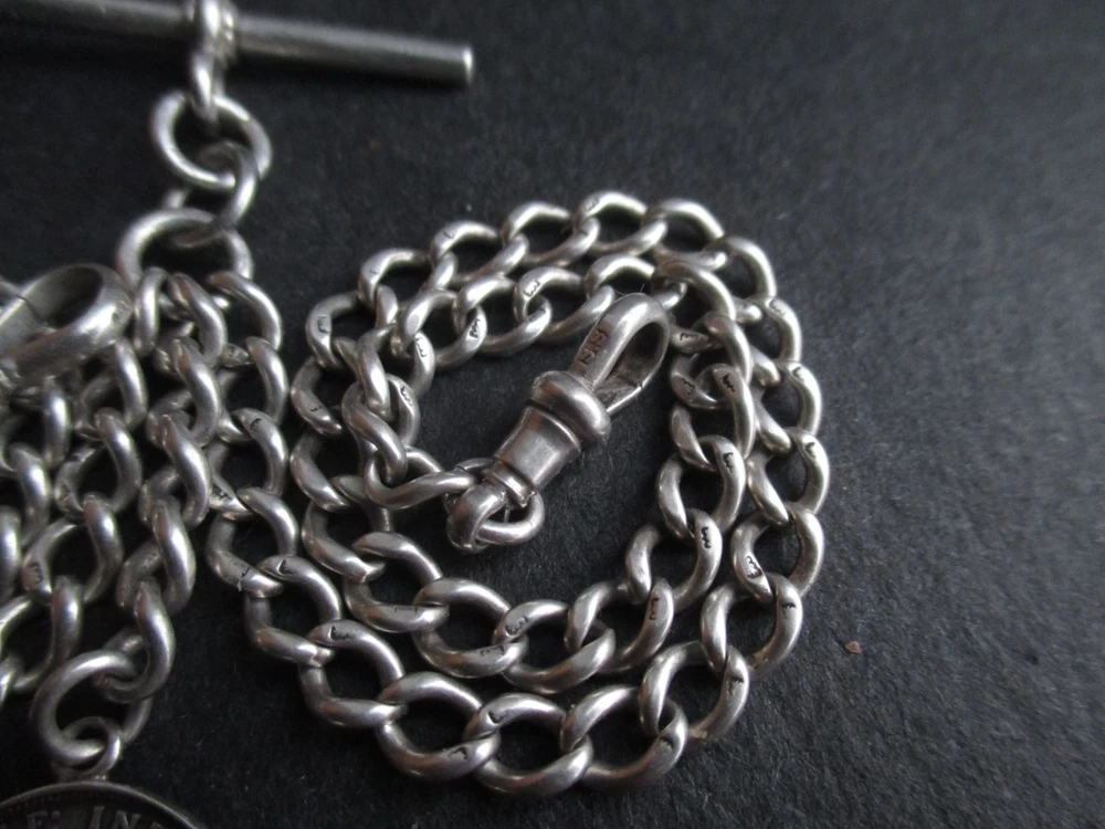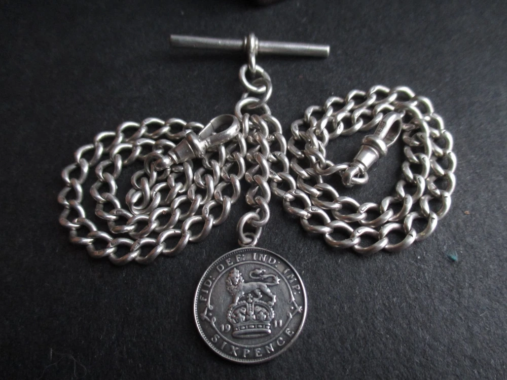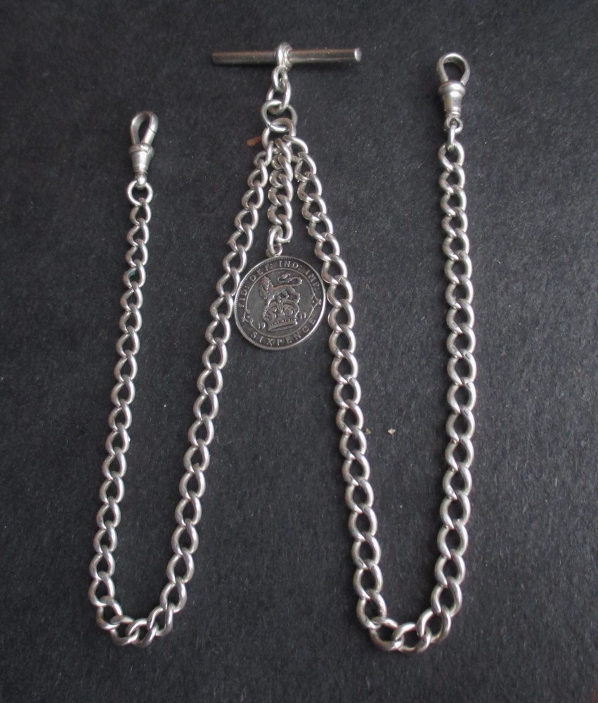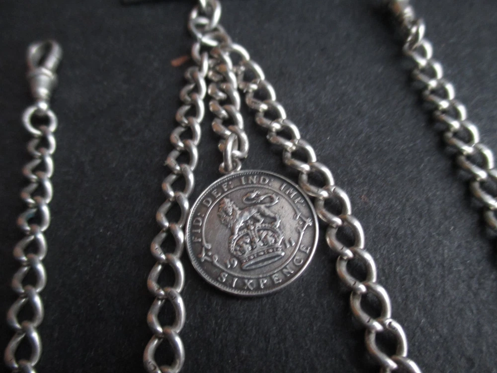 William thorneywork birmingham 1881 sterling silver double albert pocket watch with lions on the links some slightly rubbed .1911 silver sixpence fob. Sterling silver links . Solid silver (tested) clips matching in style on marked SS for sterling silver the other Real Silver. Good condition springy clips .weight 29g . t bar 1.5 inches. chain 17.5 inches long. 5mm wide.