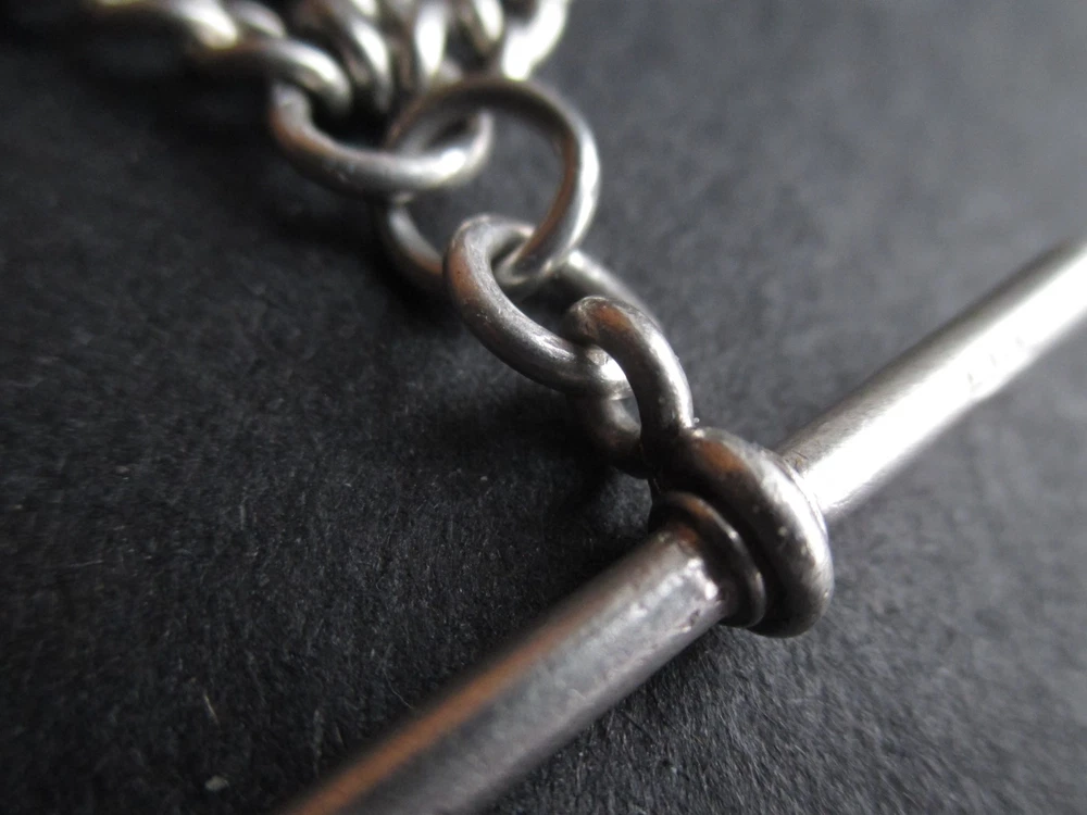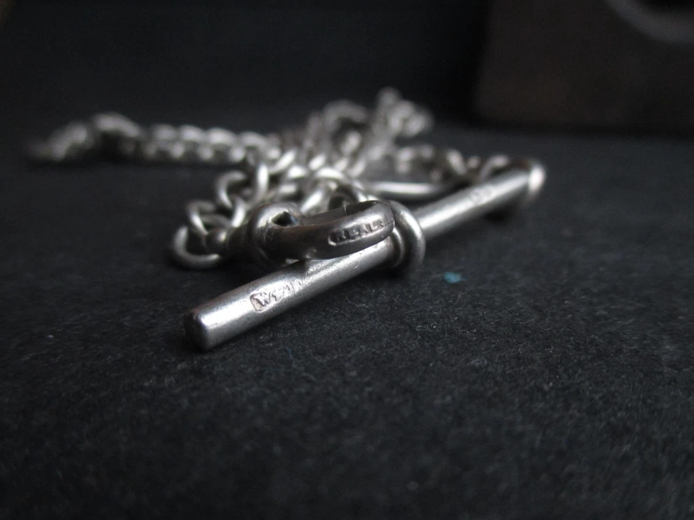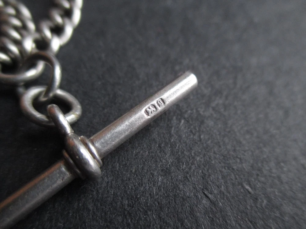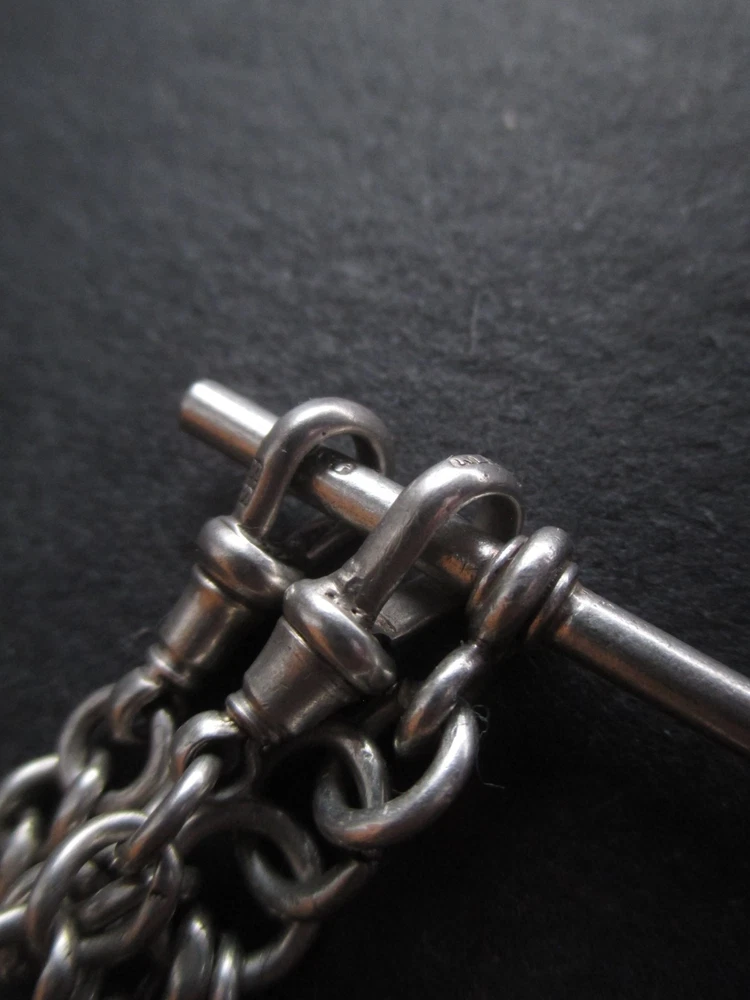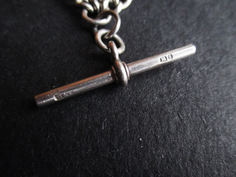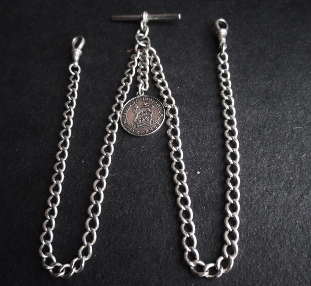 William thorneywork birmingham 1881 sterling silver double albert pocket watch with lions on the links some slightly rubbed .1911 silver sixpence fob. Sterling silver links . Solid silver (tested) clips matching in style on marked SS for sterling silver the other Real Silver. Good condition springy clips .weight 29g . t bar 1.5 inches. chain 17.5 inches long. 5mm wide.