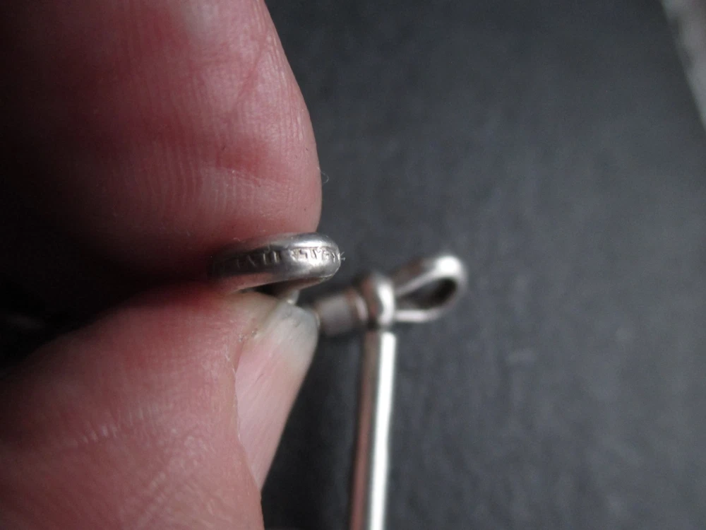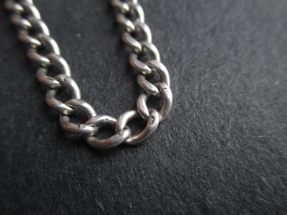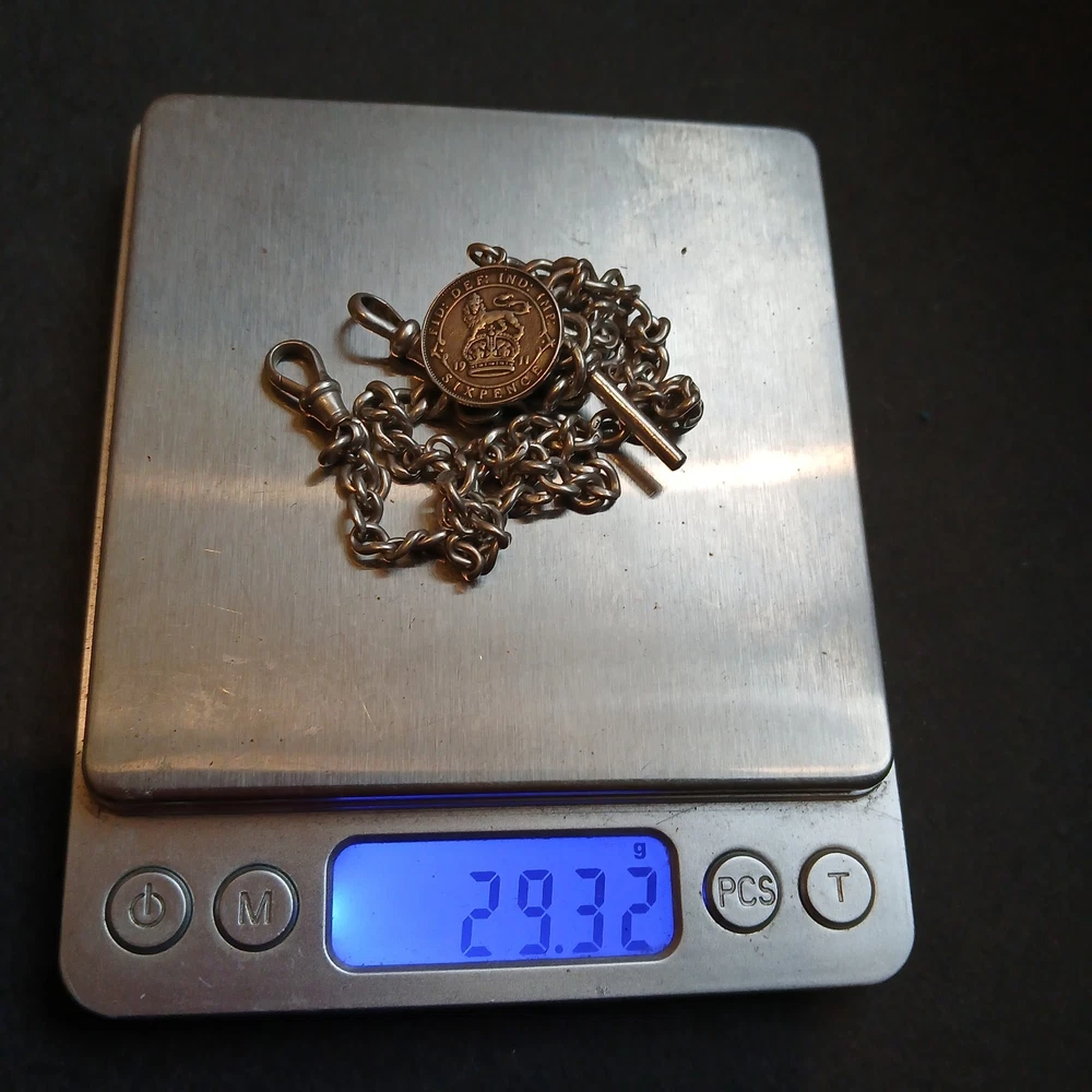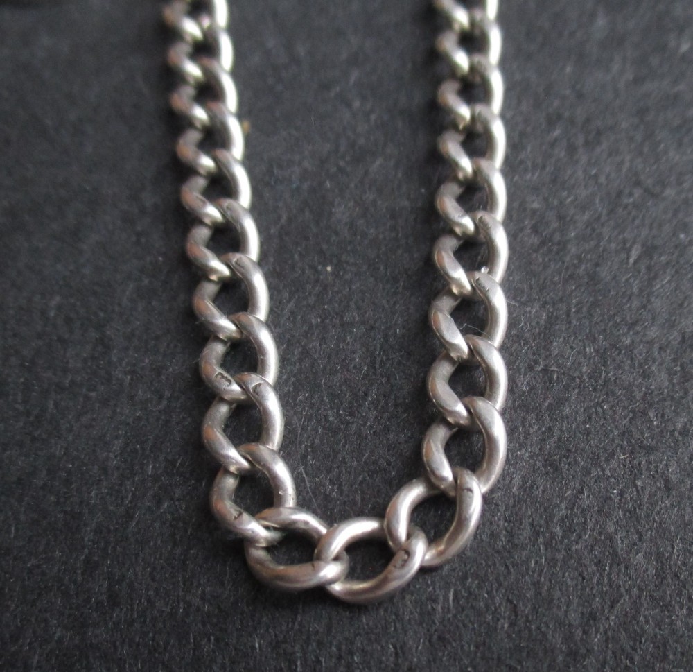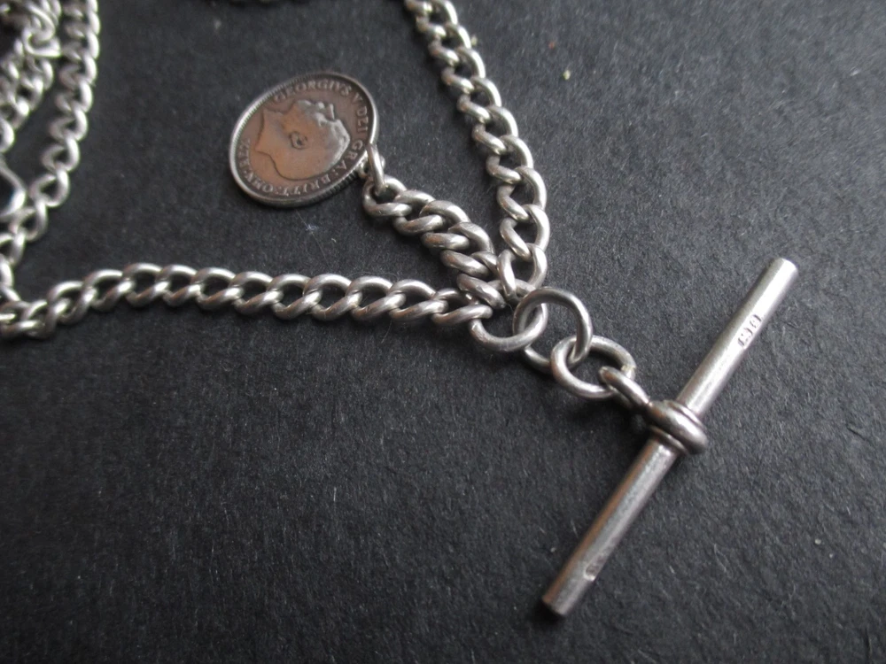 William thorneywork birmingham 1881 sterling silver double albert pocket watch with lions on the links some slightly rubbed .1911 silver sixpence fob. Sterling silver links . Solid silver (tested) clips matching in style on marked SS for sterling silver the other Real Silver. Good condition springy clips .weight 29g . t bar 1.5 inches. chain 17.5 inches long. 5mm wide.