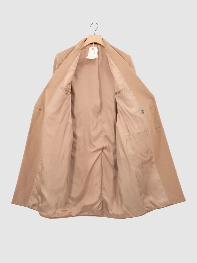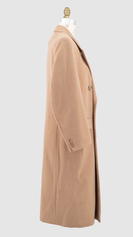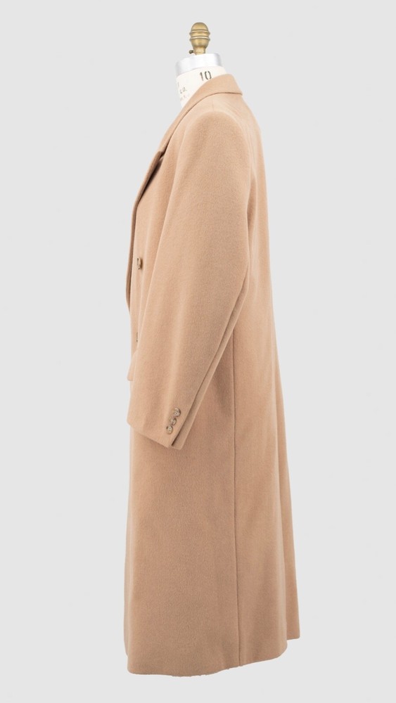 Double Breasted Camel Trench Coat, Size 36 (Small) Men's. Total length 45", sleeve length 24", chest 22 1/2", label inside "Made in Poland, Dry Clean Only, size label in inside pocket S-36. Material: No content label indicated so not too sure what is the exact material but it does feel like wool.