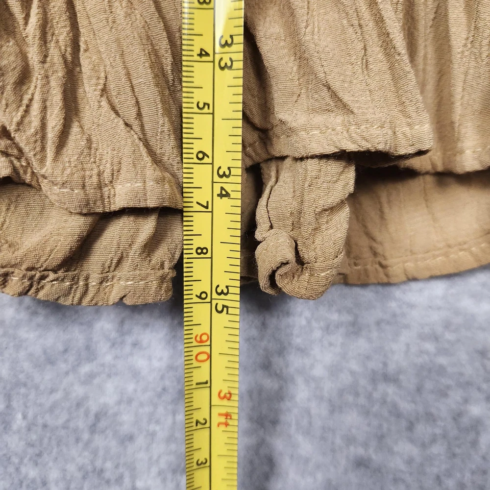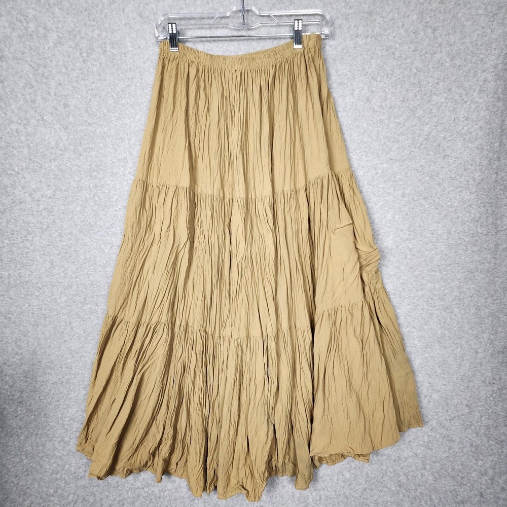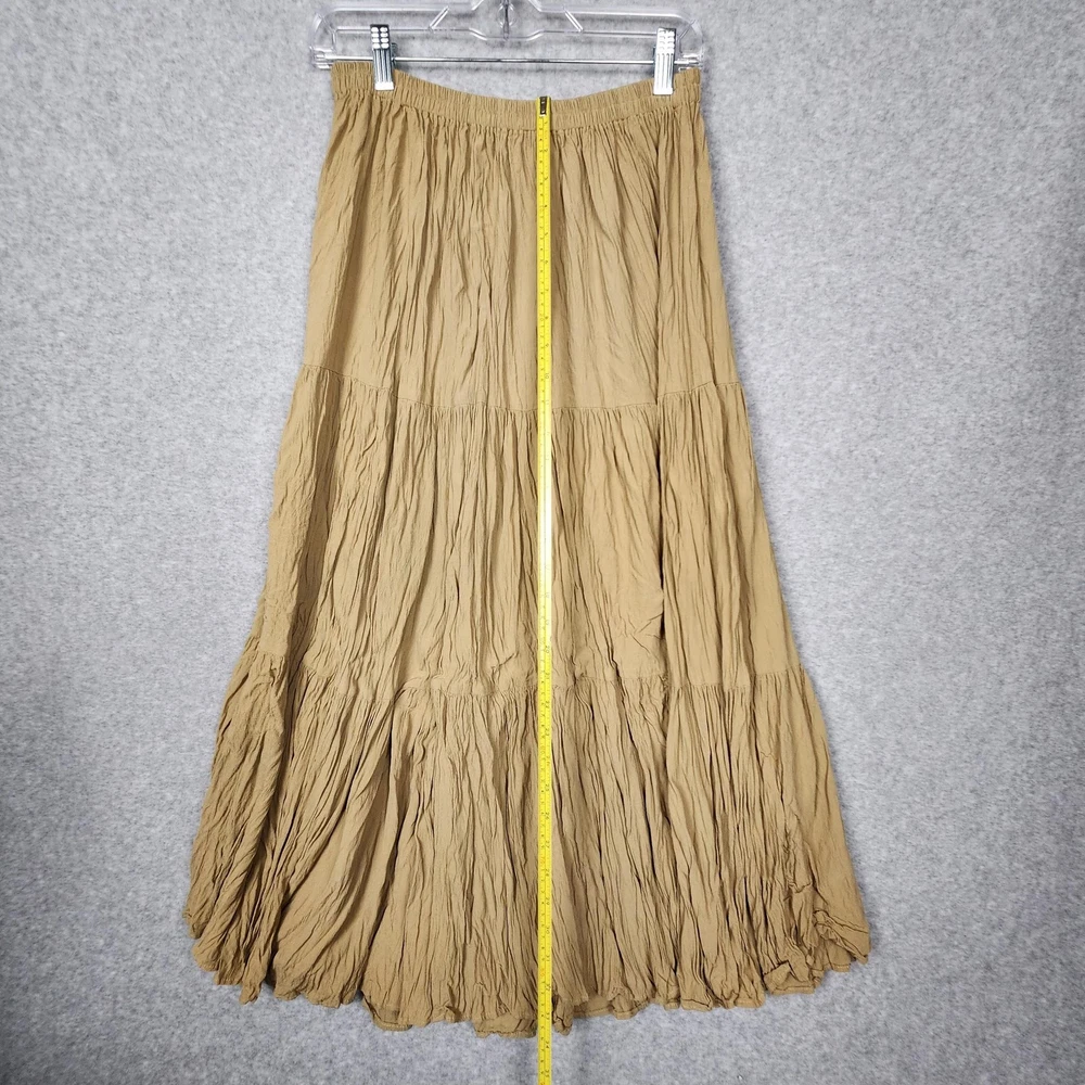 Double D Ranchwear Skirt Womens Medium Brown Tiered Crinkle Maxi Western Boho Condition: Good used condition. Light overall wear throughout, but no visible stains, holes, or major flaws noted. Please review all photos for fullest detail. Features a crinkle texture, tiered panels, and full maxi length silhouette for a western or boho look Wide stretch waistband for comfort and easy pull-on style Color: Brown/tan Handwritten tag marked "1100" included Tag size: Medium (Womens). Approximate flat lay measurements: Waist: 13.5 in across (unstretched), Length: 35 in Double D Ranchwear leather-look logo tag stitched at seam Perfect for western, boho, or festival outfits