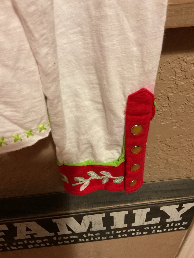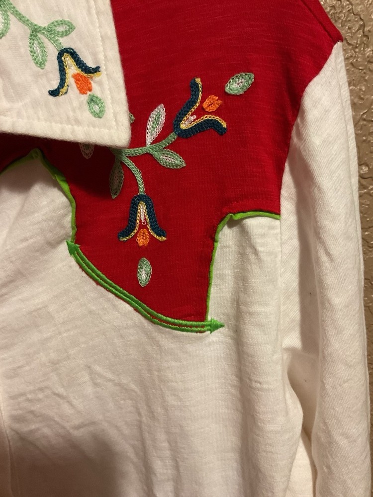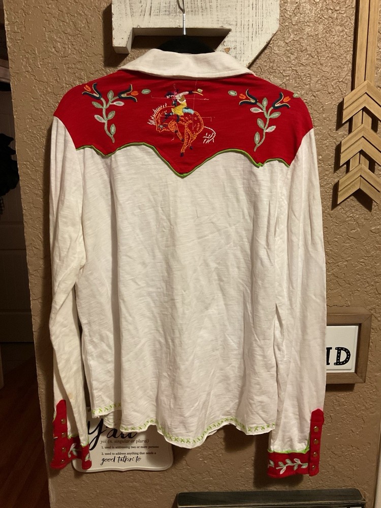 The Double D Ranch White Knit Pearl Snap Floral and Cowboy Embroidery Women’s Size XL blouse is a stylish and unique addition to any woman's wardrobe. Featuring intricate floral embroidery and cowboy-themed accents, this top is perfect for those who love a blend of rustic and feminine styles. The knitted fabric adds texture and comfort, while the pearl snap closure adds a touch of sophistication. This blouse is sure to make a statement and stand out in any outfit. Women’s Double D Ranch White Knit Pearl Snap Long Sleeve Shirt Accented with Red and Floral and Cowboy Embroidery 100% cotton Size XL Length 26” Chest 46” Sleeve Length 21”