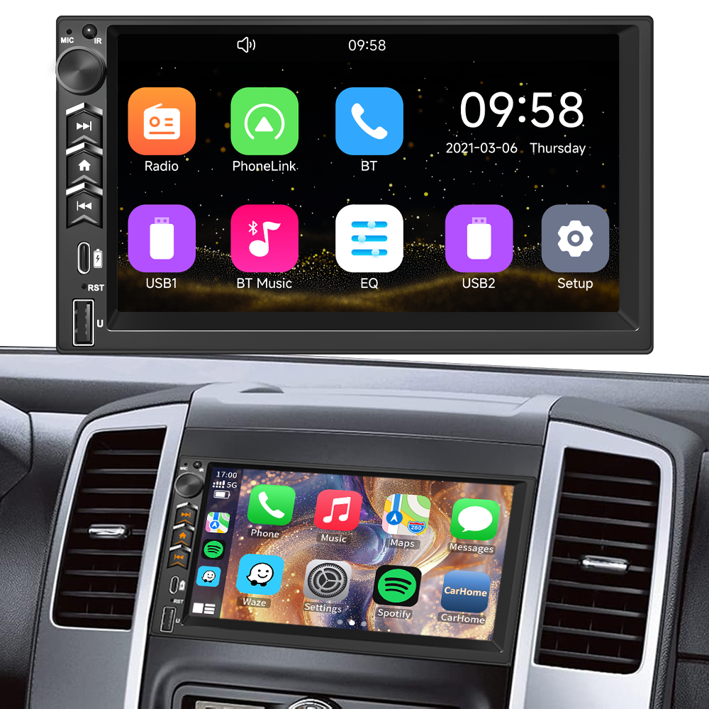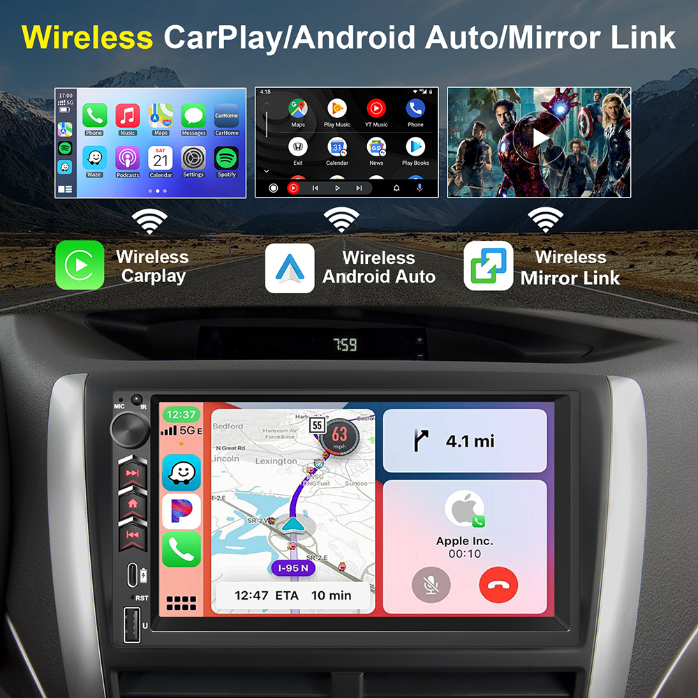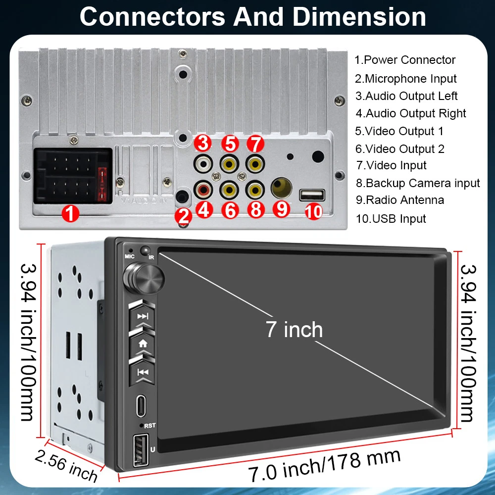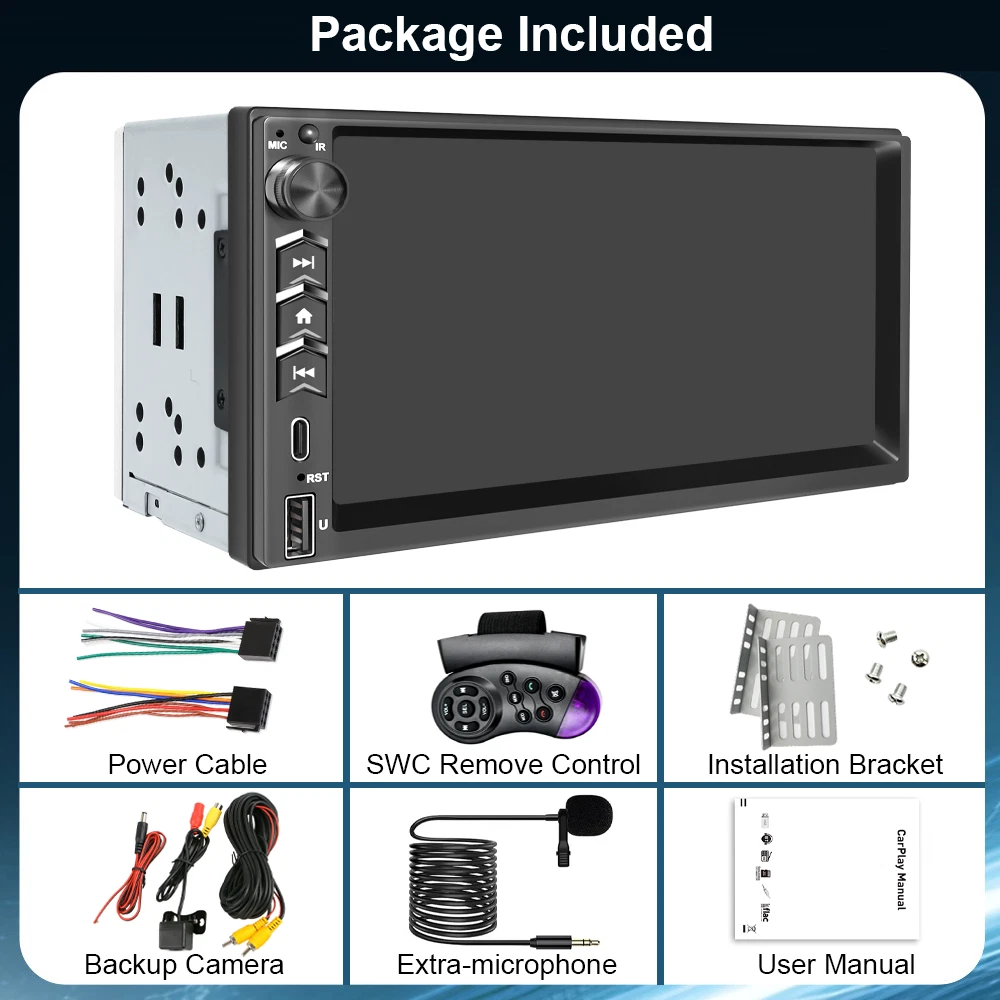 Double 2 Din Car Stereo Radio MP5 Player Wireless Apple CarPlay & Android AUTO Features: 1. Wireless/Wired Apple CarPlay & Android AUTO 2. Smartphone Mirror Link Android/iOS 3. 10 Band EQ, DSP 4. Bluetooth 5.0 5. 7 inch Capacitve Multi-touch Screen 6. Reverse Rear View Camera Input(Camera included) 7. Audio Output, Video Output, Audio Output, Audio Input 8. Original Car Steering Wheel Control 9. AM/FM RDS Radio 10. U disk Playback (audio/video/photo) 11. Type-c Charger 12. 7 Colors Key Light Product details: Model: F133-9360 Unit Size: Double 2 Din Voltage: DC 12V Type: Car MP5 Player System: Linux F133 Configuration: Full capacitive touch screen Solution: 8268K Screen size: 7 inches Resolution: 1280x720 Panel size:178x100mm Button Lighting: Colored lights Host depth: 2.56 inch/65mm Single weight: 680g Mirrorlink: Miirorlink (Android / iPhone) Carplay & Android auto: Support wireless or wire connection Radio: FM / AM RDS Radio chip: ZT0811 Power: 60W Audio Output: 4x 50W Temperature: -10 ~ 60 ℃ Reverse image: Support Brake reminder: Support Steering Wheel Control: Support Bluetooth: version 5.2 Radio frequency: FM 87.5 ~ 108MHz AM 522 ~ 1620KHZ Video output: Support USB interface: Front panel USB 3.0 Reset Button: Have Button: Mechanical buttons RCA terminal: 2 audio output, 1 reverse input, 1 video input, 2 video output Audio Format: MP3 / WMA / AAC / APE / OGG / M4A / RA / WAV Video Format: H264 DIVX HD (720P 1080I 1080P) AVI / FLV / MKV / RMVB / MPEG / ASF / TS / H264 / QT Picture format: JPEG / PNG / BMP / GIF / TIFF Language: English / Spanish / Portuguese / Simplified Chinese / Chinese / Traditional Chinese / German / French / Turkish / Japanese / Russian / Italian / Polish / Dutch / Danish / Greek Package Included: 1 x Car MP5 Player 2 x Power Cable 1 x SWC Remote control 1 x Installation Bracket 1 x Microphone 1 x User Manual 1X Back Up camera