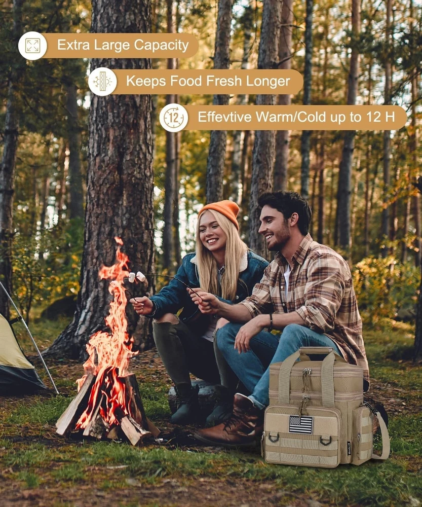 Color Sandy Material Polyester Brand Bnlcd Age Range (Description) Adult Capacity 16 Liters Theme Military Pattern Solid Item Weight 0.87 Kilograms Number of Compartments 2 Style Tactical See more About this item 【Tactical & Practical Design】 : Combining outdoor ruggedness with tactical versatility, this design features webbing on the right side pocket, allowing for the attachment of various accessories. The front pocket is equipped with Velcro for affixing national flags or warning labels, enabling you to express your style and personality. 【Large Capacity & Dual Compartment】 : Maximum capacity is 16 liters, accommodating up to 24 cans of soda. The lunch bag features a dual-compartment design to cater to various needs, allowing for the separation of hot and cold food items. The upper layer of the lunch box is extendable, enabling an increase in capacity by an additional 4 liters through unzipping the central zipper. 【Excellent Insulation】 : The internal layer is constructed from PEVA material. A built-in 6mm EPE foam middle layer, along with a non-woven fabric liner, provides additional insulation. This design effectively keeps food and beverages warm and fresh for at least 8 hours. This lunch box is perfect for enjoying meals in various settings such as the office or at the beach. 【Leakproof & 100% Waterproof】 : The premium non-toxic aluminum foil lining, combined with the heat-pressed seamless construction, guarantees 100% leakproof performance and resistance to melting. The outer layer of the lunch bag is composed of tear-resistant, high-density 900D Oxford fabric, which effectively safeguards the contents from rainwater spills. 【Multi-Pockets and Convenient】 : You can place the insulated lunch bag in the main compartment to keep your food warm or fresh. The top layer is designed for storing fruits, cakes, or salads. Additionally, the lunch bag features one front zipper pocket, one rear pocket, and two side pockets. It is ideal for carrying enough food for the entire family during a picnic outing.