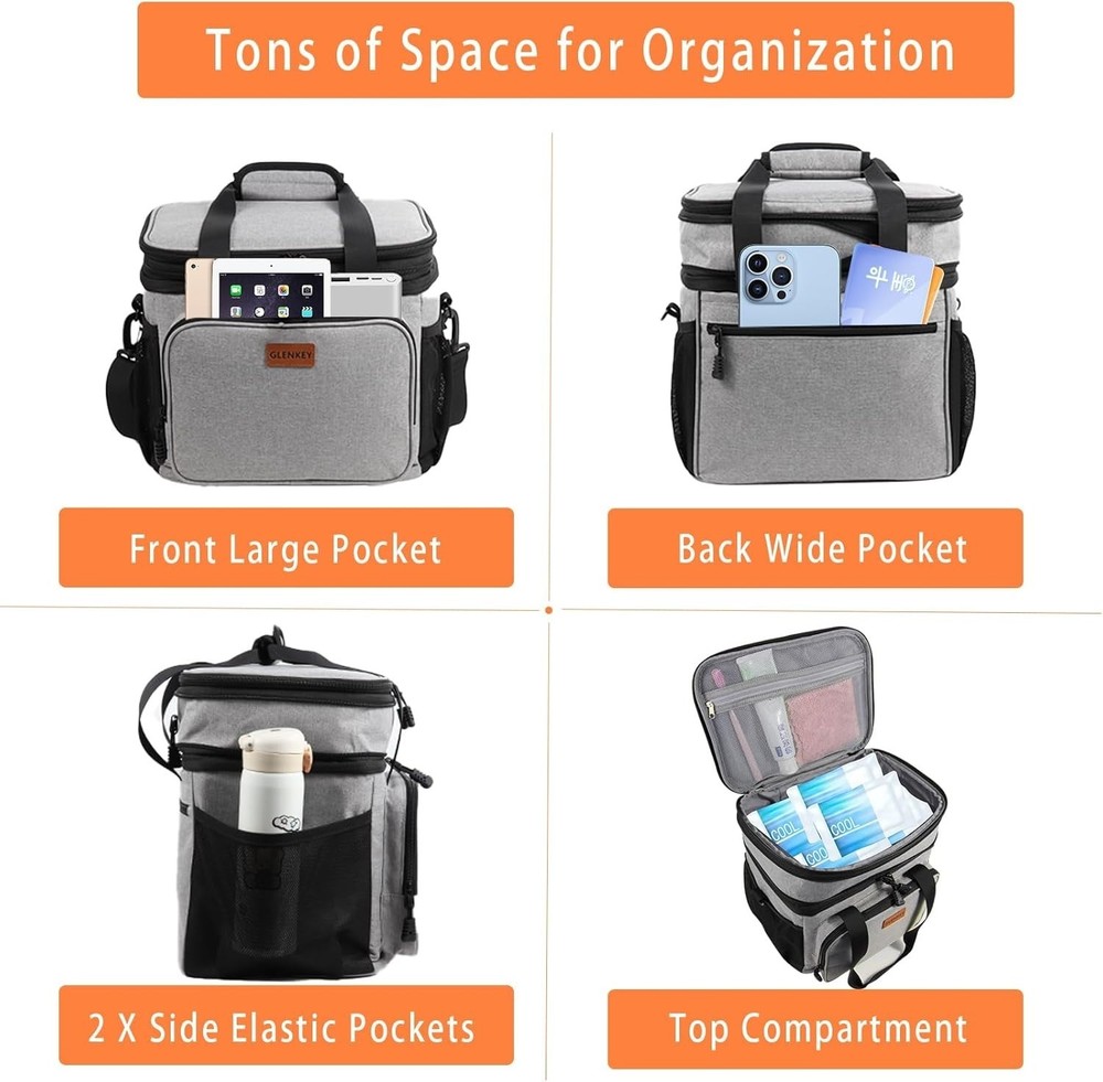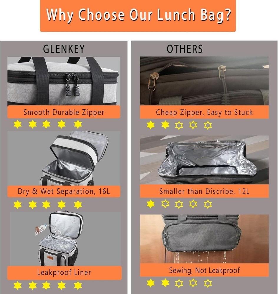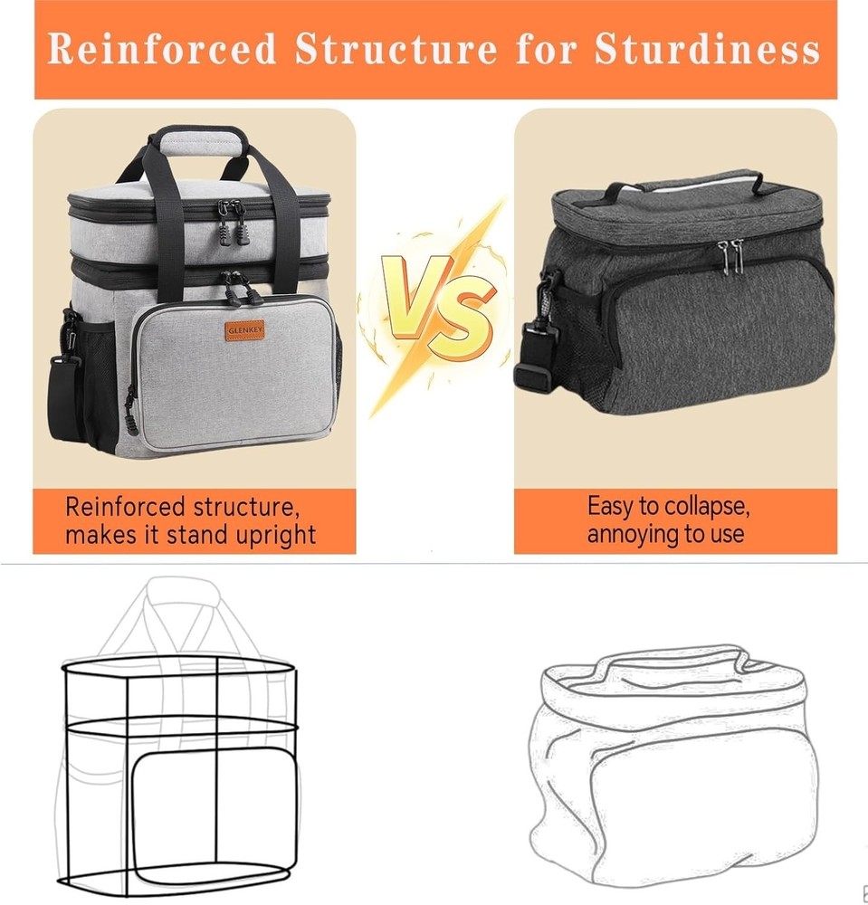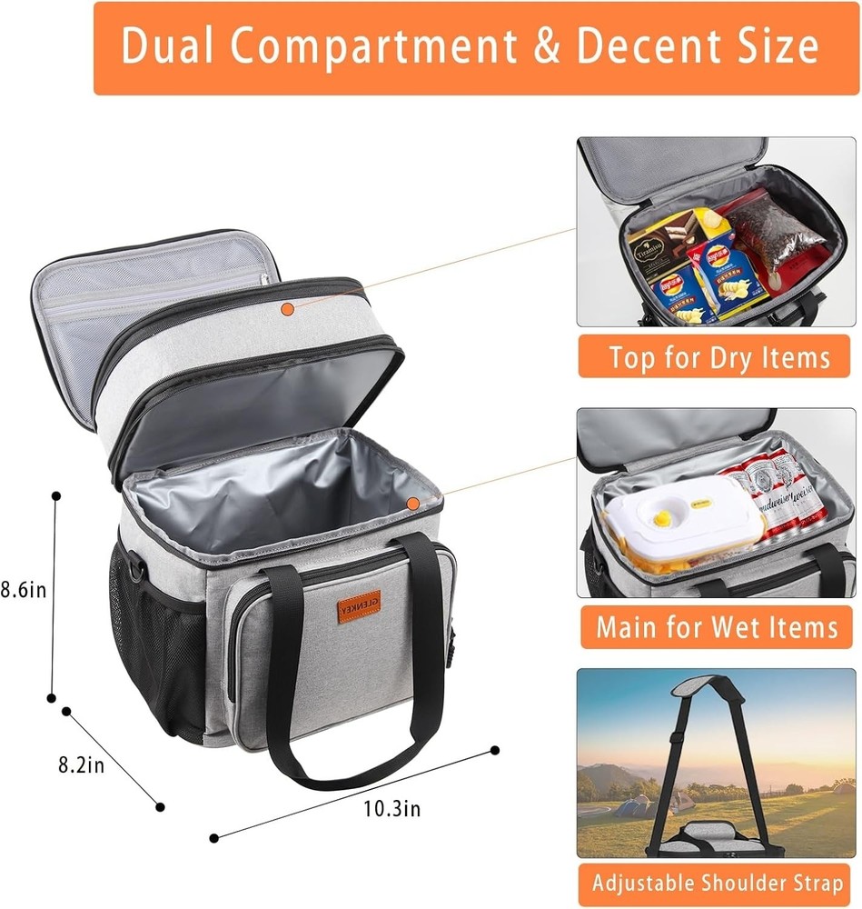 Color B-Gray Material Oxford Package Information Bag Capacity 16 Liters Product Dimensions 8.46"D x 11.22"W x 12.4"H Special Feature Expandable Design, Heavy Fabric, Keep Hot and Cold, Leak Proof Included Components Adjustable Shoulder Strap, Insulated Lunch Box Recommended Uses For Product Camping, Picnic Product Care Instructions Hand Wash See less About this item Large Capacity with Expandable Design: Maximum size is 16L, fits 20 cans of soda(350ml). Dual Compartments for different uses, the top compartment of the insulated lunch bag is expandable, increasing the capacity by 4L. Normal size with 12L, handy to use for work, outing, construction, picnic, camping, day trips, and so on Water-Resistant & Leakproof:The outer fabric is made from durable water-resistant material, protecting your lunch and stuff inside from little water or rain. Our lunchbox can bear weight up to 10kg. Thickened lining and the one-peace heat-pressed process ensure against leaks and are easy to clean. So it’s suitable for drivers, soldiers, construction workers, athletes, and so on Better Insulation Performance: 6mm thick insulation liner helps keep your food cold or warm at the right temperature for up to 8 hours. Foods that need to be kept separate from wet and dry can be stored in the top and bottom compartments Solid Structure&Multi-Use: 4 Versatile pockets on the side designed for storing cellphone, portable charger, wallet, card, water bottle, drinks, and more! The black lunch box adopts a skeleton structure, with a super stereoscopic appearance Versatile Lunch Box: Well-padded shoulder strap and sturdy handles make the large lunch box easy to transport even when fully loaded. GLENKEY heavy duty lunch cooler bag is a spacious, comfortable lunch cooler