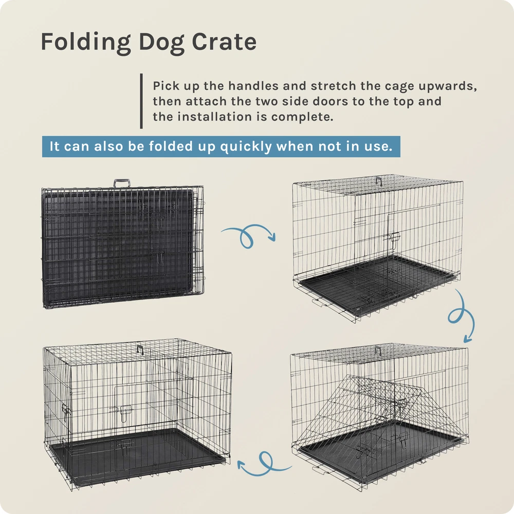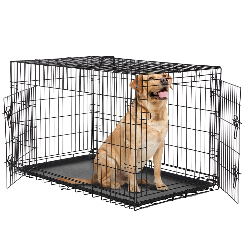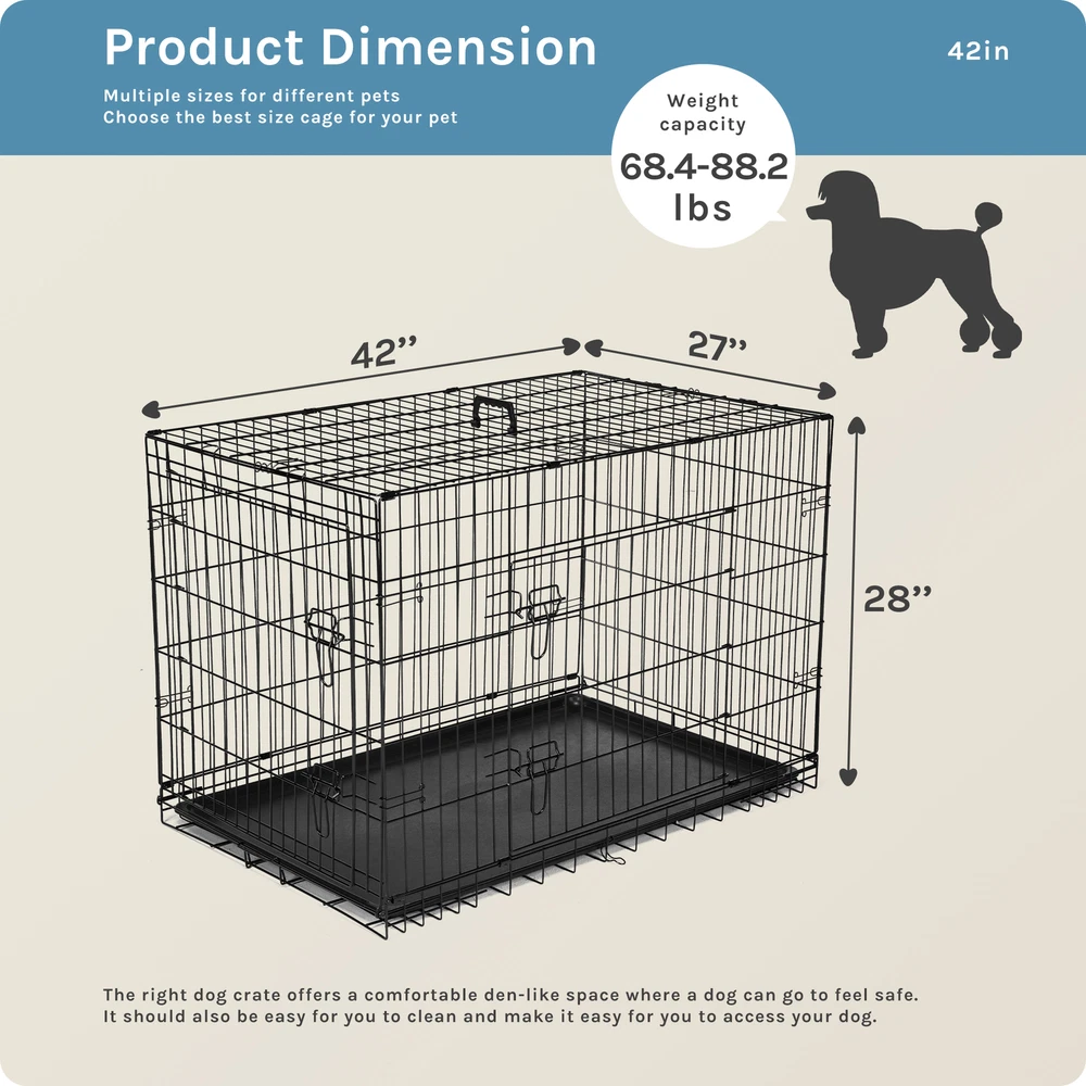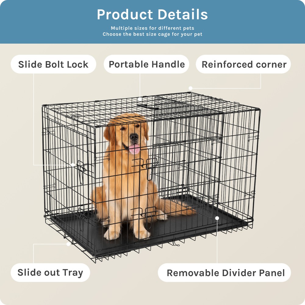 1. Spacious and adjustable: This double door dog cage comes with a divider panel that allows you to customize the size of the interior space to accommodate your dog's needs as they grow. The spacious design provides ample room for your pet to move around comfortably. 2. Durable construction: Made of folding metal wire, this pet kennel is sturdy and long-lasting, ensuring the safety and security of your furry friend. The durable materials provide a secure environment for your pet, whether indoors, outdoors, or during travel. 3. Easy access and versatility: The double door design of the dog cage allows for convenient access to your pet from multiple sides, making it easy to place or remove your dog from the kennel. The versatile design is suitable for a variety of environments and situations. 4. Leak-proof pan tray: The plastic leak-proof pan tray at the bottom of the cage helps contain any messes or accidents, making clean-up quick and easy. The tray can be easily removed and cleaned for added convenience. 5. Foldable and portable: The folding design of this metal wire pet kennel makes it easy to set up, take down, and transport. Whether you're using it at home, in the yard, or on the go, this dog cage provides a secure and comfortable space for your pet.
