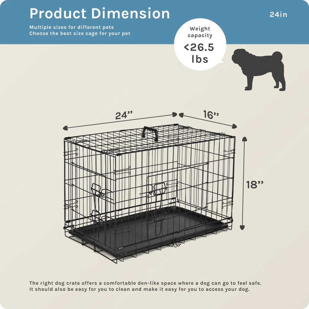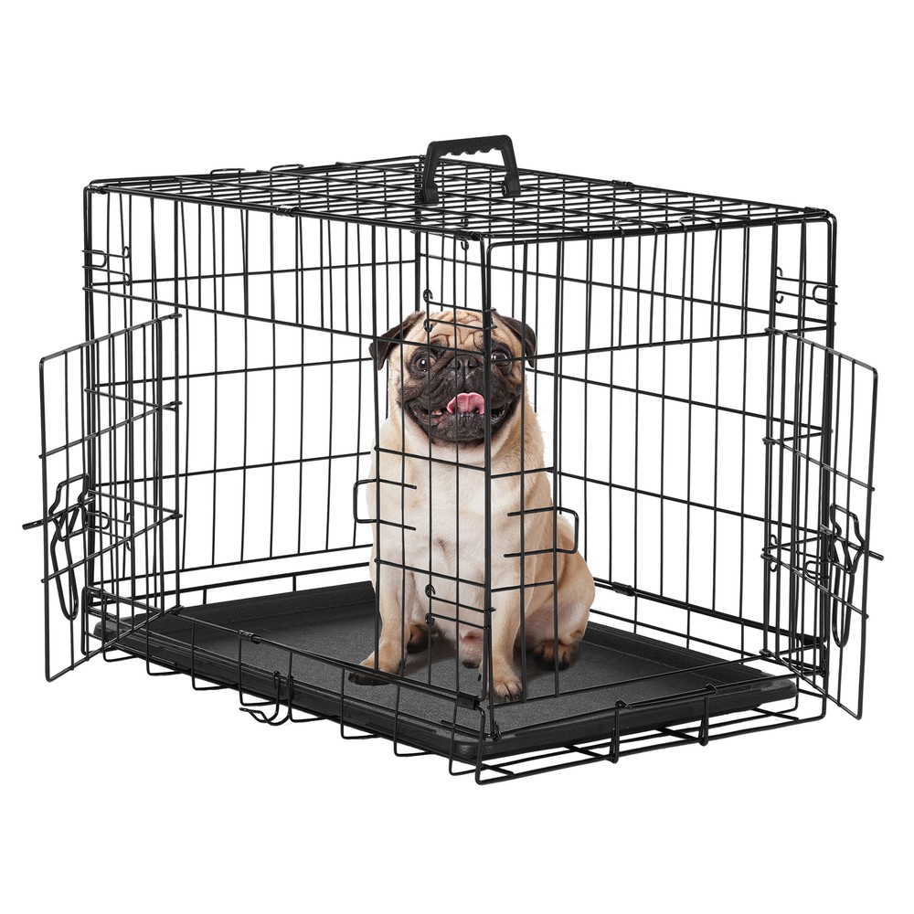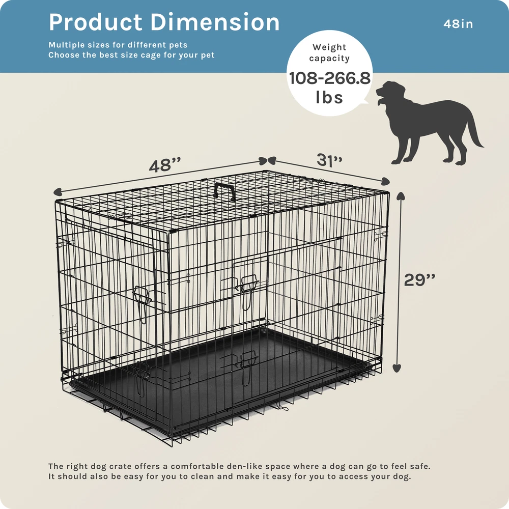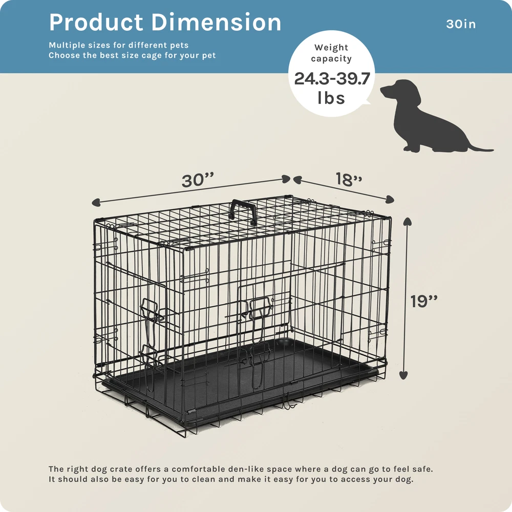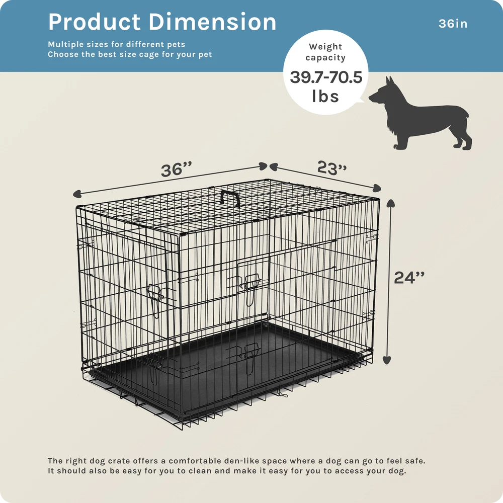 1. Spacious and adjustable: This double door dog cage comes with a divider panel that allows you to customize the size of the interior space to accommodate your dog's needs as they grow. The spacious design provides ample room for your pet to move around comfortably. 2. Durable construction: Made of folding metal wire, this pet kennel is sturdy and long-lasting, ensuring the safety and security of your furry friend. The durable materials provide a secure environment for your pet, whether indoors, outdoors, or during travel. 3. Easy access and versatility: The double door design of the dog cage allows for convenient access to your pet from multiple sides, making it easy to place or remove your dog from the kennel. The versatile design is suitable for a variety of environments and situations. 4. Leak-proof pan tray: The plastic leak-proof pan tray at the bottom of the cage helps contain any messes or accidents, making clean-up quick and easy. The tray can be easily removed and cleaned for added convenience. 5. Foldable and portable: The folding design of this metal wire pet kennel makes it easy to set up, take down, and transport. Whether you're using it at home, in the yard, or on the go, this dog cage provides a secure and comfortable space for your pet.