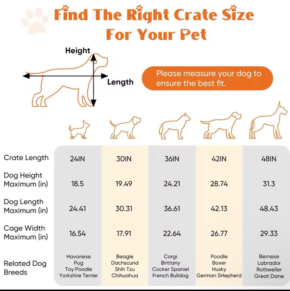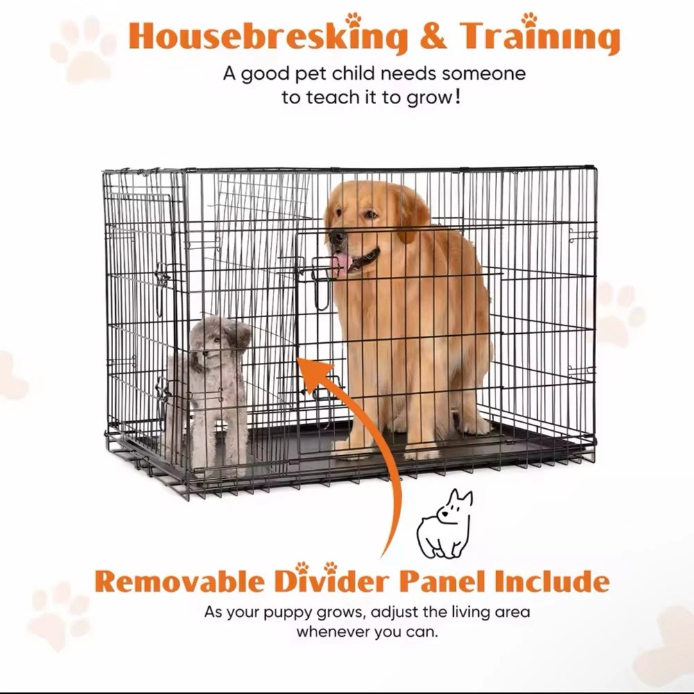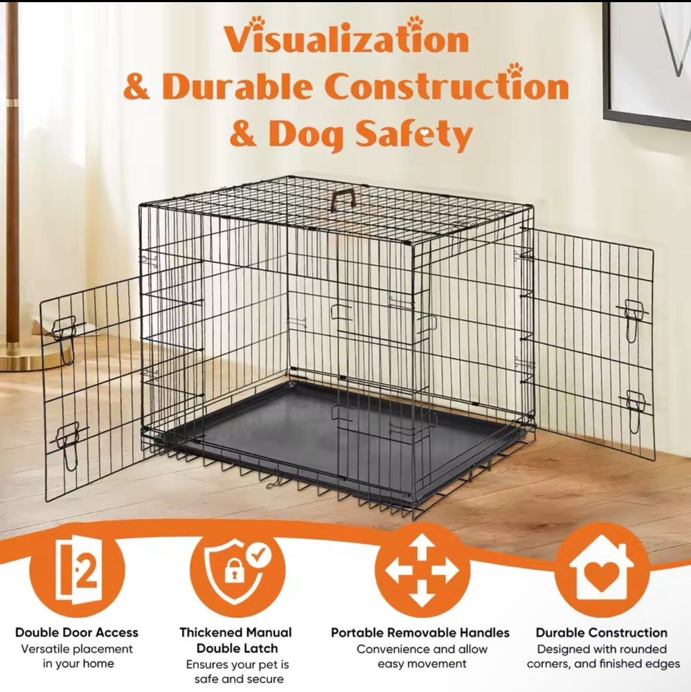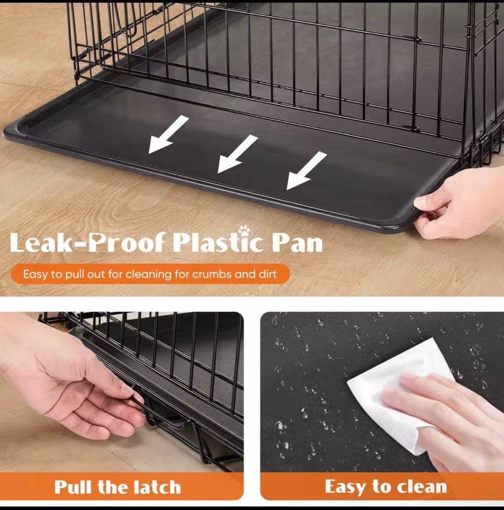 ENHANCED SECURITY: With rounded edges, smooth rounded corners and matching accessories, our dog crates prioritize safety. Thick metal mesh and double doors with 2 heavy-duty sliding bolt locks not only prevent your dog from escaping, but also provide optimal protection for your pet; DURABLE: Our dog crates are made of high quality materials for durability. The sturdy construction ensures that it stands up to wear and tear, making it a reliable choice for long-term use. The double door (one door on the front and one on the side) design feature also makes it easy to place and use in any space. EASY TO CARRY: Our dog crate is collapsible, giving you the flexibility to take it with you wherever you go. Folded for space-saving, easy storage, it's perfect for traveling, camping, or any on-the-go adventures with your furry friend. MAXIMUM COMFORT: The spacious interior of our dog crate ensures that your pet feels comfortable and secure. The open, breathable design promotes air circulation, and the dividers help with dog training and create a comfortable environment for your pet to relax. EASY TO CLEAN AND MAINTAIN: Our dog crate features a durable, leak-proof ABS composite tray that is easy to clean and maintain. It resists stains, warping, corrosion, and odors, ensuring a hygienic and comfortable environment for your pet.