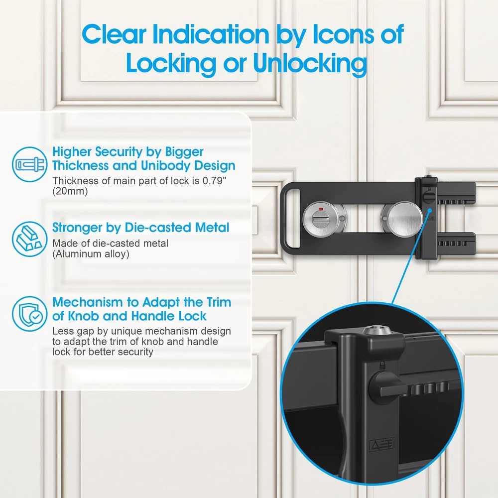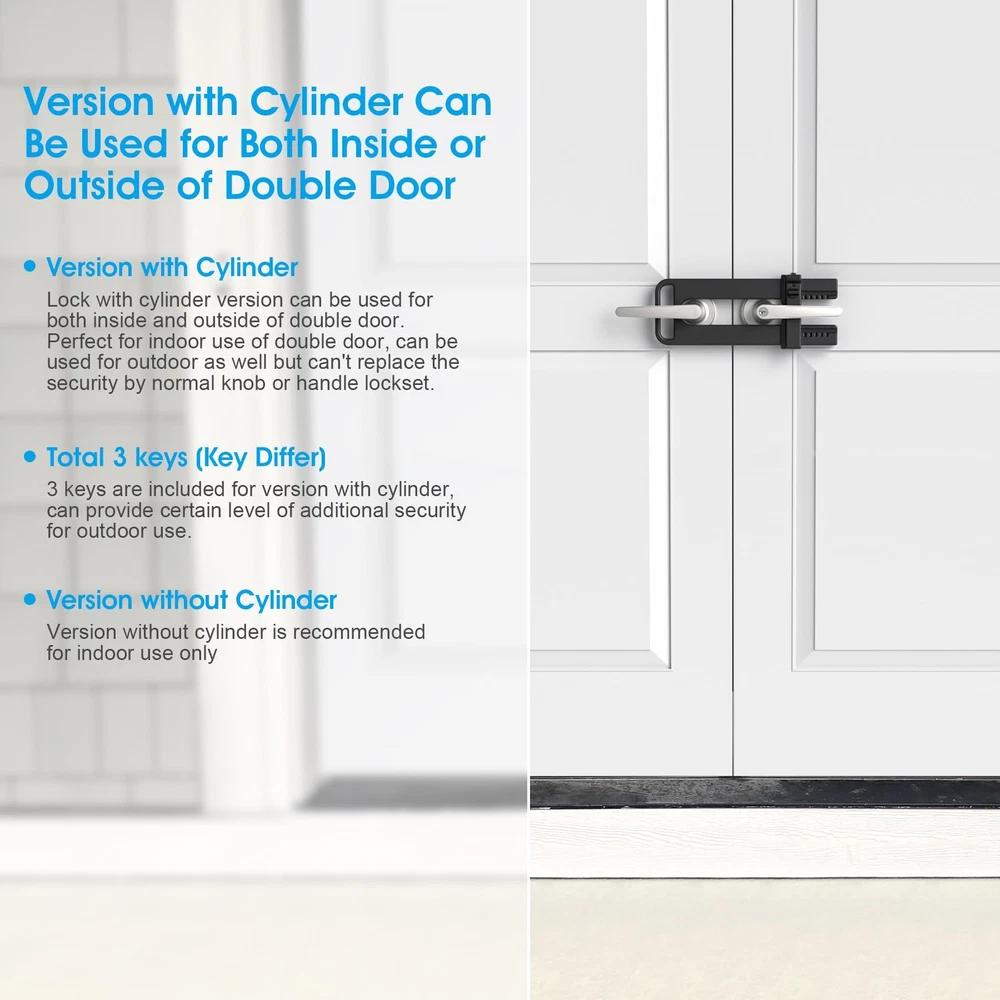 This double door security device is with cylinder and 3 keys for both indoor and outdoor use, it is dedicated for french door hardware for double doors. By made of diecasted metal, it provides extra security for your interior or exterior doors including bifold and closet doors. Cylinder and 3 keys are included for considerate baby proof, child proof, kid proof, dementia patient proof, burglar proof, toddler proof and pet proof when it is used for interior doors except the function of home safety as reinforcement lock and door barricader. For outdoor use, it is an additional security along with your normal knob set and handle set for your home safety and loved ones. Because of the good design, this double door latch lock is also applicable for D handle locking like a guard door lock. Please verify the application dimensions before ordering. Please also be aware this is a portable door lock and no drilling door lock for home safety, it is more suitable for home use instead of travel use. [Sturdy and Durable Double Door Lock]: This double door lockout device is made of diecasted solid aluminum alloy with unibody design, it is a high quality solution as double door lock with key and french door lock, 3 keys are included for internal use or external use. It provides extra security as door barricade or double door security device. [Suits for Knobset and Handle set]: This dementia door lock for double door and french door as double baby proof double door handle lock, is designed with bigger range of adjustment, it suits most of knobset and some handleset with tighter locking, locking status indications are presented clearly. It can be used as a portable door lock, removeable door lock and no drilling lock without any installtion. [Perfort for Indoor Use and Also Workable for Outdoor use]: The double door lock for kids safety can be a perfect solution of extra lock for door from inside, because of the cylinder and keys, it can provide additional security for burglar proof door lock (remark: it can not replace the normal handleset or knobset from safety point of view). It is like a smaller but strong double door barricade security bar. [Bigger Range of Locking Adjustment]: Please verify the dimension before placing order. Thought the lock has big range of adjustment to suit most double door lock set, still please check your french door lock, bifold door lock, closet locks for double doors and double door locks for front door or double door lock for interior french doors. Please check the dimensions before purchasing to prevent potential issue on application. [Quality Service]: Worry-free return policy (30 days) and 24/7 email support, welcome to contact us for any problem during lifetime of this double door barricader and kid proof double door lock.