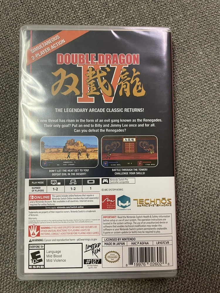 Game Name:Double Dragon IVRegion Code:Region FreeUPC:0819976026026MPN:LR107CVRPlatform:Nintendo Switchgtin13:0819976026026Rating:E10+ (Everyone 10+)Genre:Beat 'Em UpSub-Genre:Not ApplicableRelease Year:2021Publisher:Limited Run Games