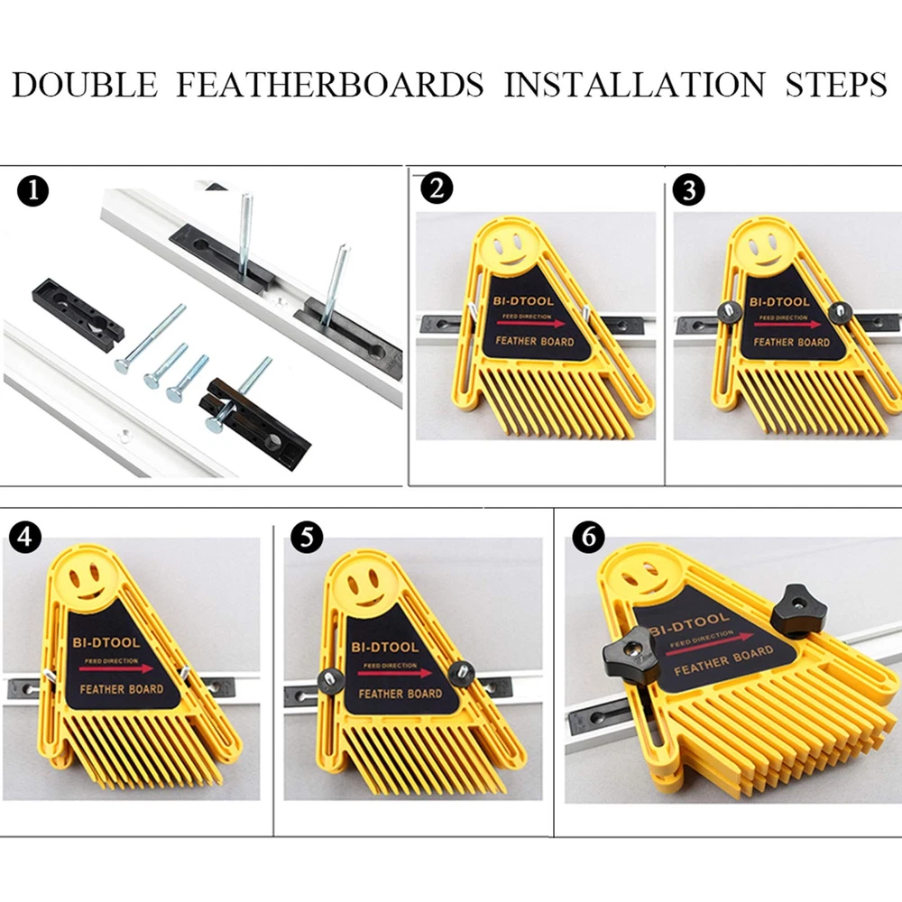 ABOUT THE FEATHERBOARD: We use a lot of different jigs in our shops and none is probably more simple than a feather board buddies. It's got a row of flexible fingers along the edge and when you mount it to your machine table it helps keep work pieces press down tightly to the table and over against the fence. The table saw jig builds accuracy and control in our cutting or machining operations and it can also help prevent a dangerous kickback from happening. A good woodcraft supply also acts as a third hand when you're running long stock through your machine or wide sheet. How to use: 1. Turn off the power 2. Place and align the logs you want to process 3. According to the size of the track, install the self-locking plastic slider 4. Install bolts (short for one piece and long for two pieces), put the spacers (thin for one piece and thick for two pieces ), then lock knobs to the featherboard tightly. Guaranteed: We offer premium quality products with outstanding . In the unlikely event you aren't 100% satisfied with your purchase, please feel free to . WIDELY APPLICABLE SIZE: Two widths Miter Bars(3/8 x 3/4 Inch)and t-slot bolts are applicable for most standard miter slots. And associated with wedge-lock hardware and split rail miter bar construction provide maximum hold for bandsaw table, router fence and more. RELIABLE MATERIALS: Our table saw featherboard is made from high-tech polymer and have special angled fingers so they can provide steady pressure which produces cleaner cuts with less chance of kickback, chattering or lifting. EASY TO INSTAll: Unique miter gauge slot with ergonomic knobs allows you set up the feather loc board to a miter slot or t-slot, aslo can be DIY as any accessories for woodworking you like. SAFETY FIRST: Featherboards holds the wood piece against the guide fence tightly to protect your hands and prevent kickback, blinding and bent blades. ACCURACY OF CUTS: Table saw feather boards design which includes ergonomic knobs and pre-load tension system provides consistent tension and maximum holding pressure to make your every cut accurate.
