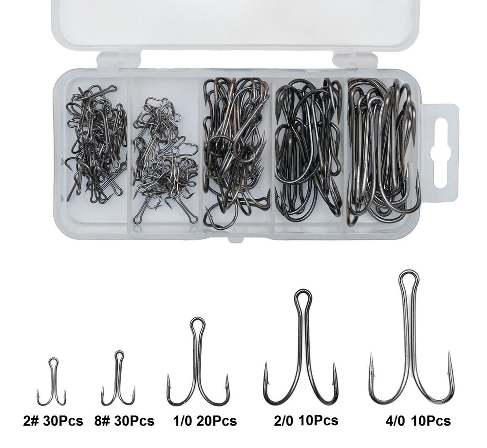 Upgrade your fishing tackle with our premium Double Fishing Hooks Kit, featuring 100 pieces of high-carbon steel hooks in various sizes (2#, 8#, 1/0, 2/0, 4/0) for versatile freshwater and saltwater use. These durable hooks boast a black nickel finish for superior strength and corrosion resistance, ensuring longevity and reliable performance. The wide-gap, needle-point design with perfect angle open shank minimizes snags and maximizes hook-ups, while the sharpened points ensure quick penetration. Ideal for frog-style lures, these hooks are easy to rig and come in a reusable plastic box for convenient storage. Safety note: Keep out of reach of children due to sharp points. 1. 100Pcs/box Kit: 2#(30pcs), 8#(30pcs), 1/0(20pcs), 2/0(10pcs), 4/0(10pcs) with a hard reusable plastic box. 2. Material: Double Hook is made of high carbon steel with black nickle for super strength and corrosion resistance. Strong double frog double fishing hooks. 3. Easy To Use: This double hook is one of the best to fit most frog style lures, can be quickly rigged onto lures without a split ring. They are designed to increase your hookup ratio by a lot especially when fish are not fully committed to the frogs. 4. Perfect Angle Open Shank: Designed with an extra wide gap with points angled perfectly to avoid snags. 5. Sharp Point Hook: The double fishing hooks with sharpened needle points can pierce fast and barbs prevent predators from running away. 6. Please Note: The Hooks are really sharp, so care should be taken when handling them and DO NOT Put it on the place where children can take it easily.