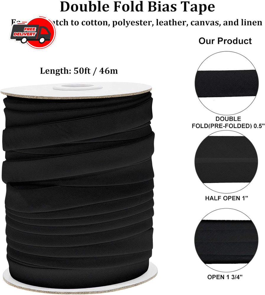 Size information: width of bias tape is approx. 1/2 Inch, length is 50 yards, easy to sew by hand or machine to make straight or curved edges; This tape is not completely continuous due to the length and nature of the textile Convenient for using: our double fold bias tape is pre-folded so that you don't need to iron it before using, helping give your finishing touch to necklines ruffle edges, pockets, inside seams and on single faced hems for a quality finish to your garments Compatible tape: this sewing bias tape is compatible with many crafting tools, multiple bias tape makers and bias tape insertion tools included Quality material: our double fold bias tape is made from polyester fabric, sturdy and durable, colorfast and bleeding-free; Machine washable, and non-stretch Wide usage: can be applied on many materials, including polyester, leather, canvas, and linen as color accents on folded apparel or to give a seamless finish to a beautiful handcrafted quilt