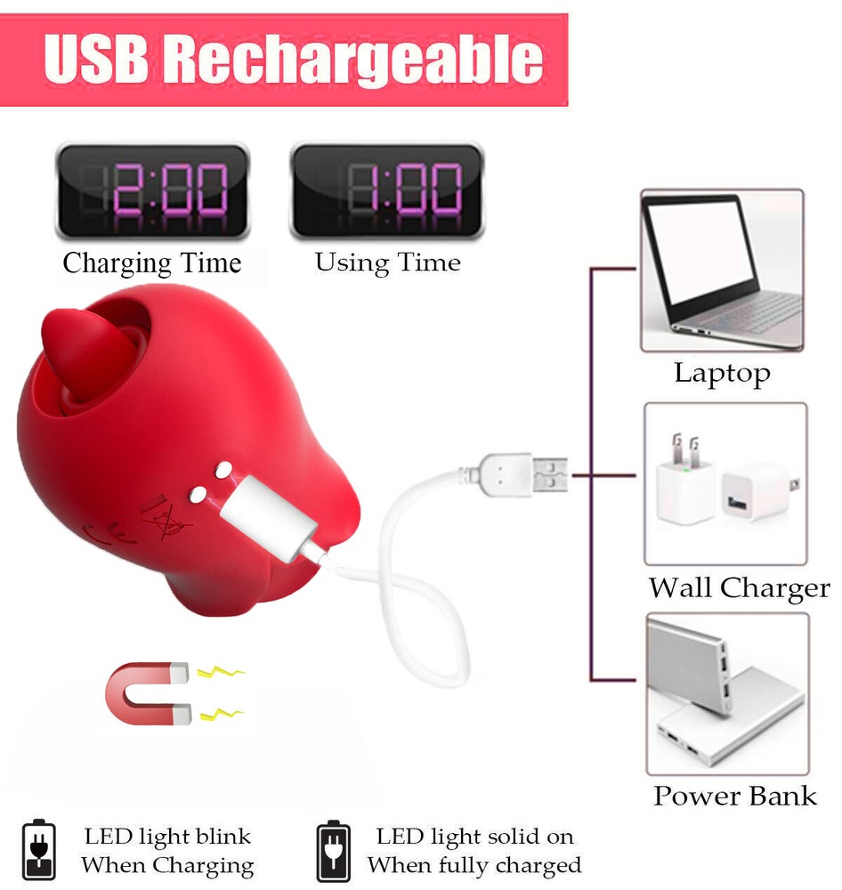 100% new and high quality Life waterproof,easy to clean Material: Medical grade silicone,ABS Pattern Setting: slight sucking+6 vibration/Licking modes Power Source: USB Magnetic Charging Charging time: 2h Working time: 0.5-1.5h Noise: Less than 60db Size: 2.68inx1.77in Color: Red Package: discreet shipping , not any sensitive words on package Package List: 1 x rose vibrator with box 1 x charge cable 1 x user manual How to Use: ---press and hold the power button for 3-5s to turn on/off ---then click to change frequencies Notice: --- Clean with soap before and after every using. --- Do not use cleaners containing alcohol, petrol or acetone --- Do not place in boiling water or soak ---Do not use on swollen or damaged skin ---pls get full charged before first using.