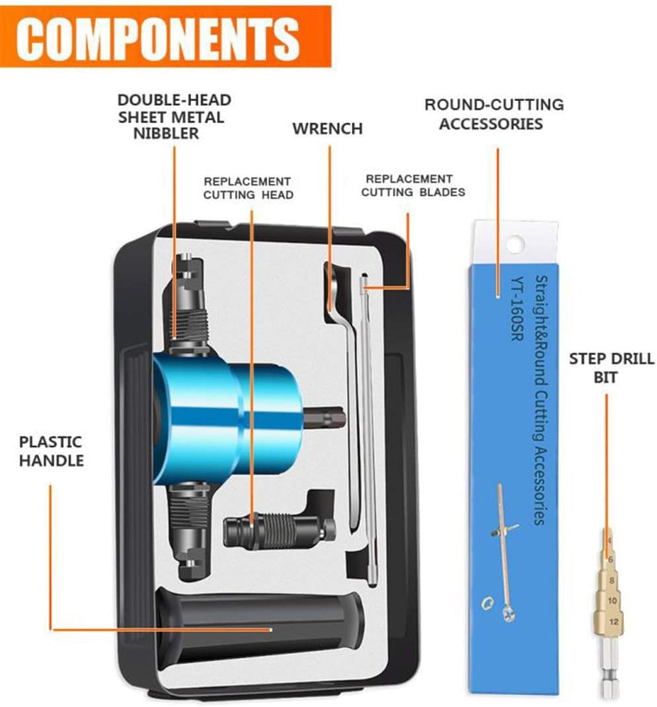 Easy and fast to cut 14 gauge material and creates a precision, burr free edge 360 degree double cutting head to cut straight line, curve line and circles HSS cutting blades to cut including but not limited to: Sheet metal, corrugated material, pipes, complex profiles, powder coated material, stainless steel, copper, aluminium, formica, plastic, fibreglass Fits any drill that works between 1500-3000 RPM, More easy and powerful than normal shears and snips REXBETI Metal Nibbler