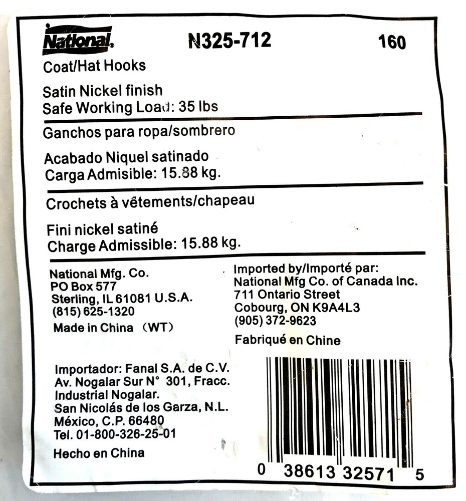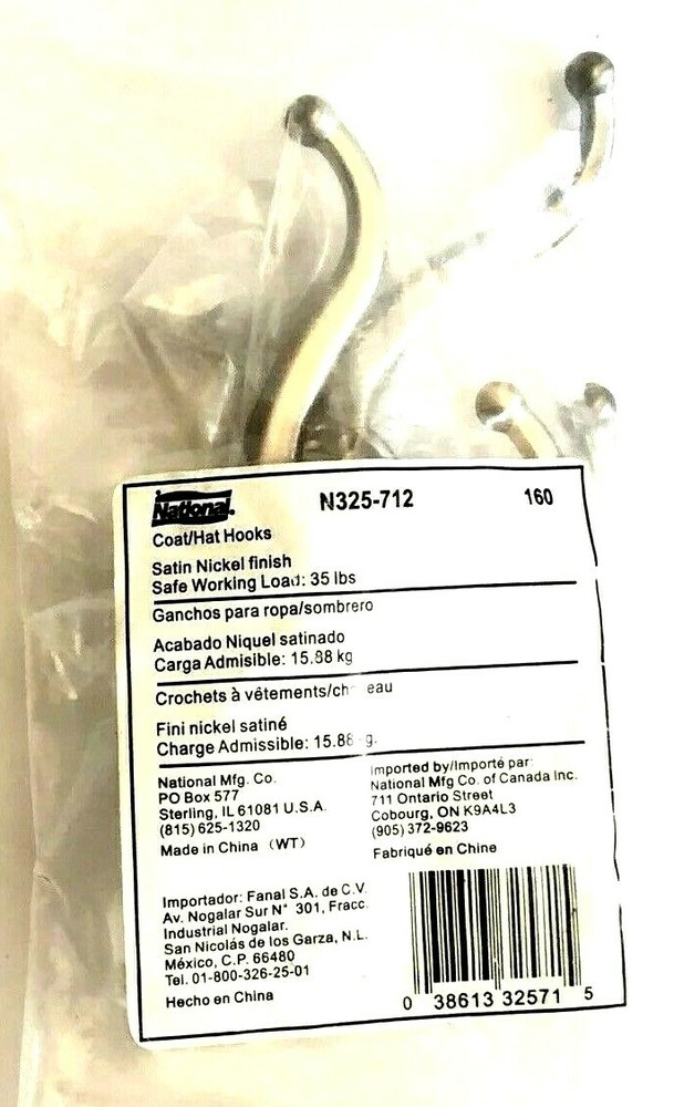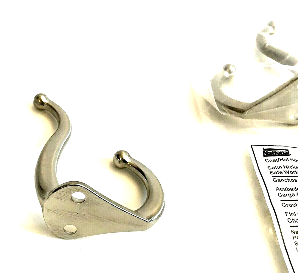 (2-CT.) Double-Hook Hangers for Coats, Hats, Etc. Holds up to 35 lbs. Safe Working Load (SWL) 3" Projection Wall Mounting Satin Nickel Finish Fasteners included for installation Finish Satin Nickel MPN N325-712 Dimensions 2-3/4" length x 1-1/8" width x 2" height Ideal uses Bedrooms, Bathrooms, Mud Rooms, Workshops, Closets, etc. Manufacturer National Mfg. Co., USA Condition Brand new, unused condition (see photos) (1034) You are purchasing what is shown in photos only. So if it is not in the photos don't assume, please ask questions. All photos are of the actual product(s) you will receive and are intended to help describe the quality and condition of the piece(s). We take pride in packing our products carefully and securely, so they arrive ready to install and use. We welcome any questions you may have about our products or requests for additional photos. Important Note: We ship most items out on the SAME DAY, if paid before 1:00 PM (E.T.) Check out more of our quality products by clicking on "See Seller's Store." We offer a wide selection of work/craft tools & supplies, unique gift ideas, and home décor solutions. Add Our Treasure Spot eBay Store (Rashel Design LLC) to your favorites, for regular updates on new treasure finds.