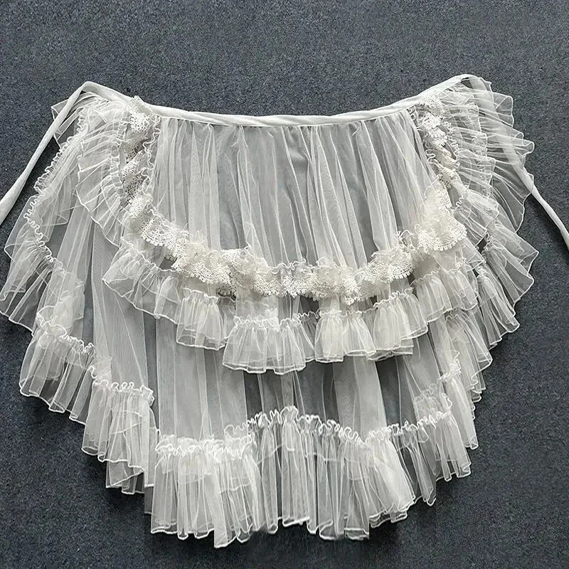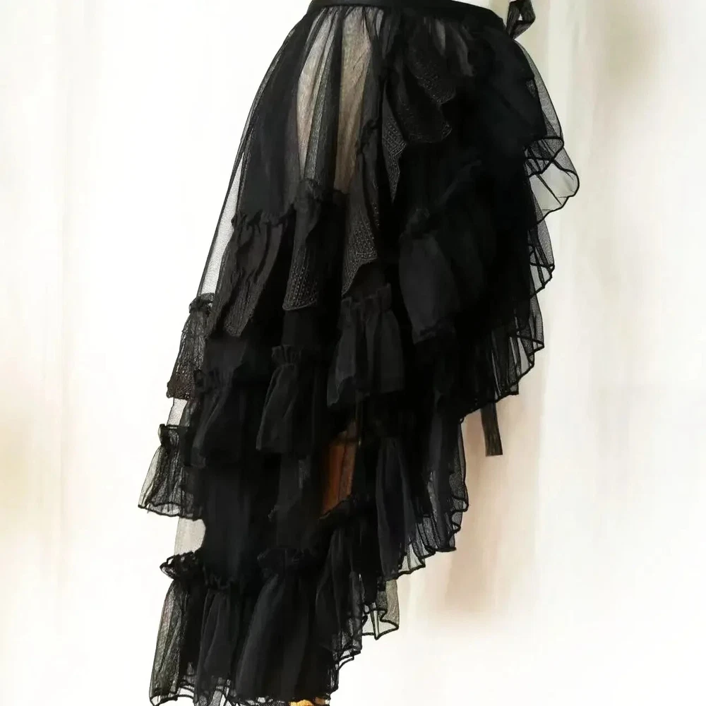 Double Layered Lolita Waist Curtain Sheer Cover Up High Low Skirt w. Asymmetrical Ruffles Fabric: mesh Features: layered ruffles Note: please select the skirt length according to your needs Order processing time: 10 days Skirt Size in CM Size Waist Hemline XS 58-65 360 S 62-70 360 M 64-74 360 L 70-80 360 XL 80-86 360