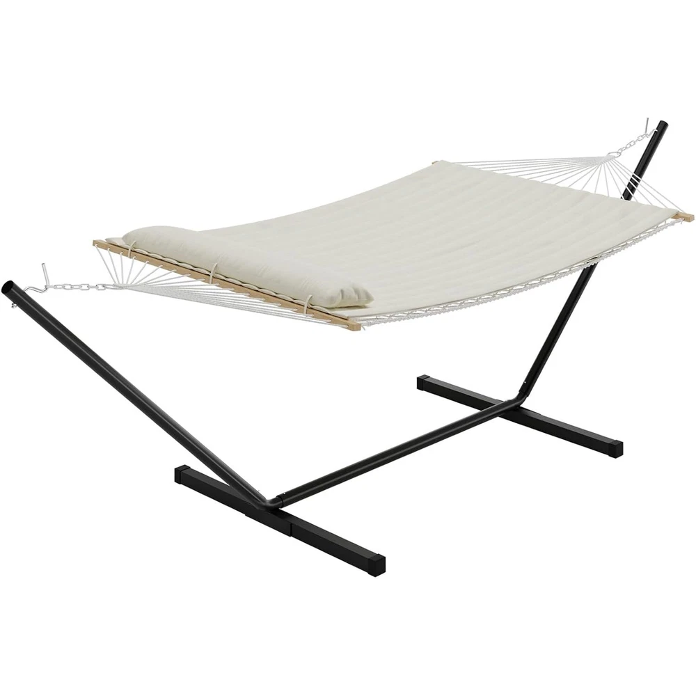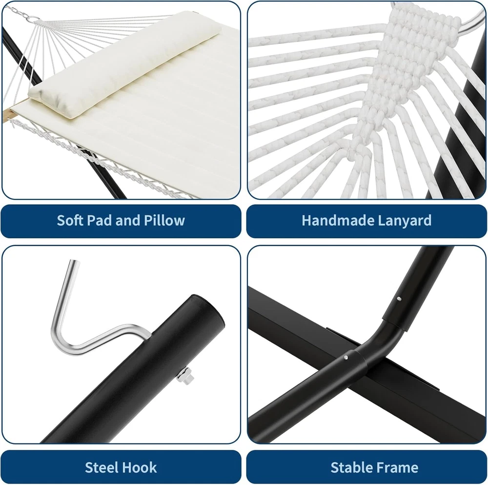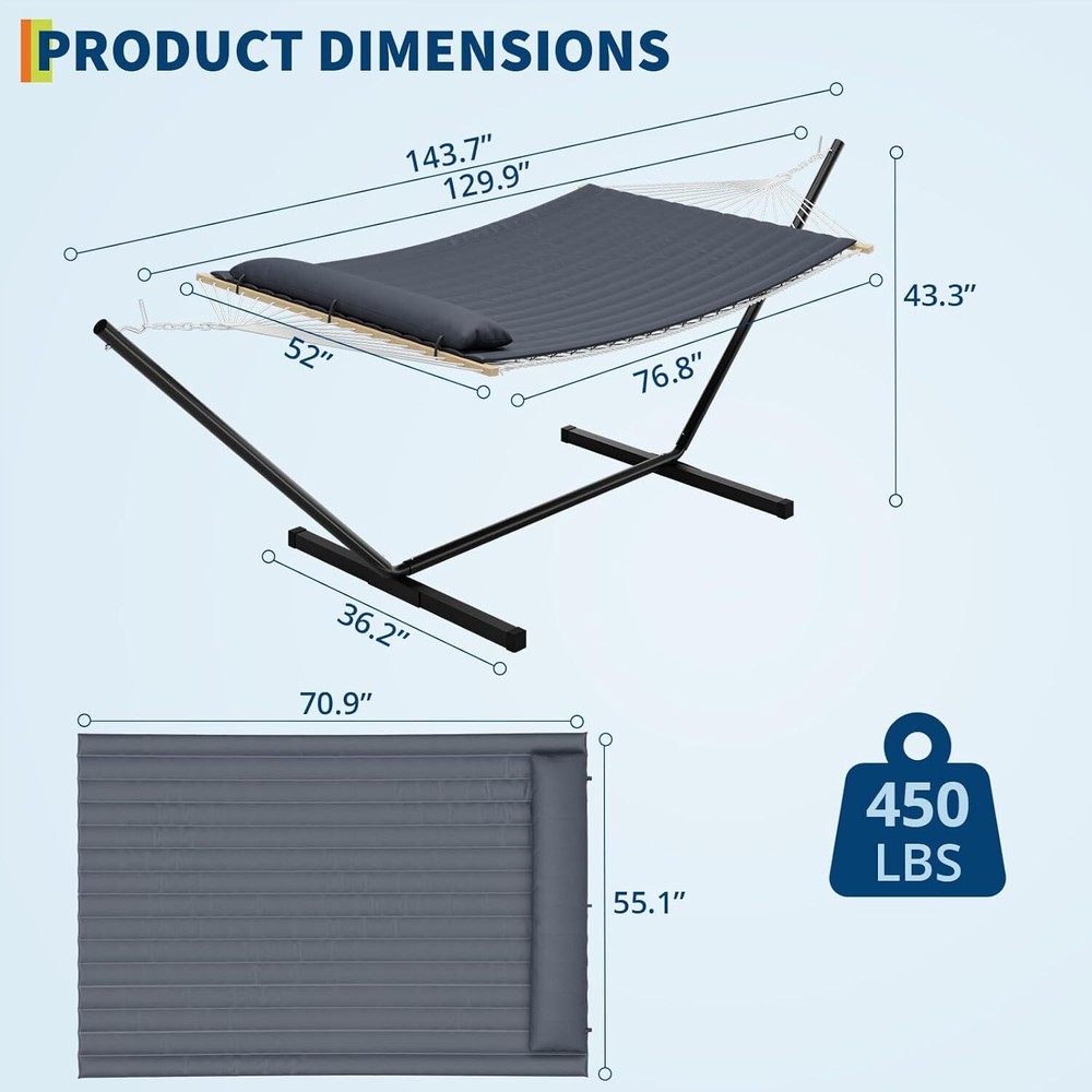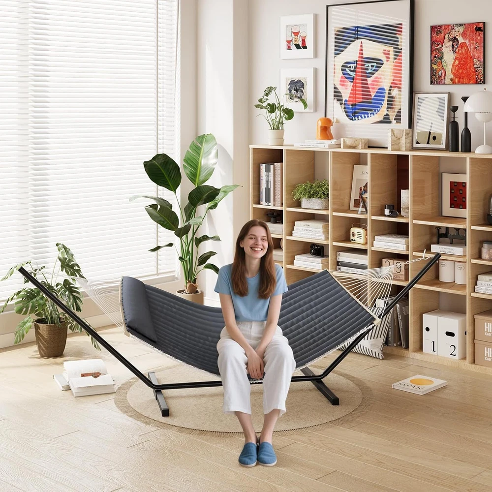 Double Quilted Fabric Hammock Two Person Hammock with Stand 480lb Capacity Ergonomic Design: Enjoy the comfort with our double hammock, featuring a 450lb capacity that prevents sagging, allowing two people to relax together effortlessly. Easy Assembly: Set up your hammock in minutes! Simply unfold the pre-assembled steel stand and clip the hammock’s carabiners—no tree damage required. Stable & Durable: Our hammock boasts reinforced joints and a wide-leg design, ensuring stability on grass, sand, or uneven ground for worry-free relaxation. Versatile Use: Perfect for camping, poolside lounging, garden retreats, backyard gatherings, or even cozying up in your living room—wherever you want to unwind! Handmade Quality: Crafted from soft PP cotton with a comfortable pad and pillow, our hammock combines style and function, making it a beautiful addition to your outdoor space. Transform your outdoor space into a serene retreat with our Double Hammock, designed for comfort and convenience. This two-person hammock comes complete with a sturdy steel stand, making it perfect for your backyard, garden, or even your living room! Product Details With PP Cotton Cushion and Pillow This hammock comes with PP cotton cushion and pillow, so you can lie comfortably and completely relaxed on it. Dual Purpose Hammock You have the option of laying down the mat or removing the mat, in both cases you can use this hammock and you can cozy up to it. Stable Frame The frame structure of this hammock is solid and sturdy, not easy to collapse, you can safely and securely lie on it to relax! Payment Delivery details Terms of sales About us Contact us Payment We accept Payoneer only. All major credit cards are accepted through secure payment processor PayPal. Payment must be received within 7 business days of auction closing. If you have bought multiple items from me, you can send me one payment for all the items instead of paying for them individually. When you click the Pay Now button, eBay will automatically determine if there are other items you have won or purchased from me and will combine them for your review. NOTE: Import duties, taxes and chargers are not included in the item price or shipping charges. These charges are the buyer's responsibility. Please check with your country's customs office to determine what these additional costs will be prior to bidding buying. Delivery details 1. We will delivery out at the handing time when we receive the payment. 2. The delivery time is 3-5 business days to US by usually time.The parcel maybe delay 1-2day of the weekend.Due to the bad weather,Holidays,Hot Season ect.the parcel maybe delay,If you have any problems,mssage us,we will try our best to solve it. 3. We ship to your eBay address. Please make sure your eBay address is correct before you pay. 4. If you want to change the shipping address,message us before our send out. 5. We cannot deliver your order if your state is PR. Terms of sales 1. If you donot receive the items at the delivery time,the parcel has broken/missing,Please message us before you open case/return,we will try our best to solve it. 2. We offer a 30 day return policy from checkout winning date. 3. An RMA number is required for all returns. Message us for return instructions. Items Returned without a RMA number will not be processed. 4. Items defective upon receipt must be packaged in their retail packaging as if new and returned with a detailed description of the problem. 5. Return shipping fees are not refundable. We reserve the right to decline any returns if the above guidelines are not followed. About us If you are not satisfied with the item for any reason, please do not quick to leave negative/neutral feedback even open request and case without any communication with us. We devote ourselves making EVERY CUSTOMER in Satisfactory and resolve any problem. Thank you for your understanding and recognition,we are always leave positive feedback to all our customers. Contact us All replies will be sent to your email box, if you do not get response within 24 hours (Sat. & Sun. excluded) please check your eBay My Messages in case that our emails will be filtered automatically by your settings. Assembly Required Yes Brand Unbranded Features Double, Portable, Quilted, Spreader Bar Indoor/Outdoor Indoor/Outdoor Item Weight 18.6 kg / 41.01 lbs Material Quilted Polyester and Cotton Model Double Quilted Fabric Hammock Seating Capacity Up to 2 Theme Sports Type Camping Hammock Unit Quantity 1 Unit Type Unit Weight Capacity 450 lb