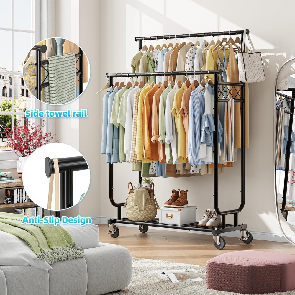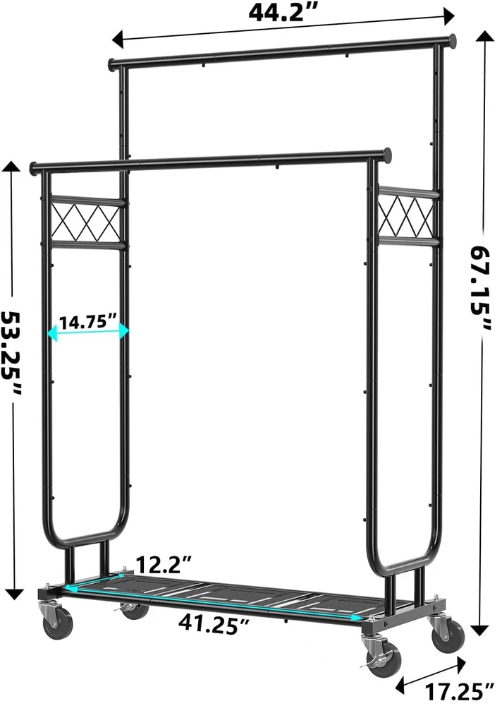 1 1-Multifunctional: This clothing rack is designed as a high-low rod style, the hanging area gives you enough space to place your clothes, shirts, pants, and even long skirts. The bottom shelf is great for storing shoes, or storage boxes. 2-Movable: There are 4 wheels with 360°rotation on the clothes rack, and 2 lockable wheels allow a stable stop. At the same time, the wheels will not make noise or scratch the floor when moving. 3-Save Space: This portable garment rack fits anywhere you want, such as your bedroom, living room or entryway, organizing and storing your clothes to make your room neat and clean. 4-Heavy Duty Clothes Rack Load 450 lbs: All-steel heavy duty clothes rack is solid and sturdy to hold up to 450 lbs. It can meet all your extra garment storage needs. 5-Easy to Install: The clothes rack has a detailed manual and installation tools attached,please confirm the number of parts and read the product manual carefully before you start assembling.