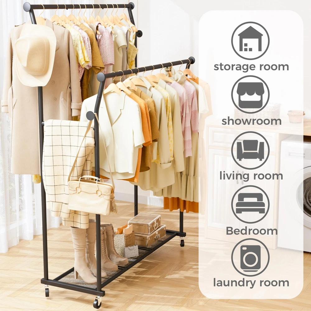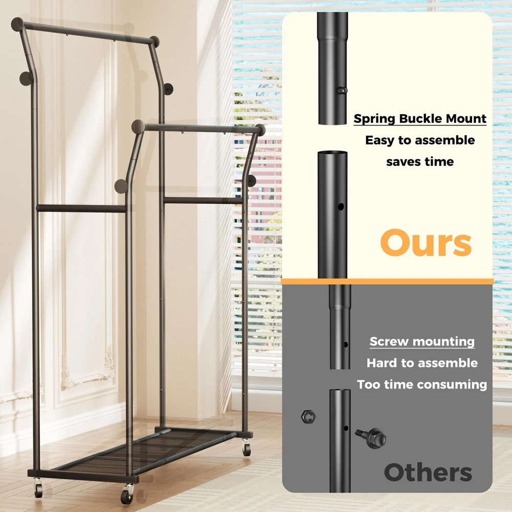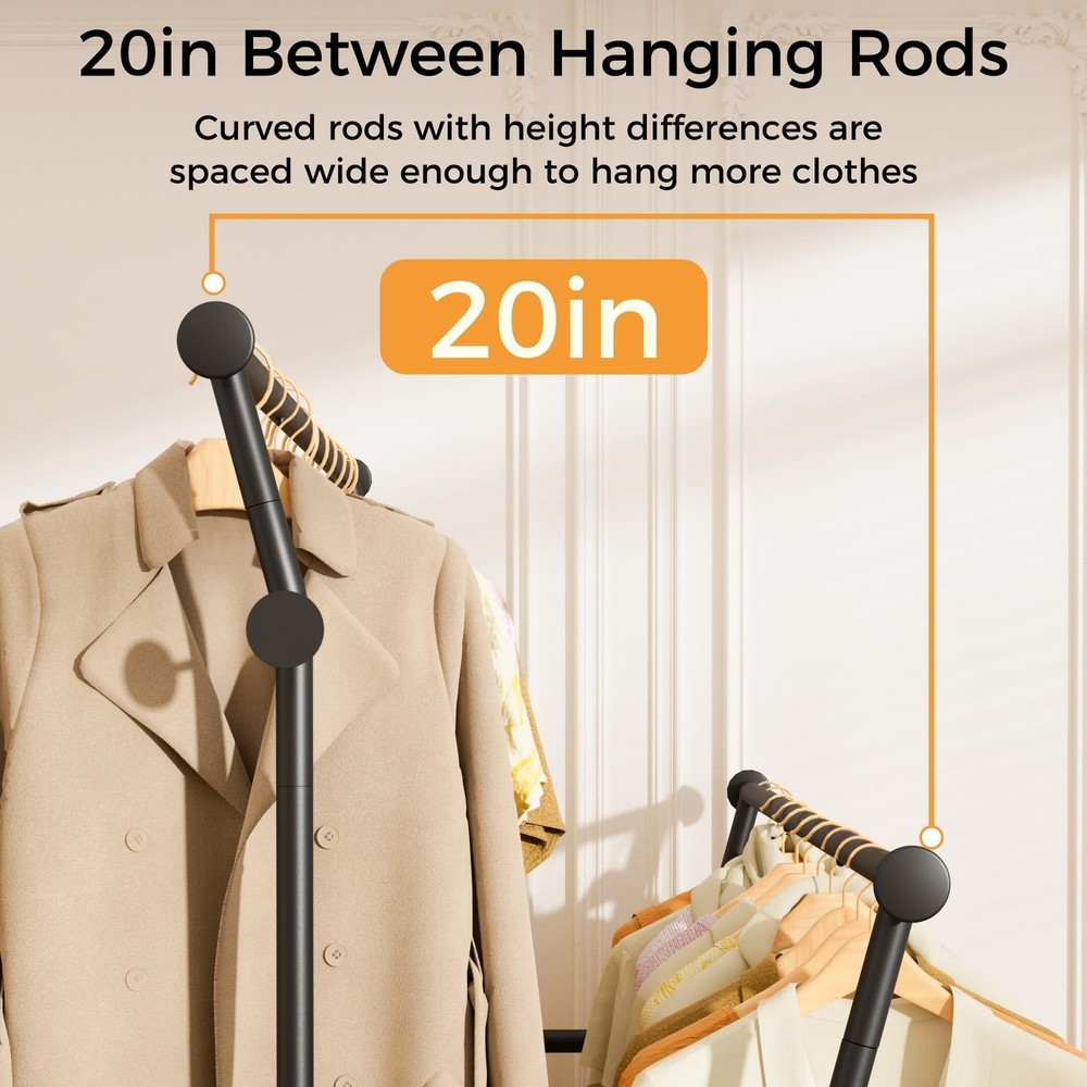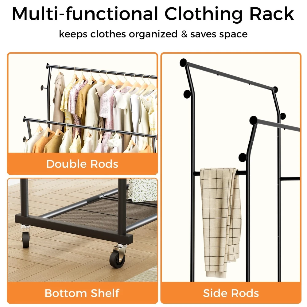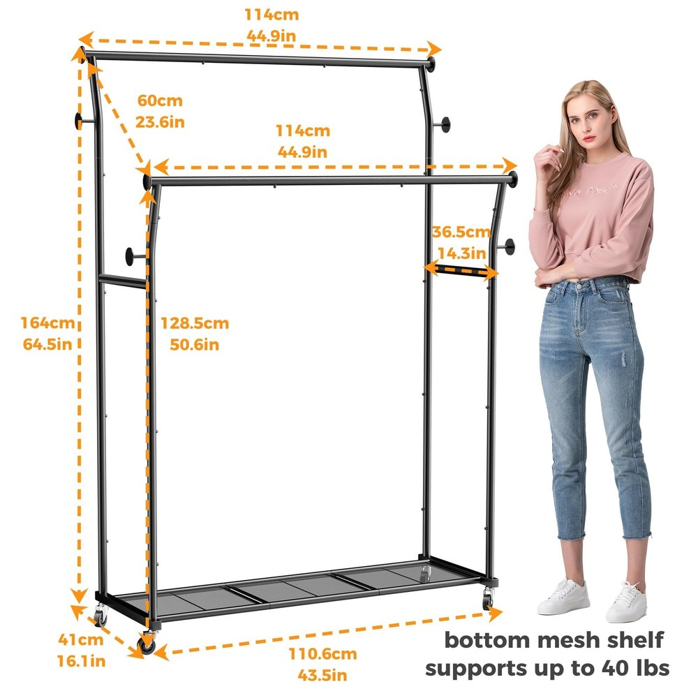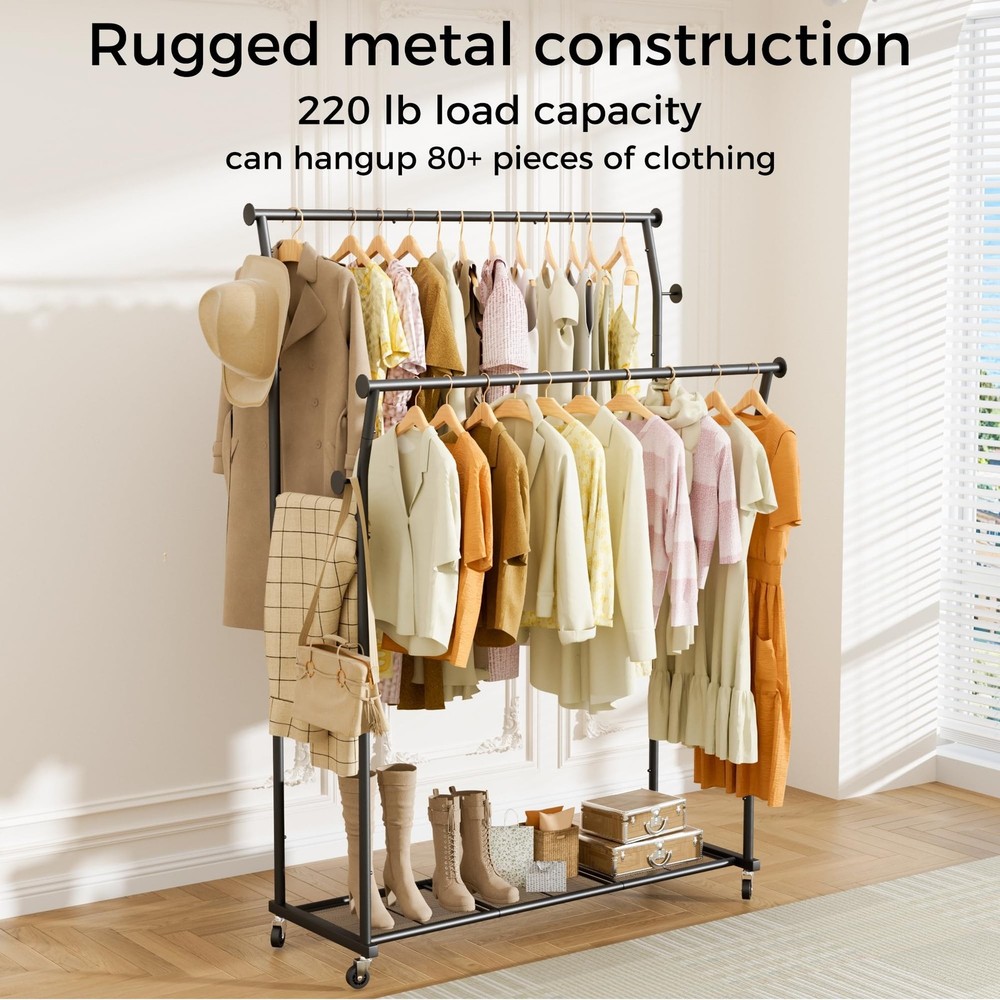 Double Rods Clothes Rack, Rolling Clothing Rack for Hanging Clothes with Hooks&Mesh Shelf, Portable Wardrobe Rack, Metal Coat Rack Sturdy Garment Rack for Bedroom Laundry Living Room Storage, Black Product Details Brand: TechSpanner Color: BLACK Material: Metal Recommended Uses For Product: Coats, General Clothing Storage, Hats, Shoes Product Dimensions: 14.57"D x 43.31"W x 64.56"H Brand: TechSpanner Color: BLACK Material: Metal Recommended Uses For Product: Coats, General Clothing Storage, Hats, Shoes Product Dimensions: 14.57"D x 43.31"W x 64.56"H Installation Type: Free Standing Special Feature: Portable Style: Double-Rod Finish Type: Painted Load Capacity: 220 Pounds Number of Shelves: 3 Furniture Finish: Iron Assembly Required: Yes Item Weight: 11.5 Pounds Maximum Weight Recommendation: 435 Pounds Manufacturer: TechSpanner Part Number: DRCR01 Item Weight: 11.5 pounds Country of Origin: China Item model number: DRCR01 Finish: Painted Item Package Quantity: 1 Special Features: Portable Included Components: Wheel, Rod Batteries Required?: No Warranty Description: 1 Year Manufacturer Date First Available: March 18, 2025 double rod clothing garment rack on wheelsSpacious Double Rod Design: This rolling clothes rack features high and low double rods, with the top rod curved outward to maximize hanging space. The 20-inch gap between the rods allows garments to hang independently on both levels without tangling or overlapping. With a height of 64.5 inches, this coat rack is perfect for hanging longer items such as dresses, coats, and pants without touching the floor. The clothing racks for hanging clothes is tall enough to accommodate clothes of various lengths. Multifunctional Clothing Rack: This coat rack includes 4 utility hooks and 2 side rodsperfect for hanging bags, hats, belts, scarves, towels, umbrellas, and more. The mesh shelf at the bottom keeps small items from slipping through and provides extra storage space for shoes, boxes, or bags. High Load Bearing Capacity: Made of high-quality steel, this garment rack is built with a strong and stable structure. It supports up to 220 pounds overall, with the bottom shelf holding up to 40 pounds. Perfect for hanging all types of clothing without worrying about tipping or bending. Multi Scenario Use: This portable clothes rack features four 360-degree swivel wheels, including two with locking mechanisms, making it easy to move and secure in place. Ideal for bedrooms, living rooms, laundry rooms, storage areas, entryways, balconies, offices, and more. Easy Assembly: The main structure of this wardrobe rack for hanging clothes connects with spring-loaded clasps and comes with detailed instructions for quick and easy setup. If you have any questions before or after your purchase, feel free to contact us.