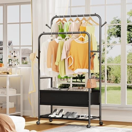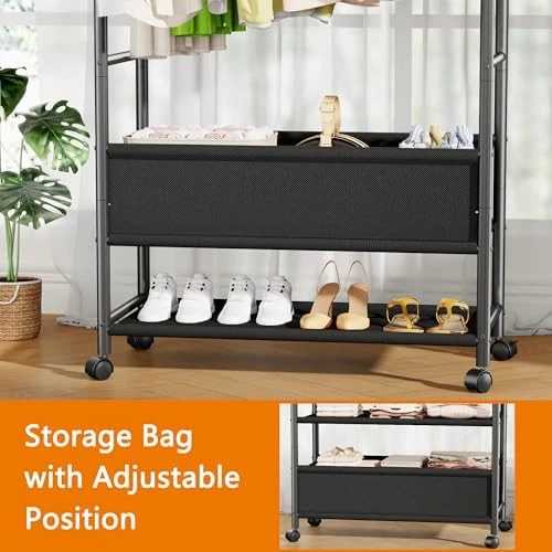 Menu 1. We require immediate payment. 2. We currently accept payment via eBay managed payments only. 3. Once payment is cleared, we will dispatch your shipment within 1-3 business days. Please refer to the "Shipping" tab for more information regarding shipping speed to your destination. Double Rods Clothing Garment Rack with Wheels and Storage Box, Clothing Rack for Hanging Clothes with 4 Hooks, Portable Rolling Closet Wardrobe Organizer for Bedroom, Living Room, Black Product description [Double Storage Space]: The garment rack has 2 hanging rods of different heights. Visual double storage space for easy sorting and putting away of clothes. The small footprint of the product can make full use of vertical space, so say goodbye to the trouble of piling up clothes! [Movable Wheels]: The clothes rack with 4 universal wheels, 2 of which are lockable, you can make it move or stand still as you like, making it easy to move to the yard to dry your clothes, and we also provide 4 adjustable feet to keep your balance even on uneven ground. Meet your diverse needs. [Adjustable Fabric Sotrage Bag]: Adjustable position storage bag underneath the clothes rack, you can place the storage position according to your needs, convenient for you to store folded clothes/shoes/boxes, make your home tidy and orderly. [3-in-1 Multi-functional Design]: 3-in-1 garment rack combines a coat rack, a shoe rack and a cloth rack in one simple and versatile structure, which can be perfectly integrated with bedrooms, living rooms, laundry rooms, entryway ,and can also as a portable closet/wardrobe in clothing shops, rental houses and flats. [Sturdy & Practical]: Clothes racks are made of high quality metal tubes, sturdy and durable, with anti-slip beads on both ends of the double rod to prevent clothes from slipping off. 4 hooks on the side for hanging bags, hats, keys and other items. Side rods can also store belts, scarves, etc. [Easy Assembly, Worry-Free Service]: The clothes rack size: 15.74 "D x 29.52 "W x 67.71 "H, comes with easy to understand instructions and required installation tools for quick assembly. If you have any questions, please feel free to contact us, we will handle it efficiently! PLEASE MESSAGE US IF YOU HAVE ANY OTHER QUESTIONS, AND MANY THANKS FOR READING ALL OF THIS. Copyright ©#. All Rights Reserved.