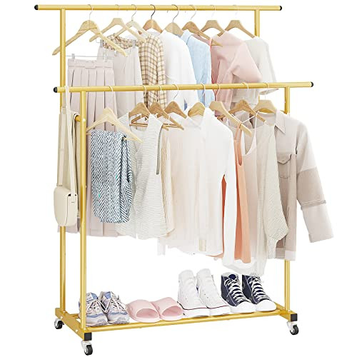 Double Rod Rolling Garment Rack with Wheels for Portable Clothes Storage