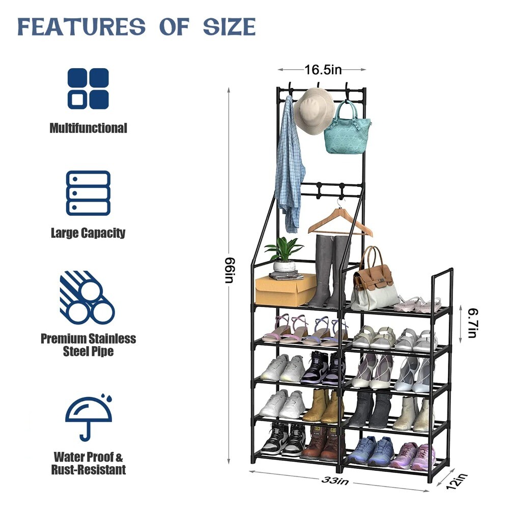 Coat rack with shoe storage:This floor-standing clothes rack uses a unique combination of clothes racks and shoe racks to provide a seamless and efficient storage solution for your clothes, hats and shoes. The integrated design simplifies your storage needs and enhances the organization of the space. Entryway furniture:This foyer tree storage system comes with a 2-layer clothes rack (with 6 hooks) and a 5-layer shoe cabinet, which is perfect for daily storage at the entrance. Entryway shoe storage:The double-row single-hanging clothes rack has a unique double-row layout and single-hanging design, providing ample storage space for convenient organization of clothes, shoes and hats. It is a practical storage tool for the entrance and cloakroom. Shoe and coat rack:It has multiple functions. In addition to storing shoes and hanging coats, it can also hang scarves, keys, hats, shoulder bags, and even a few books and bonsai, making the narrow space play an important role. On Apr 8, 2025 at 19:49:17 PDT, seller added the following information: